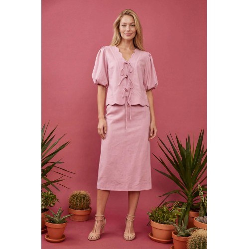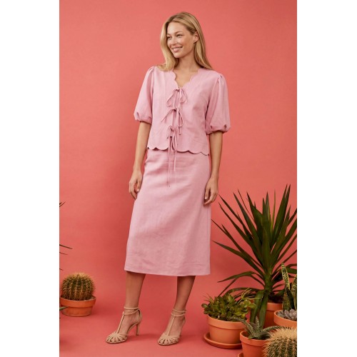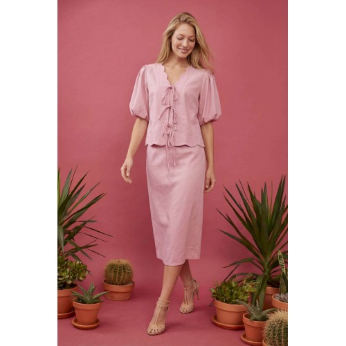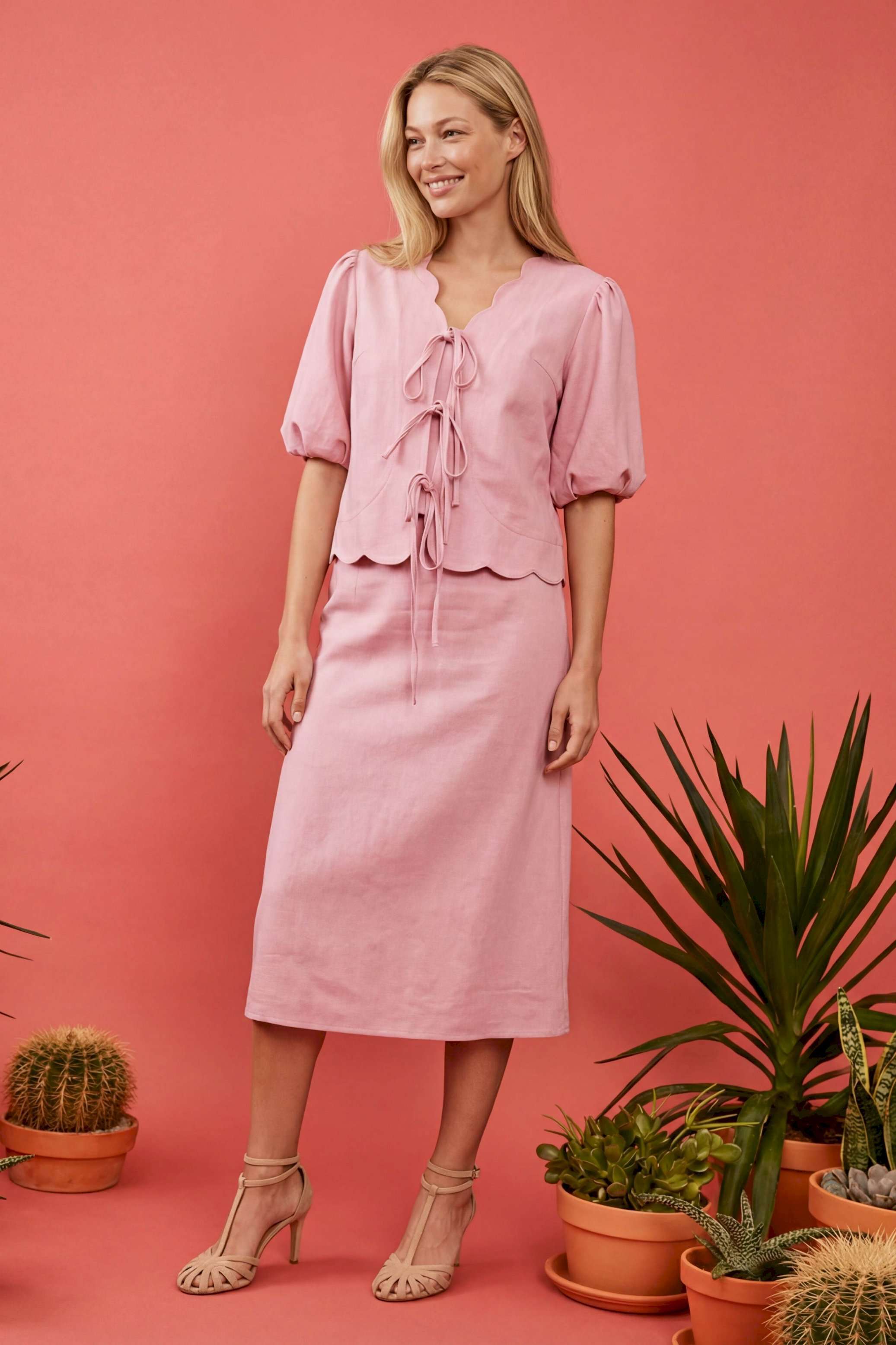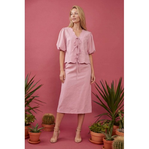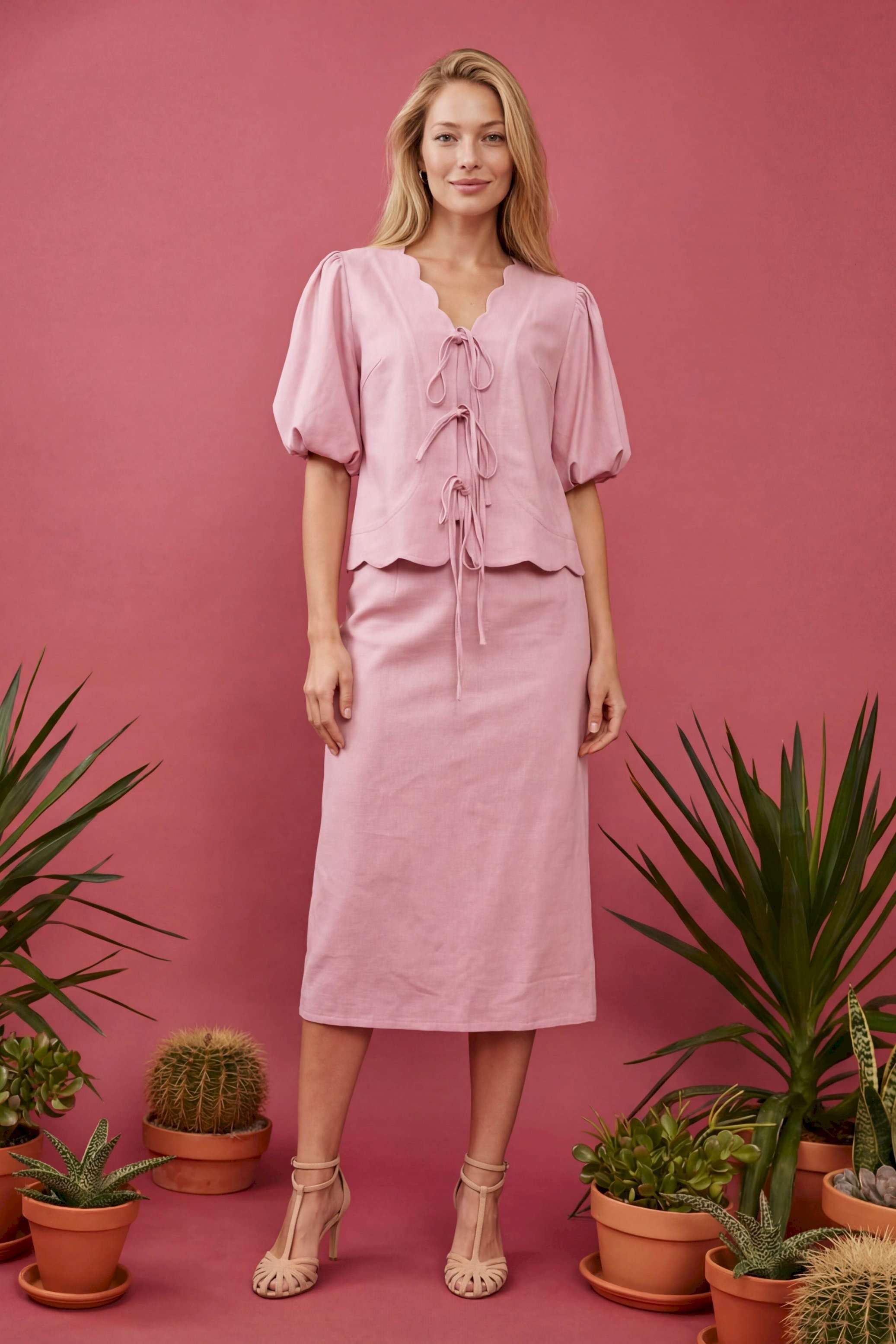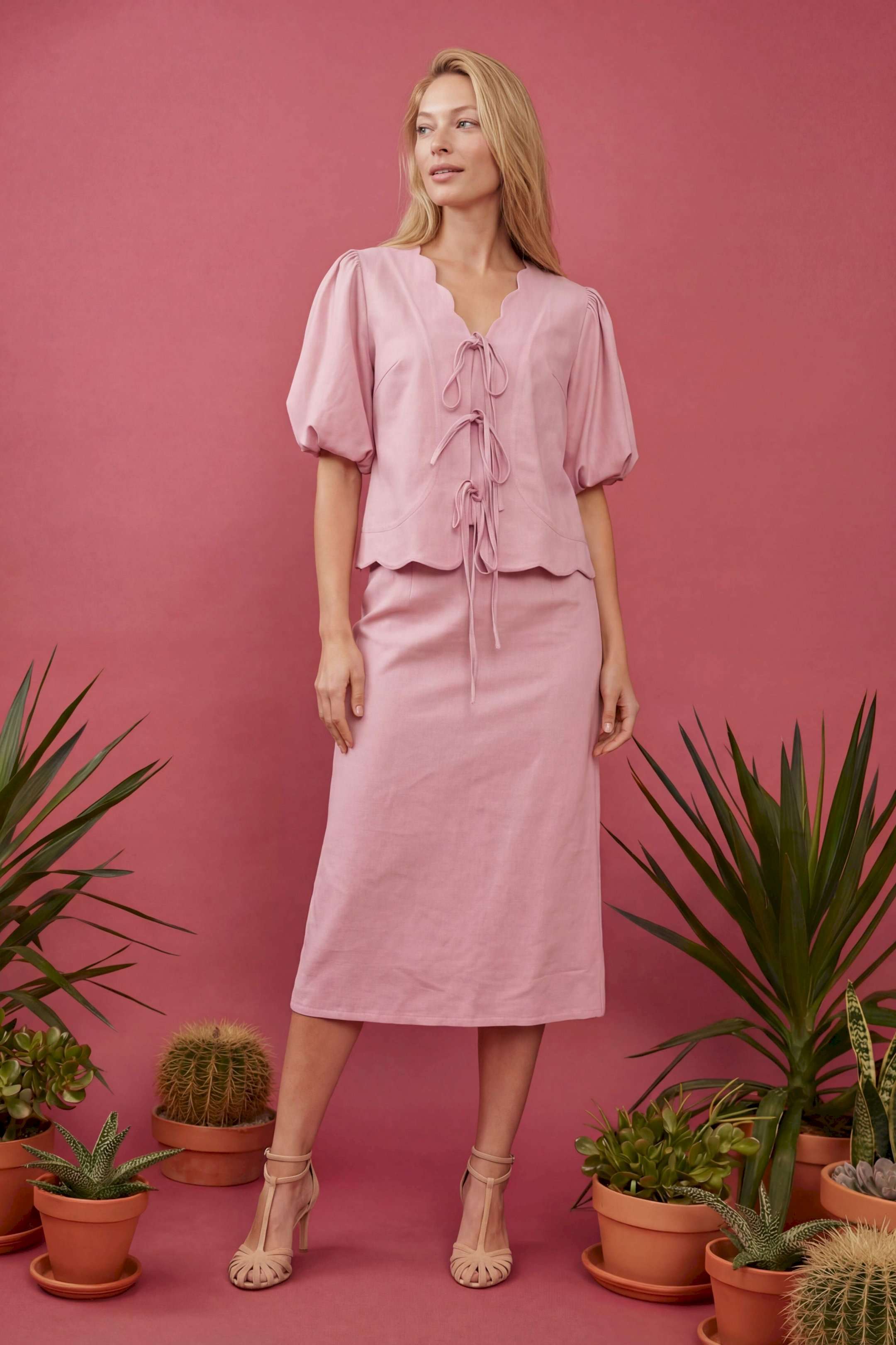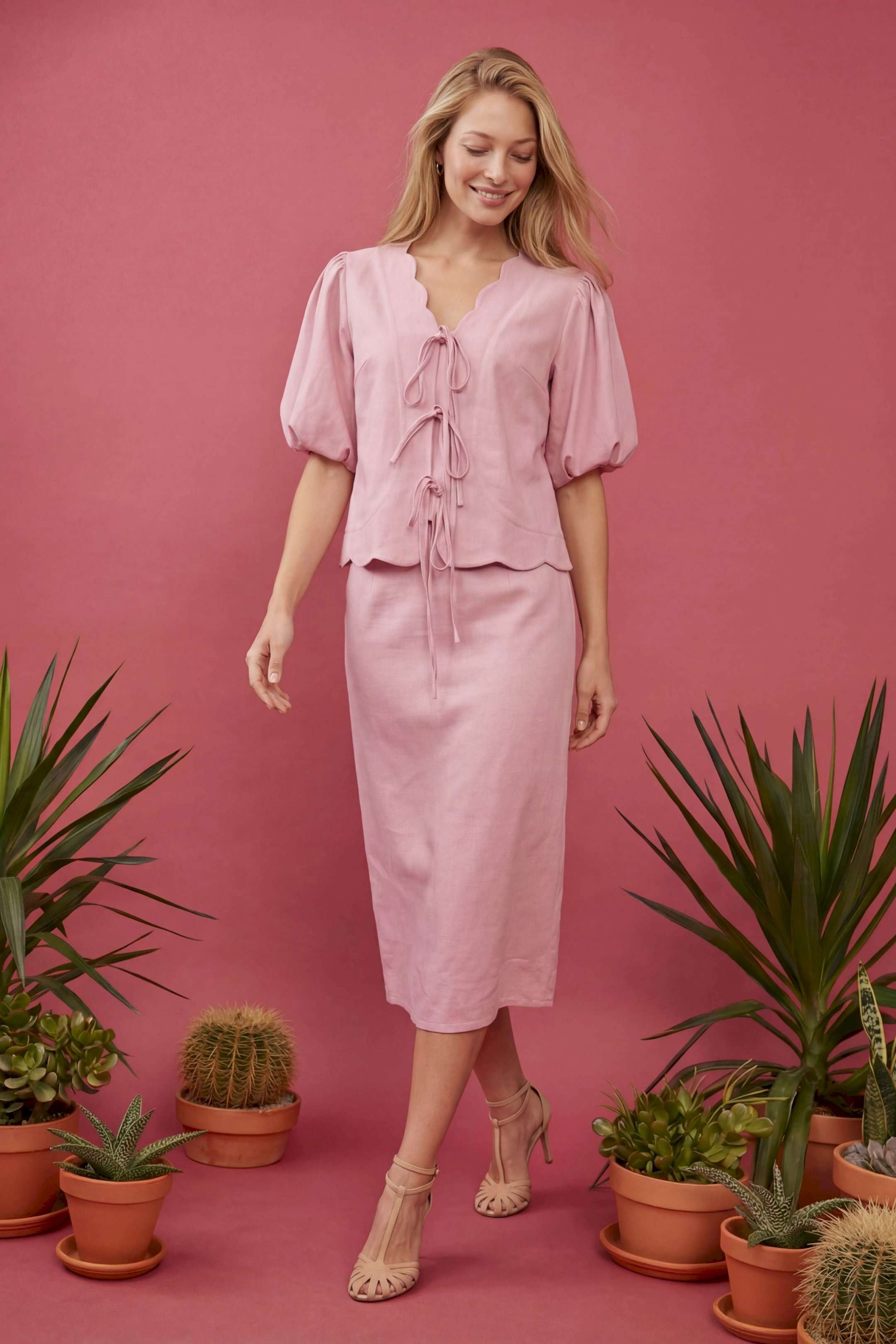 Женский костюм-двойка в романтическом стиле, состоящий из жакета полуприлегающего силуэта и юбки А-силуэта в длине миди. Изделие выполнено из льняной ткани, обладающей умеренной плотностью и формоустойчивостью. Рукав втачной на хлопковой подкладке, объемной формы «фонарик» длиной до локтя. По окату и по низу рукава заложены мягкие сборки. V-образный вырез горловины. Край борта и горловины имеет декоративный фигурный волнообразный край. Застежка центральная на три пары функциональных завязок из основной ткани, расположенных по линии груди и талии. По переду нагрудные вытачки выходят из бокового шва для обеспечения посадки по фигуре. Линия низа фигурная волнообразная, повторяющая дизайн горловины, по спинке средний шов. Юбка А-силуэта, чуть расширенная к низу. По талии притачной пояс и посадка на естественной линии талии. Застёжка на потайную молнию. Жакет: Длина по спинке: 59 см, от 52 размера 64 см Длина рукава: 24 см ОГ: 100-104-108-112-116-120-124 см (размер 44-46-48-50-52-54-56) ОТ: 98-102-106-110-114-118-122 см (размер 44-46-48-50-52-54-56) Юбка: ОТ: 74-78-82-90-98-106-114 см (размер 44-46-48-50-52-54-56) ОБ: 97-101-105-113-121-129-137 см (размер 44-46-48-50-52-54-56) Длина с учетом пояса: 84,5 см