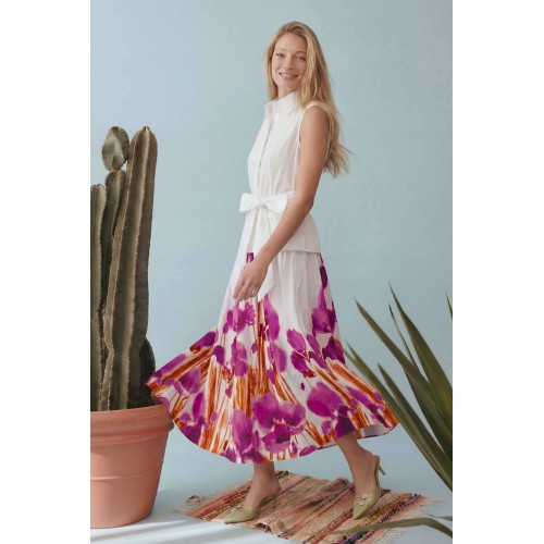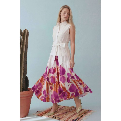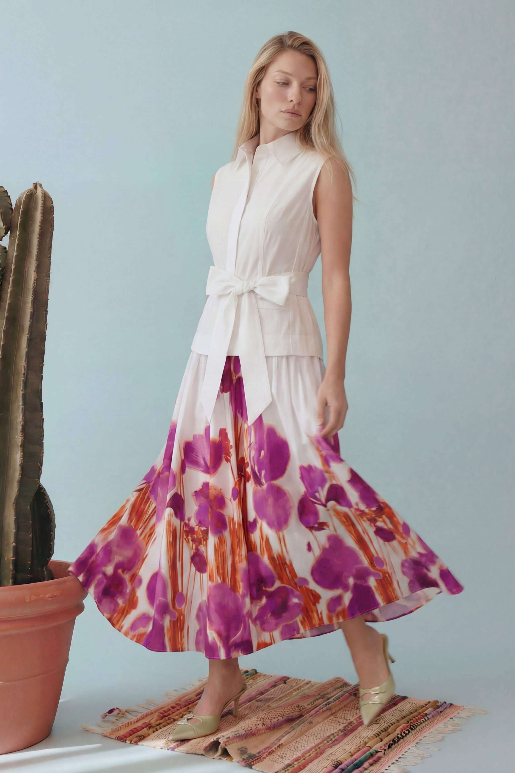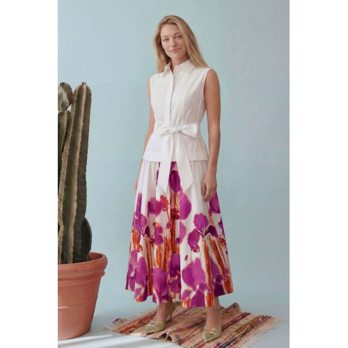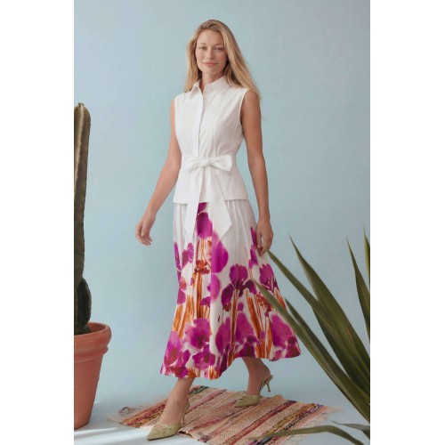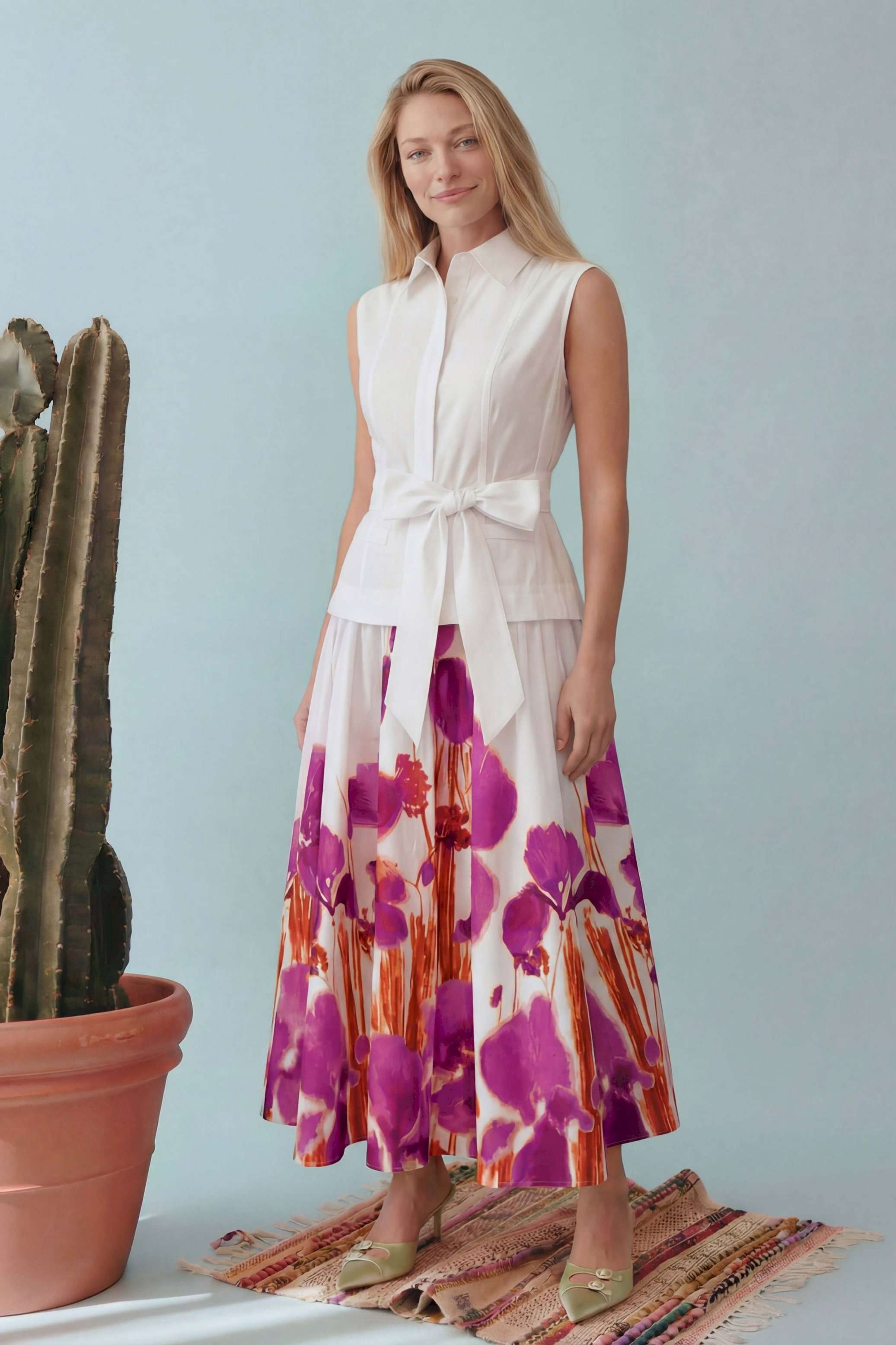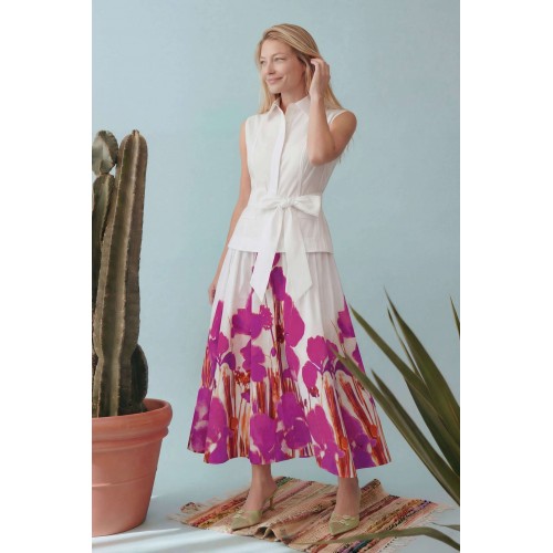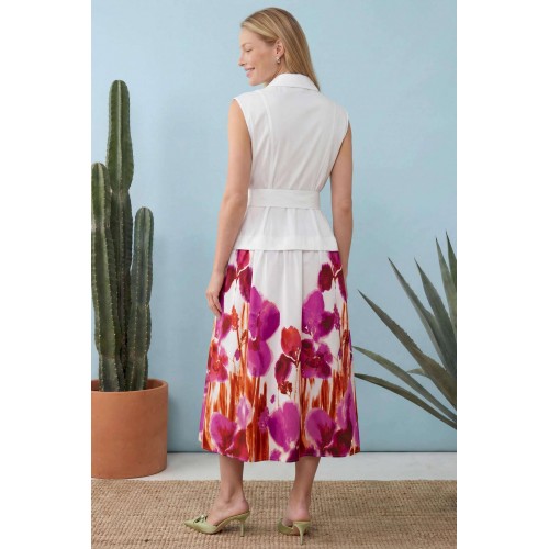 Платье с имитацией блузы и юбки выполнено из плотного хлопкового поплина с небольшим добавлением эластана для улучшения посадки. Блуза в платье до середины бедра, по переду рельефы выходят из проймы и уходят в линию низа блузы, по бокам не функциональные карманы-листочки. Линия плеча естественная, косая, без рукавов. Воротник стояче-отложной с острыми концами, рубашечного типа на отрезной стойке. Застежка центральная на петли и пуговицы. Юбка в платье со сборкой пришита к низу блузы платья. В боковых швах функциональные карманы. По спинке средний шов и вертикальные рельефы, по юбке купонный принт. Крупный флоральный рисунок расположен по нижней части изделия, плавно переходя в белый фон к линии талии. Главным декоративным элементом является художественный принт на юбке и широкий пояс из основной ткани, завязанный на пышный бант, эффектно подчеркивающий талию. Длина (по центру спинки от основания горловины): 135см ОГ: 92-96-100-104-108 см (размер 42-44-46-48-50) ОТ: 86-90-94-98-102 см (размер 42-44-46-48-50) ОБ: 106-110-114-118-122 (размер 42-44-46-48-50)