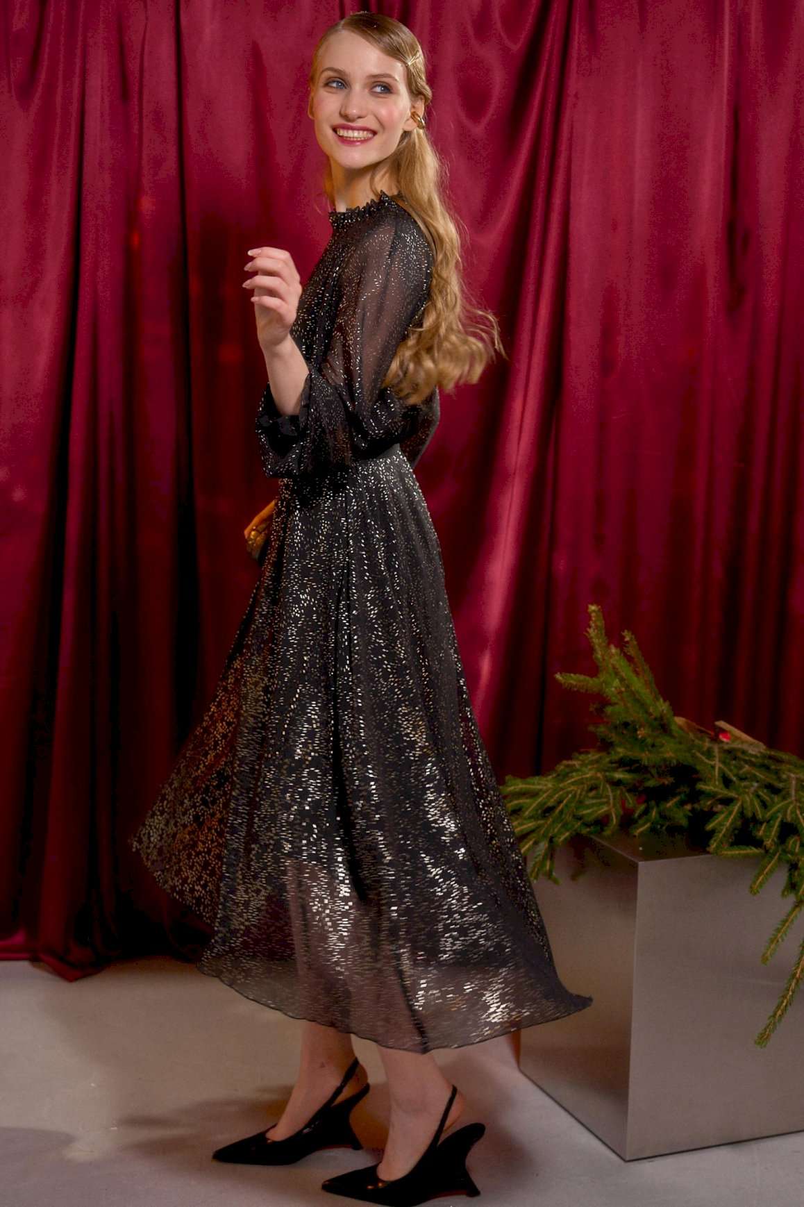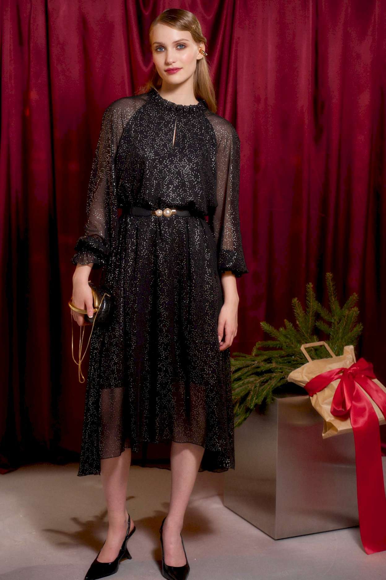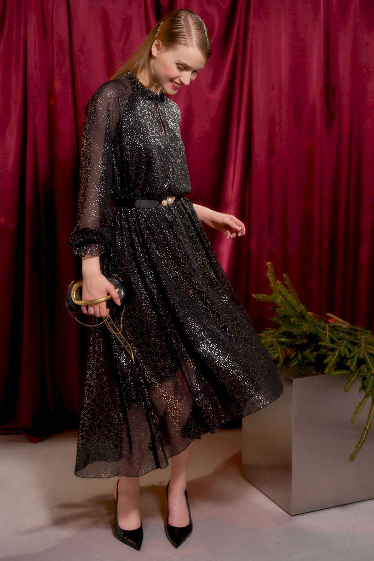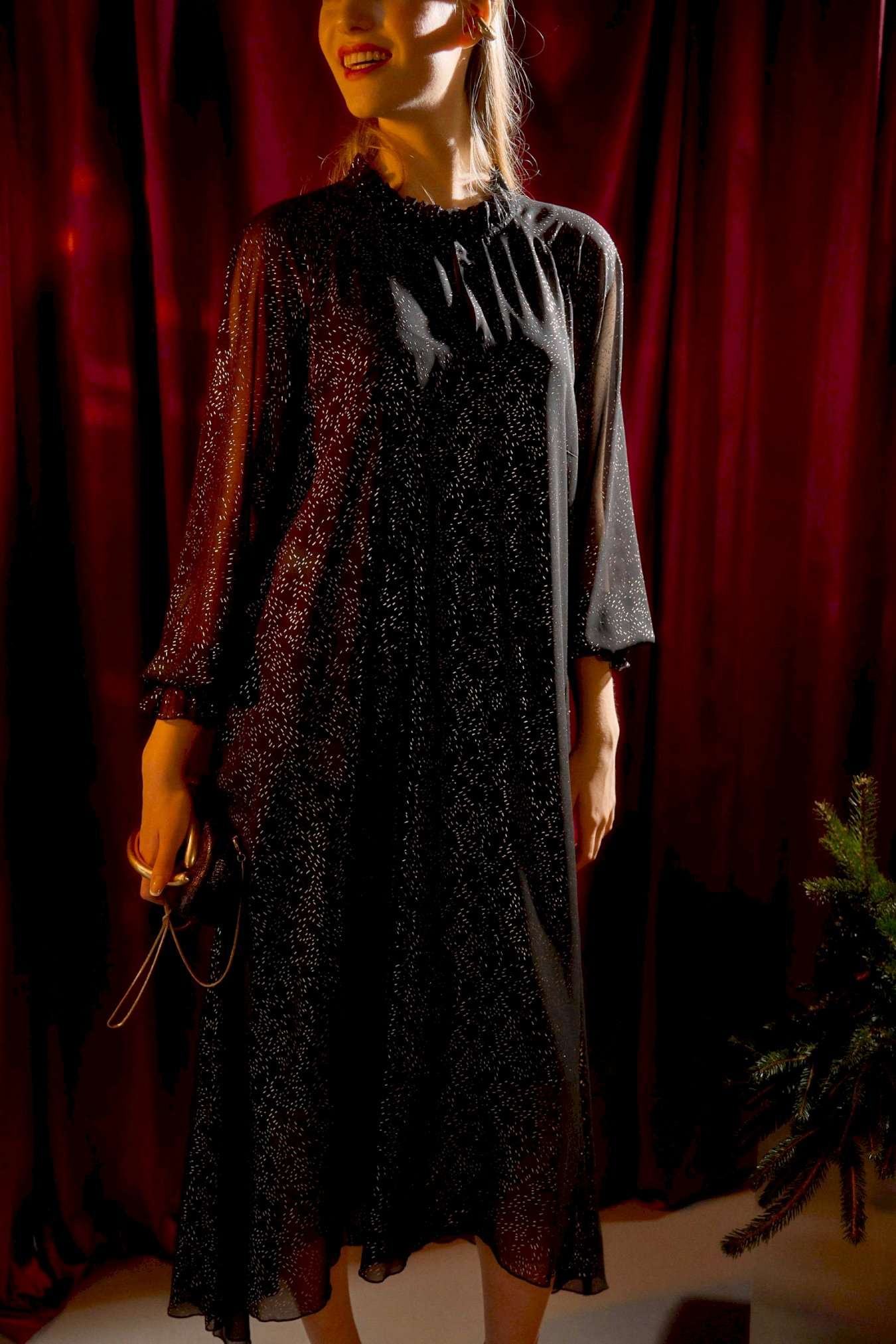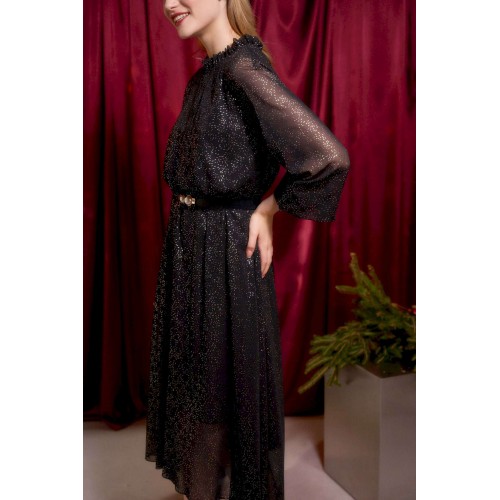 Платье длины миди А-силуэта выполнено из шифона, по переду и спинке на подкладке. Широкий длинный рукав-реглан. По низу рукава прошита резинка в несколько рядов. Горловина с невысокой стойкой на сборку. По переду средний шов, у основания шеи переходящий в застёжку на навесной крючок. Низ платья ассиметричный. Пояс входит в комплектацию. Платье: Длина платья по спинке от высшей точки горловины: 130 см Длина рукава: 72 см ОГ: 104-108-112-116 см (размер 46-48-50-52).