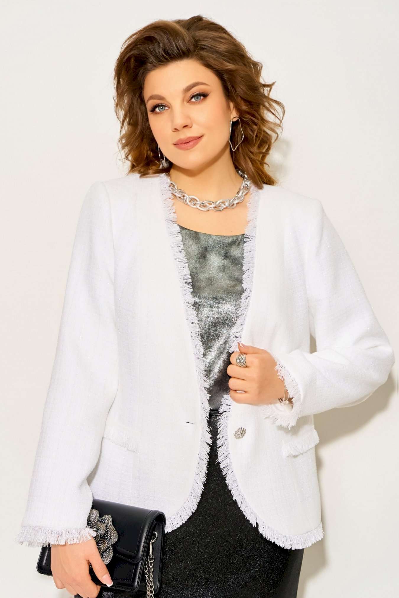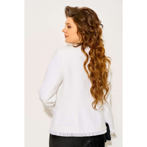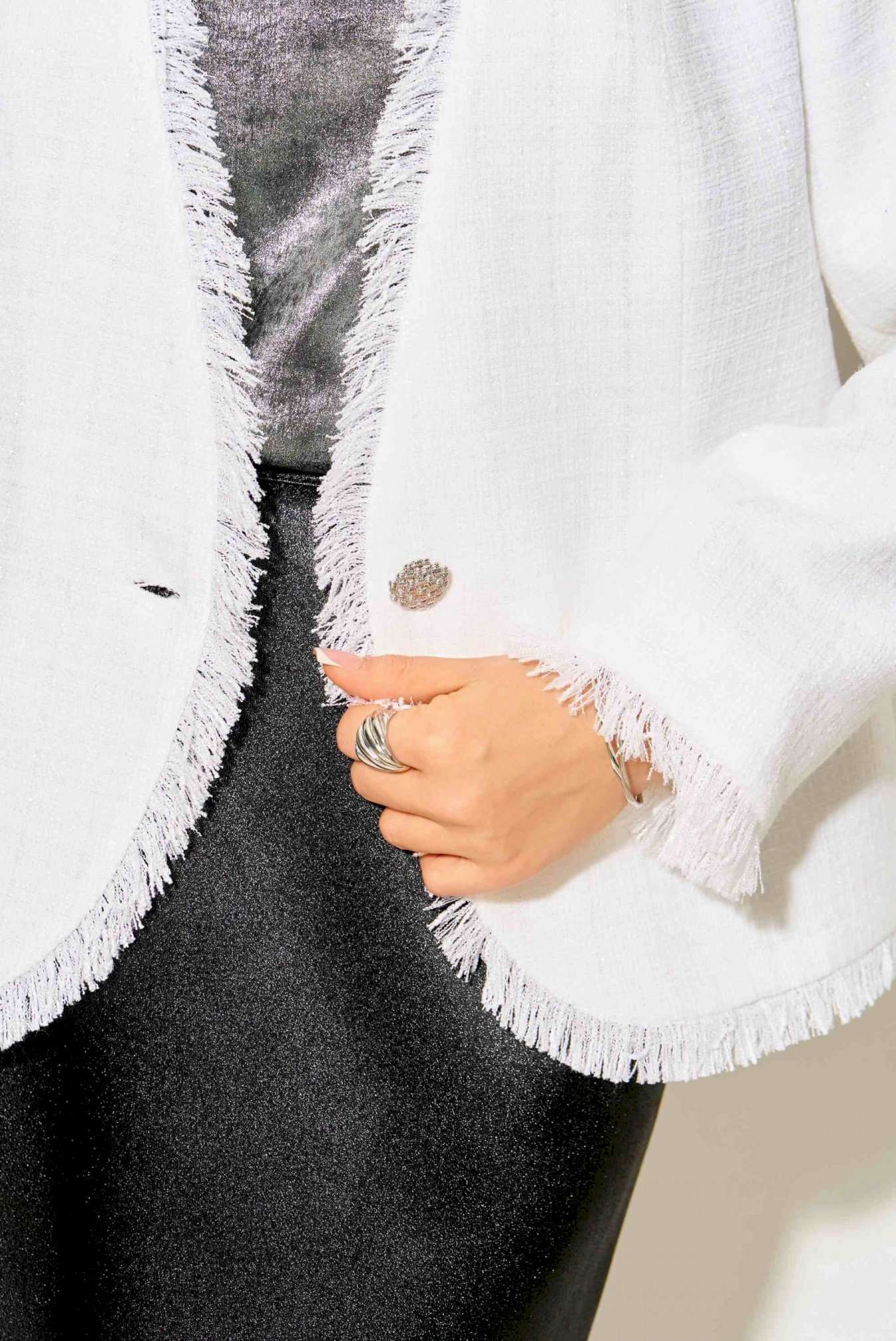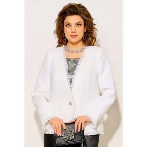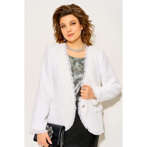 Нарядный жакет ""Яника"" — твидовая классика с изюминкой. Элегантный жакет полуприлегающего силуэта выполнен из твидовой ткани с флоковой нитью, жакет на подкладке. Однобортная застёжка на пуговицу, рельефные линии по полочке и спинке подчёркивают фигуру. Декоративная трепка по краю борта, низу изделия и рукавам добавляет фактурности и оригинальности. Карман-обманка в виде настроченной трепки — стильный акцент, придающий образу индивидуальность. Идеален для деловых встреч, торжественных мероприятий и стильных повседневных образов.