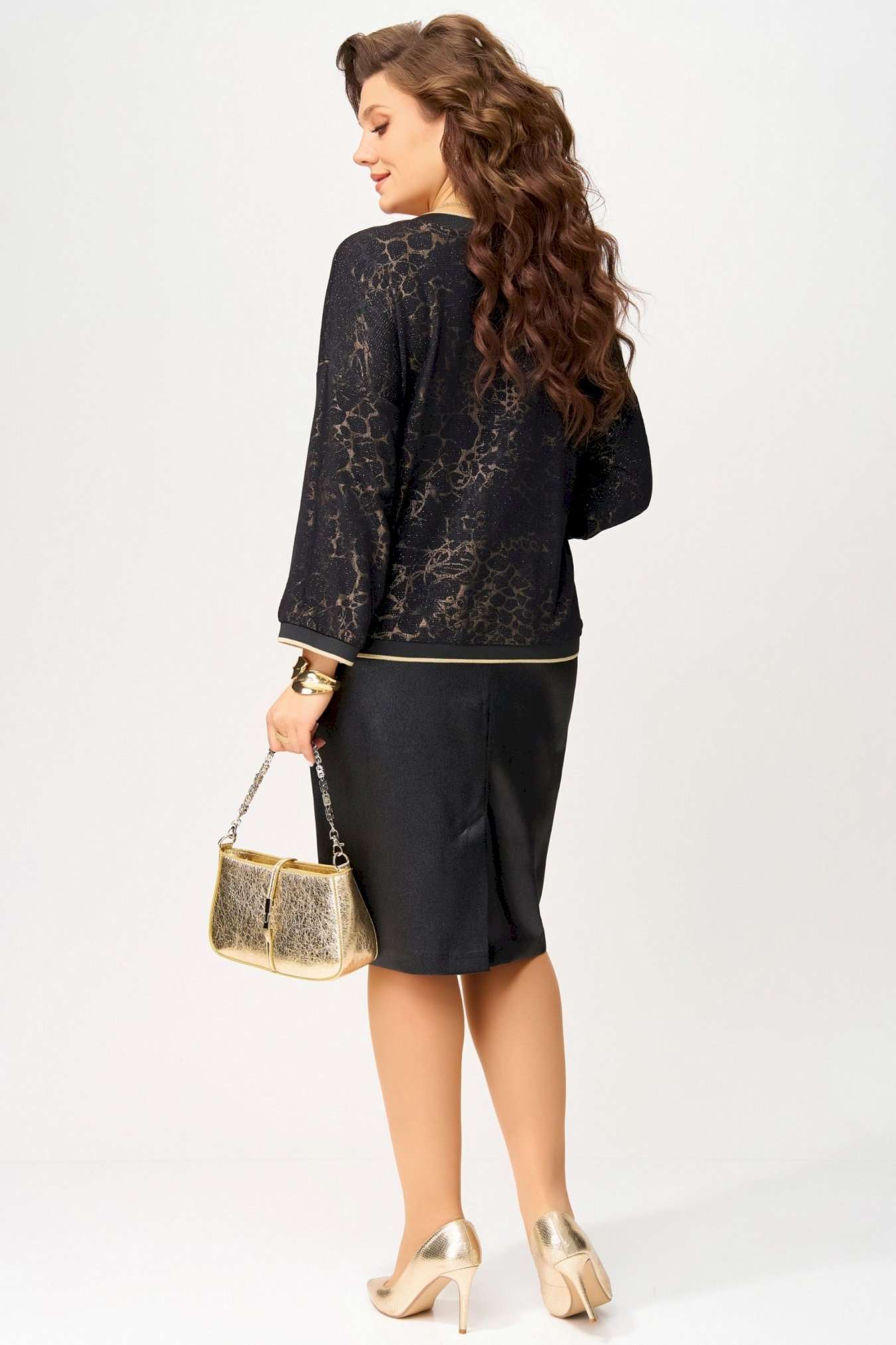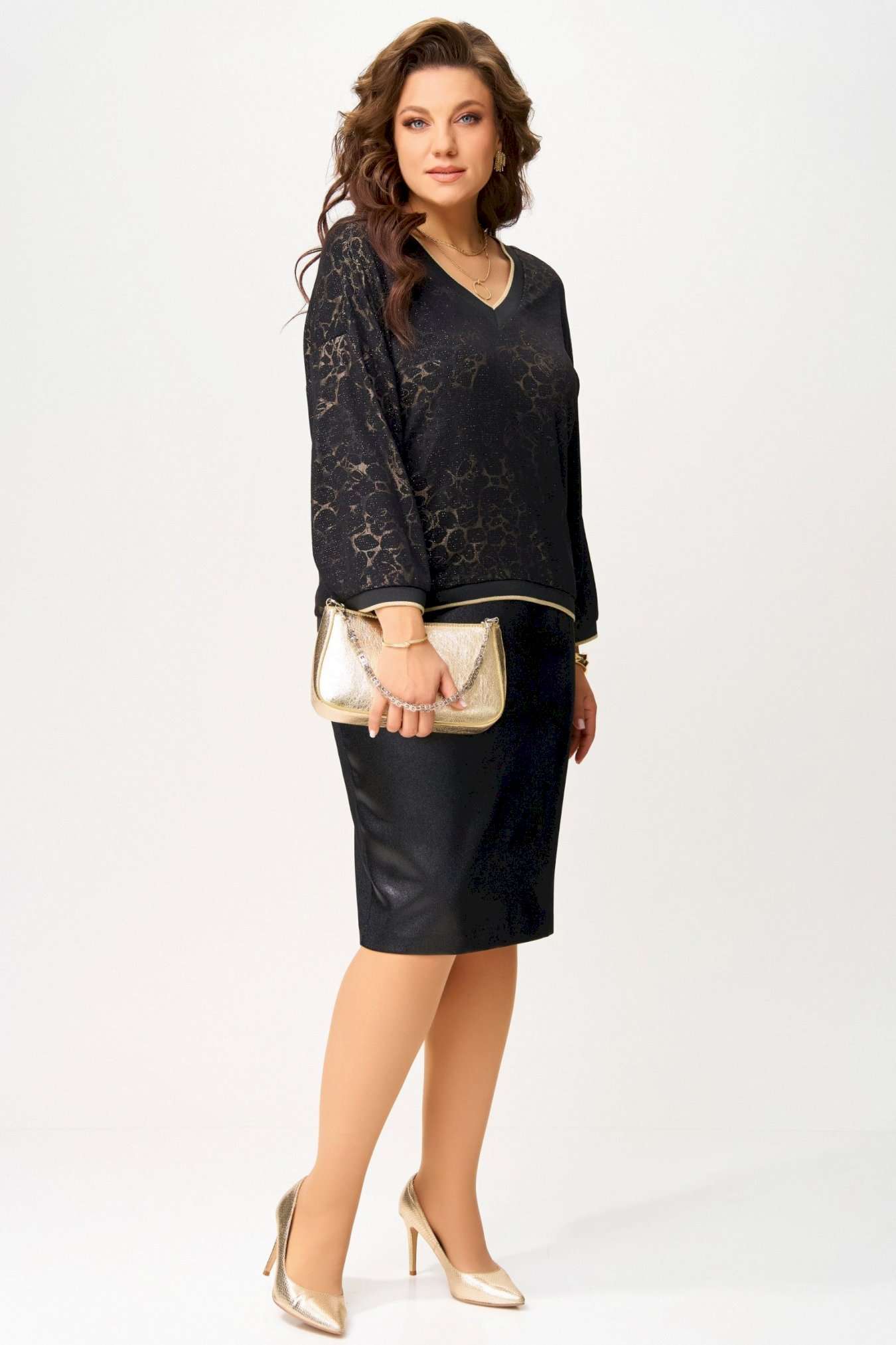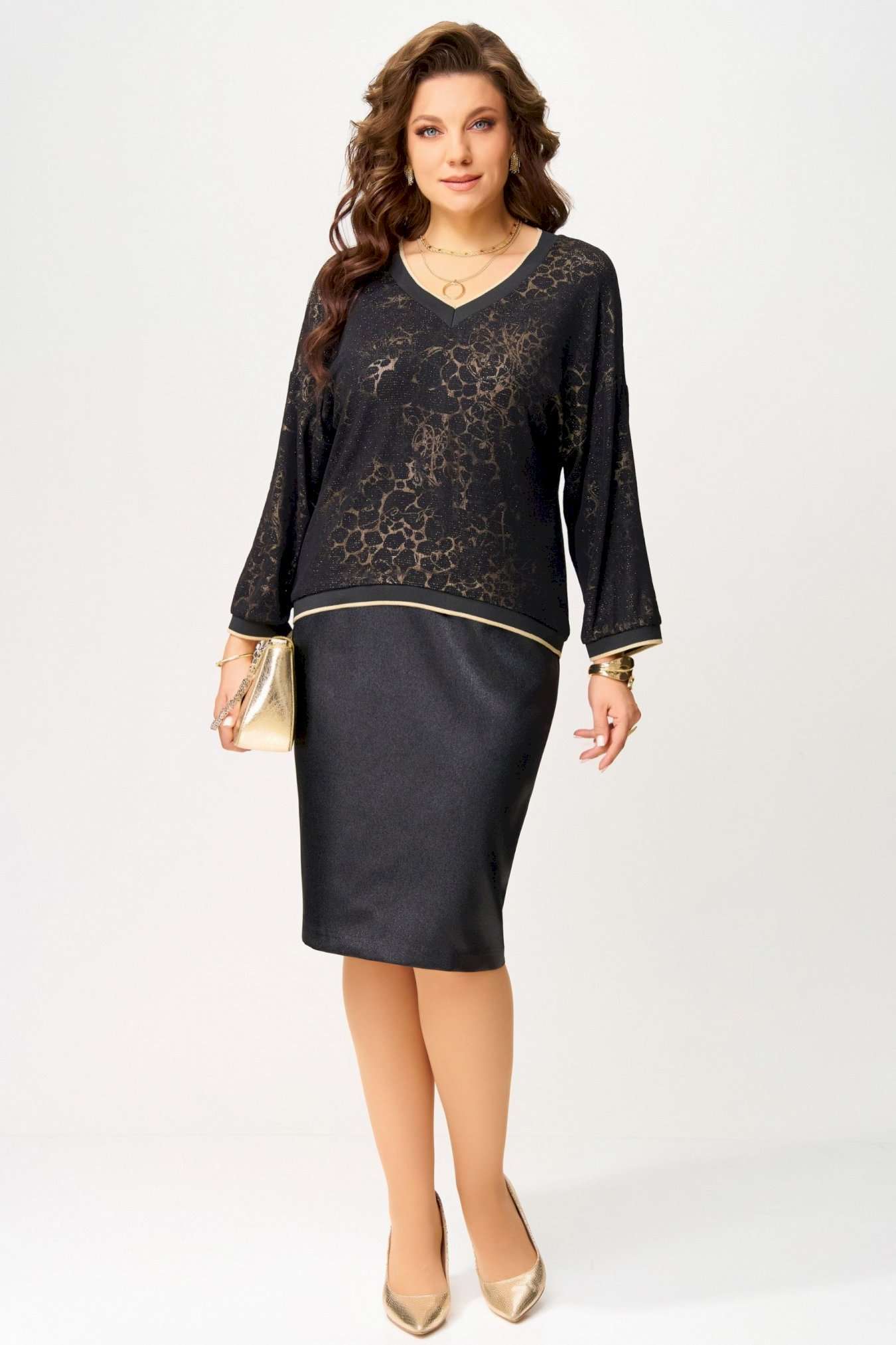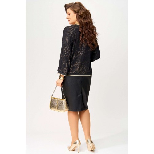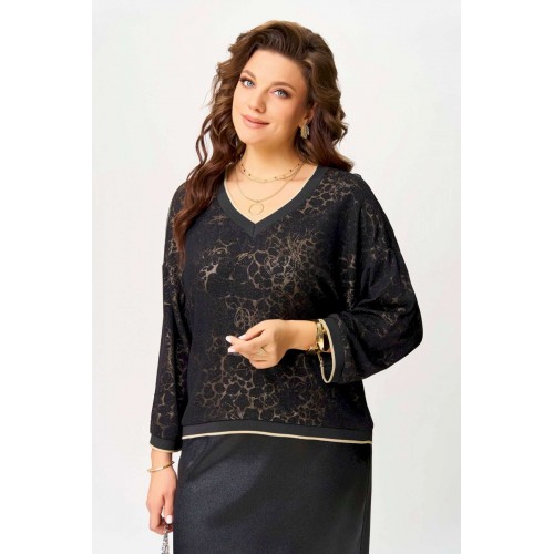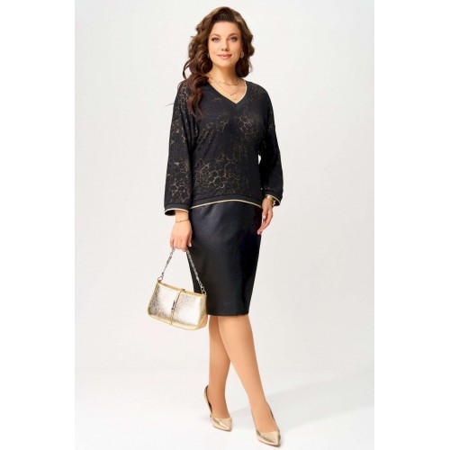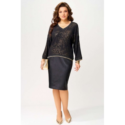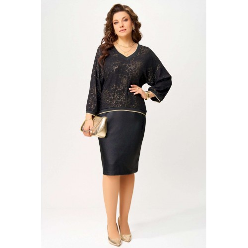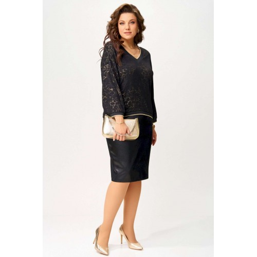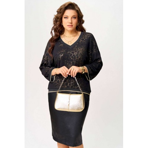 Нарядный женский комплект \"\"Ираида\"\" состоит из трикотажного джемпера с сеткой и юбки из текстильной сатиновой ткани. Джемпер нарядный выполнен из трикотажного полотна с добавлением сетки сверху. Джемпер свободного покроя со спущенным рукавом, горловина v-образная, обработана довязом, низ изделия и рукавов обработан довязом. Юбка выполнена из текстильной ткани, зауженная к низу. Пояс притачной, по бокам резинка. По спинке шлица и застёжка на потайную молнию и пуговицу. Низ юбки обработан швом в подгибку с открытым срезом. Нарядный комплект можно носить раздельно и вместе.