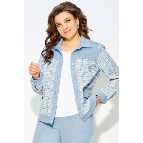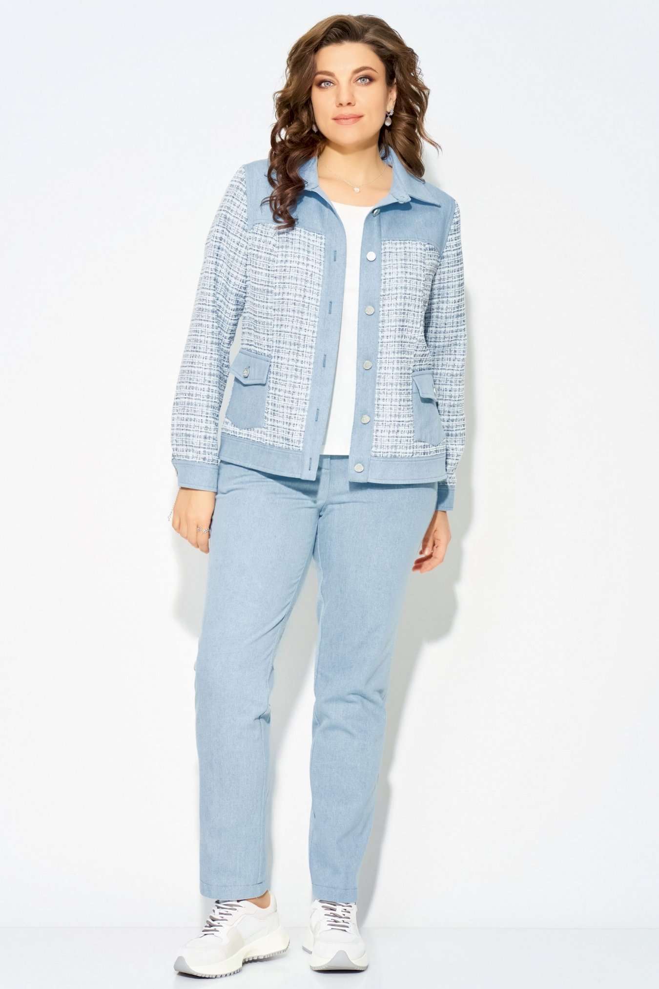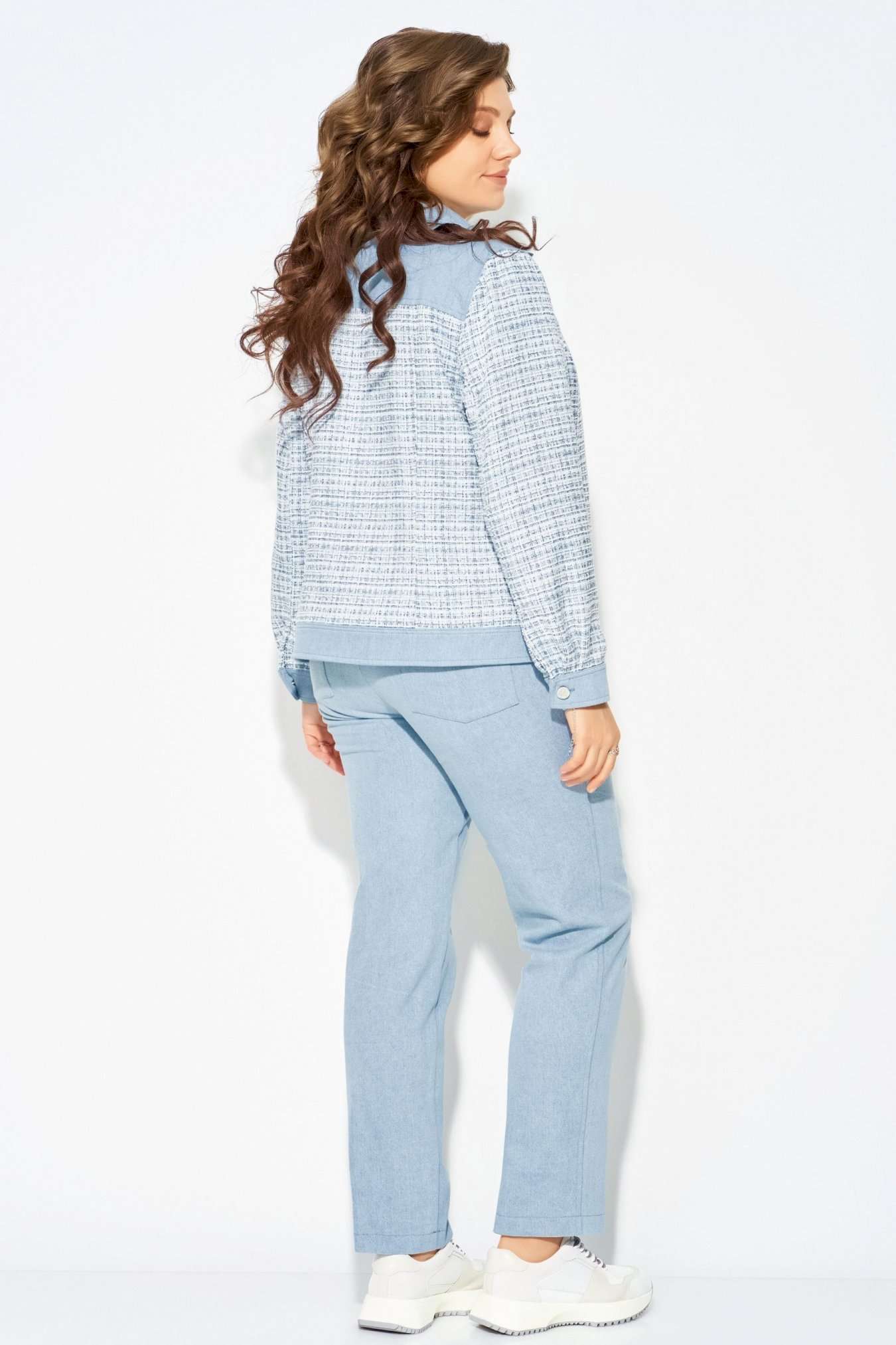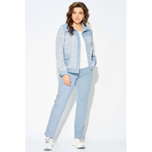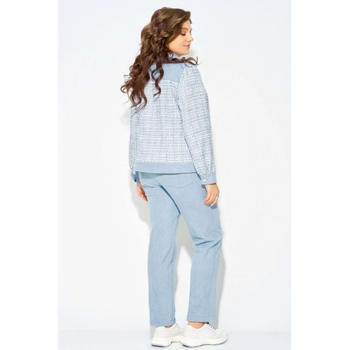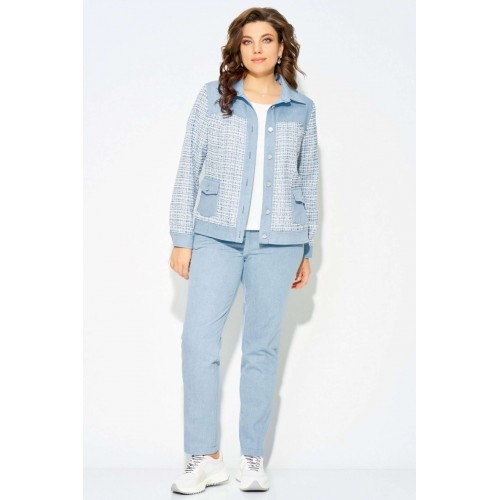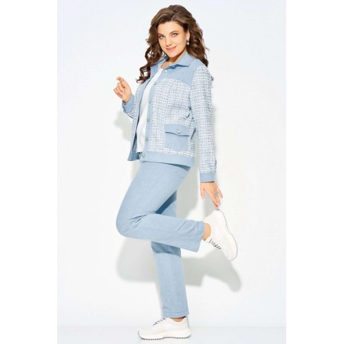 Комплект \"\"Деяна\"\" состоит из бомбера и джинсов. Бомбер полуприлегающего кроя изготовлен из сочетания хлопковой джинсовой и твидовой тканей, без подкладки. Его однобортная застежка выполнена на петли и пуговицы, а планка борта отделана декоративными строчками. На передней части изделия расположены кокетка и рельефные швы, а также накладные карманы с клапанами, закрывающиеся на петли с пуговицами. Сзади также присутствует кокетка и рельефы. Рукава имеют втачной двухшовный покрой и оснащены манжетами с застежкой на пуговицы и петли. Воротник рубашечного типа с отложной стойкой, низ бомбера дополнен отрезным поясом с декоративной прострочкой. На кокетке переда, с левой стороны, расположена стильная нашивка. Джинсы представляют собой зауженные к низу брюки со средней посадкой. Они оснащены застежкой на молнию и пуговицы, а также карманом в боковом шве. Сзади пояс дополнен резинкой для удобной посадки. Этот стильный и молодежный комплект \"\"Деяна\"\" прекрасно подходит как для ношения в комплекте, так и в качестве отдельных элементов для создания разнообразных образов.