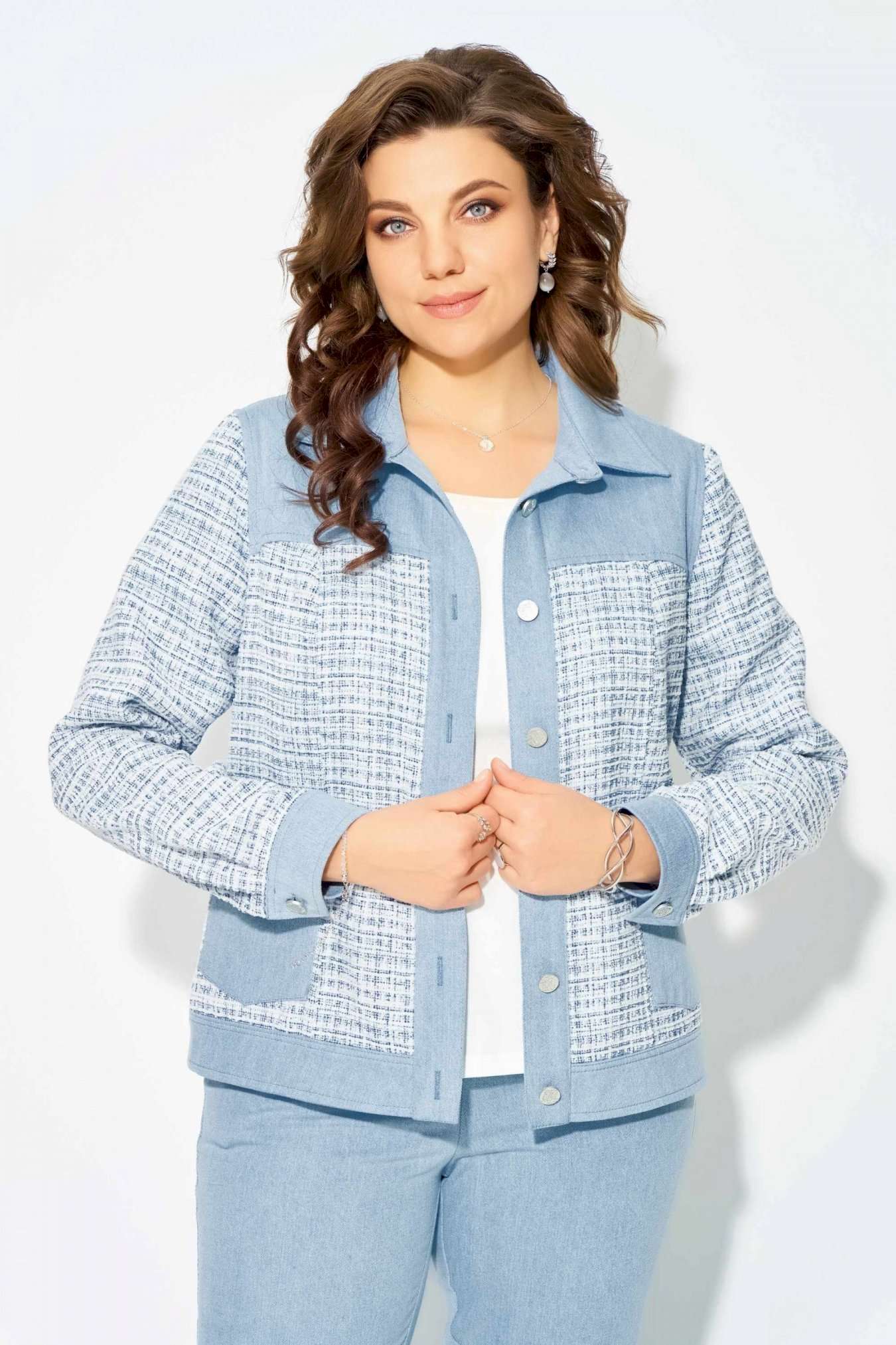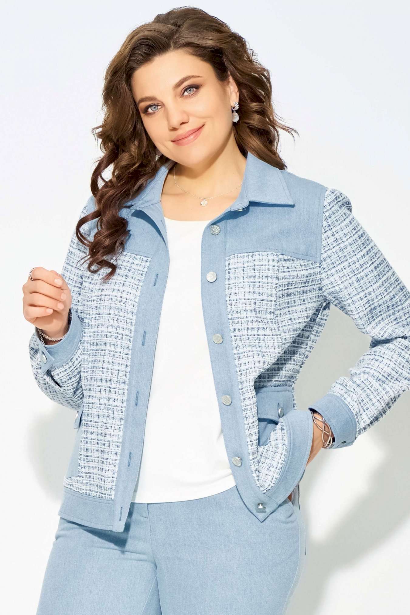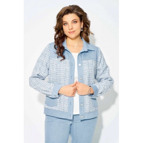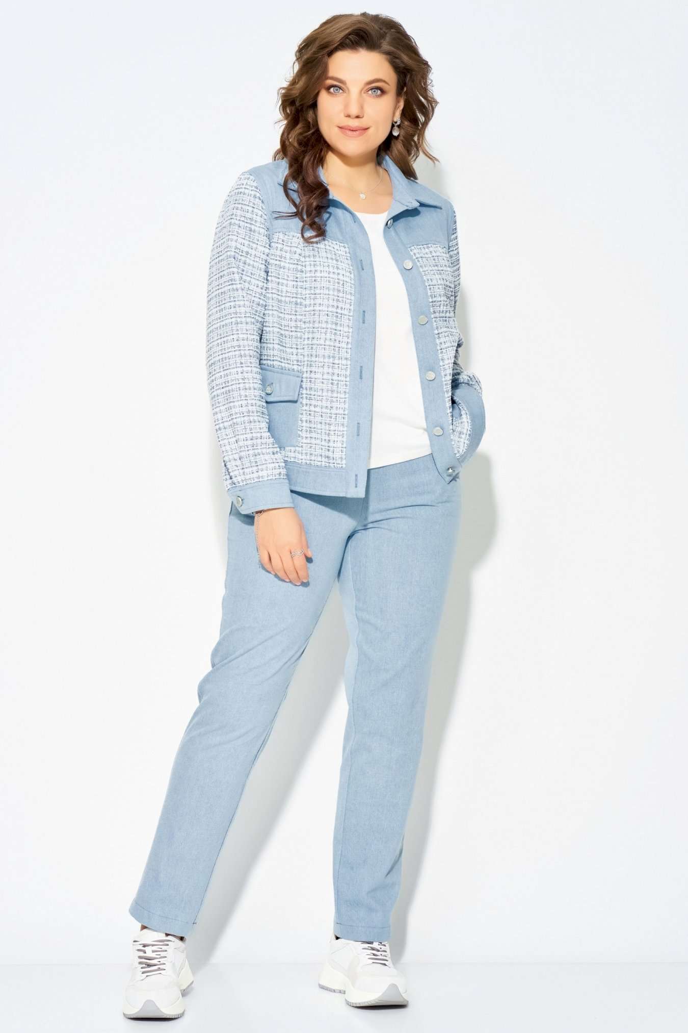 Комплект \"\"Деяна\"\" состоит из бомбера и джинсов. Бомбер полуприлегающего кроя изготовлен из сочетания хлопковой джинсовой и твидовой тканей, без подкладки. Его однобортная застежка выполнена на петли и пуговицы, а планка борта отделана декоративными строчками. На передней части изделия расположены кокетка и рельефные швы, а также накладные карманы с клапанами, закрывающиеся на петли с пуговицами. Сзади также присутствует кокетка и рельефы. Рукава имеют втачной двухшовный покрой и оснащены манжетами с застежкой на пуговицы и петли. Воротник рубашечного типа с отложной стойкой, низ бомбера дополнен отрезным поясом с декоративной прострочкой. На кокетке переда, с левой стороны, расположена стильная нашивка. Джинсы представляют собой зауженные к низу брюки со средней посадкой. Они оснащены застежкой на молнию и пуговицы, а также карманом в боковом шве. Сзади пояс дополнен резинкой для удобной посадки. Этот стильный и молодежный комплект \"\"Деяна\"\" прекрасно подходит как для ношения в комплекте, так и в качестве отдельных элементов для создания разнообразных образов.