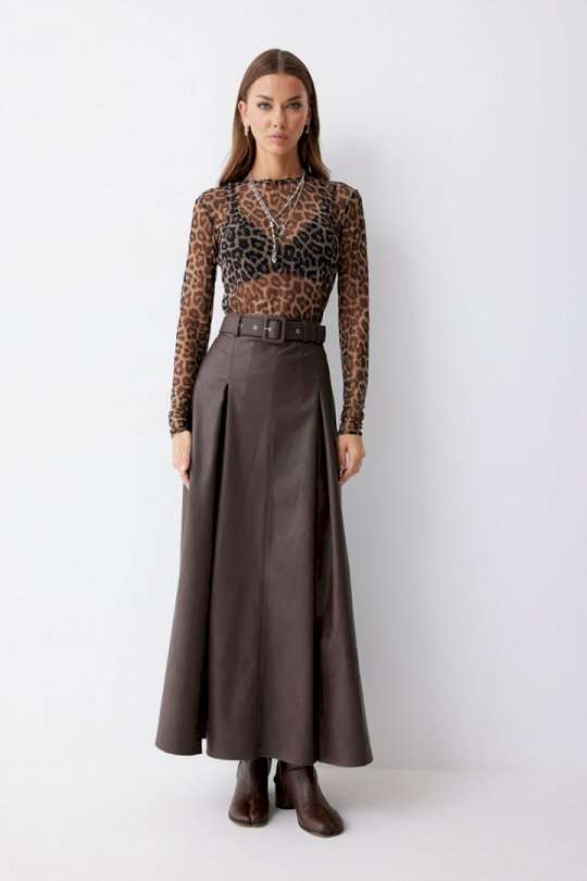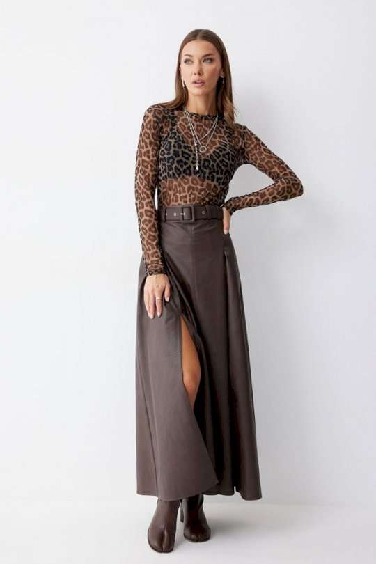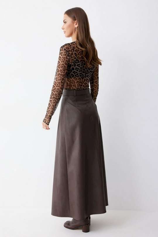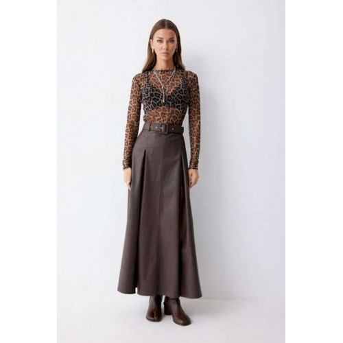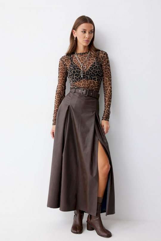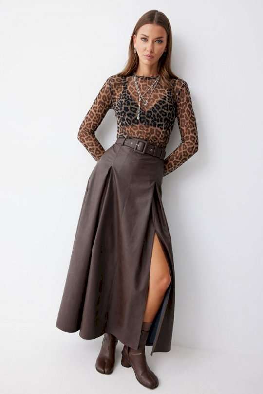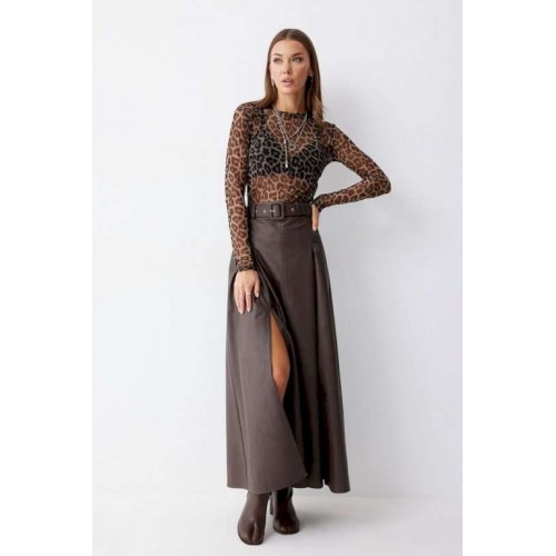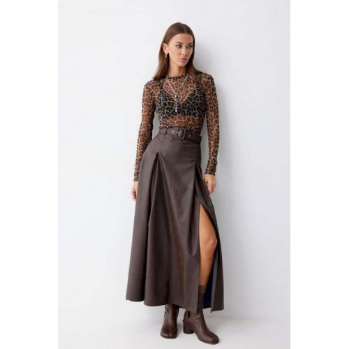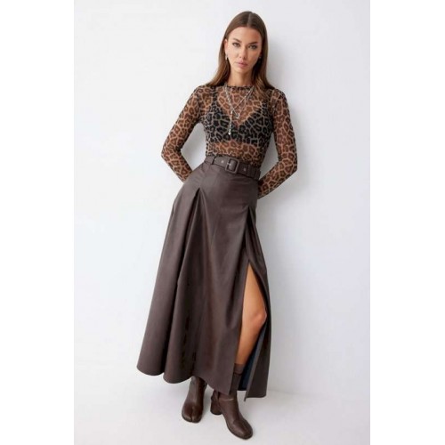 Стильная юбка А-силуэта из экокожи , длины макси. По верху юбки притачной пояс с шлевками для ремня. На передних половинках расположены вытачки со встречной складкой и разрезами по низу. На задних половинках расположены талиевые вытачки. На спинке по центру потайная молния. В комплект входит ремень. Подходит на рост 164-170 см. Длина юбки: 99 см + 4,5 см пояс.