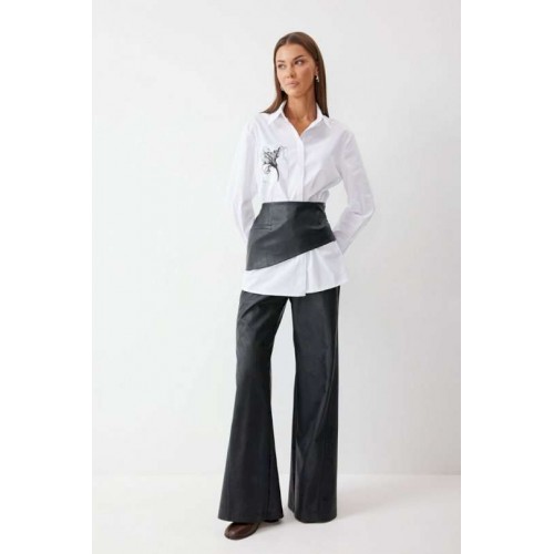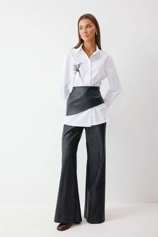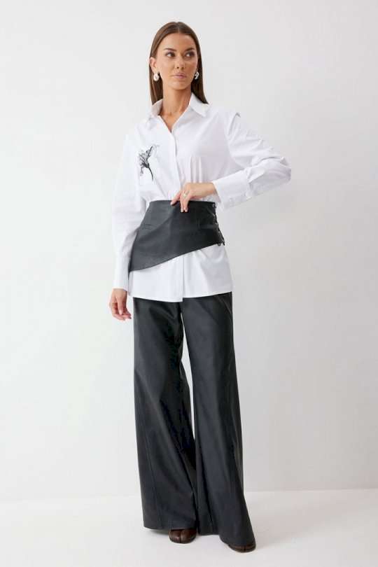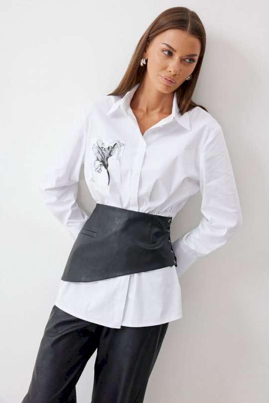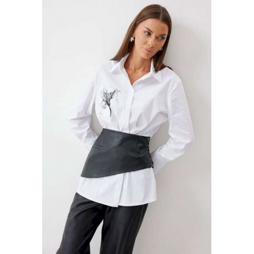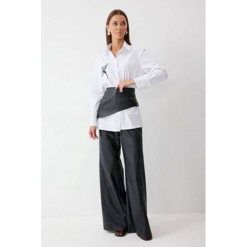 Блузка полуприлегающего силуэта. На уровне талии расположена кулиска с и завязками для регулирования степени прилегания. По центру супатная застежка, воротник рубашечный стояче-отложной. В верхней части полочки расположен накладной карман с дизайнерской печатью. Рукав втачной. Блузку дополняет съёмная деталь в виде баски из эко кожи, с шнуровкой в боковом шве. Подходит на рост 164-170 см. Длина блузы (в 44-48 р. – 71см) (в 50 -54 р. – 73см). Длина рукава (в 44-48 р. – 58 см) (в 50 -54 р. – 57см).