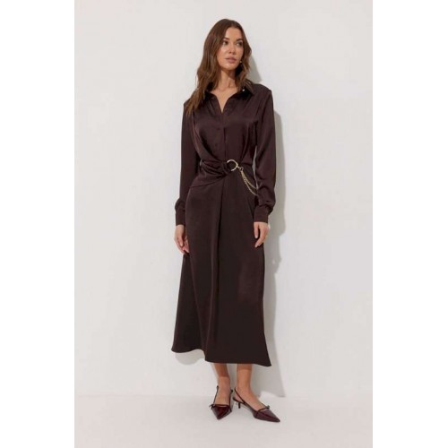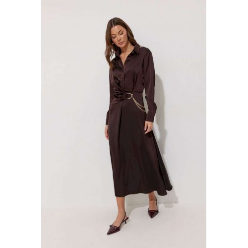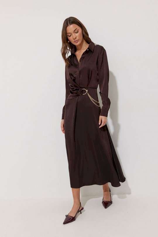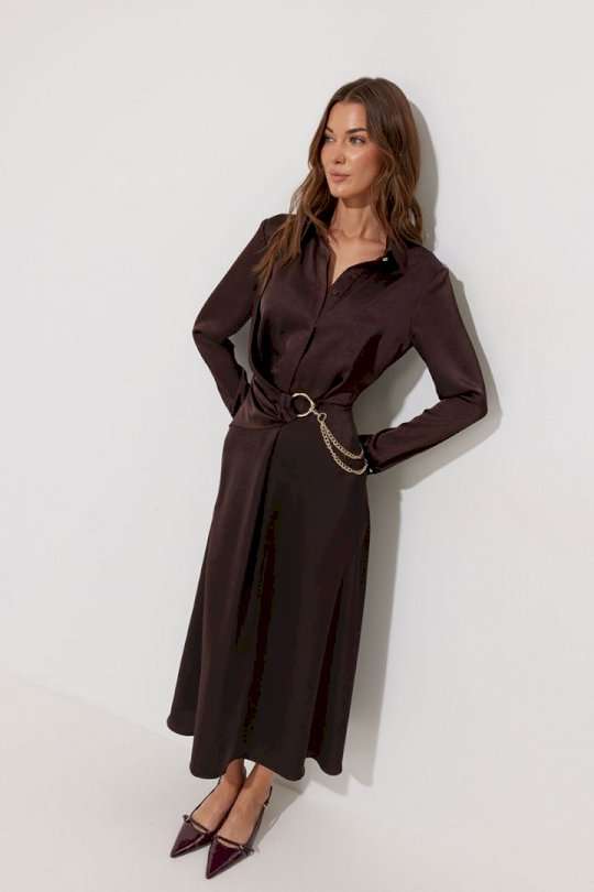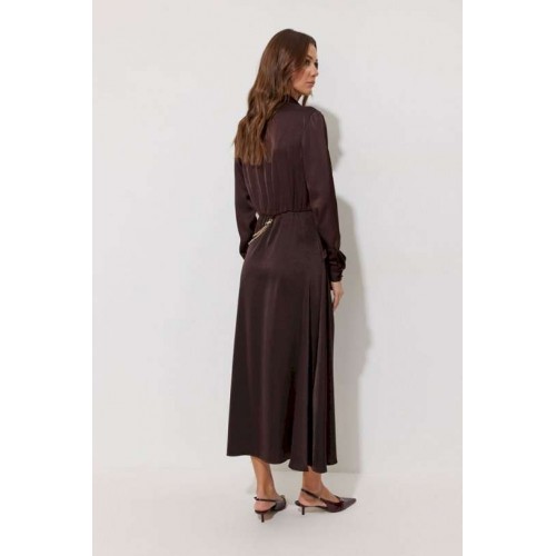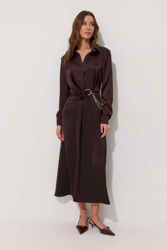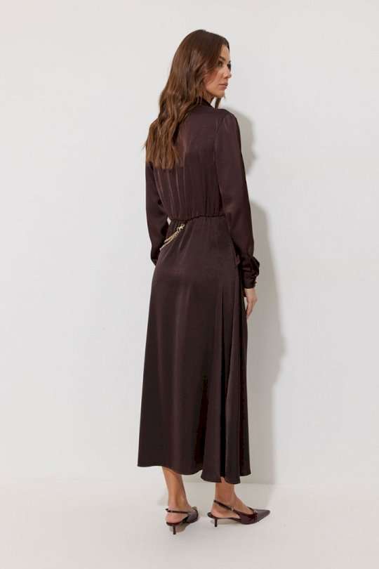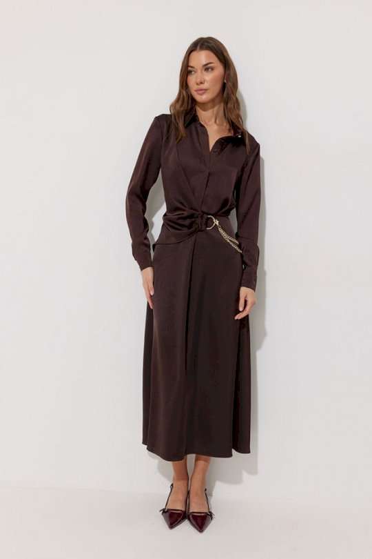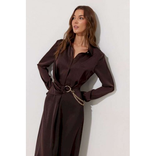 Платье полуприлегающего силуэта расширенное книзу из струящейся ткани. Воротник рубашечного типа с супатной(потайной) застежкой по центру. Рукав втачной длинный, по низу манжета с застежкой на петли и пуговицы. Платье отрезное по линии талии, в подрез вставлена резинка. По переду декоративная отлетная деталь на запах. Платье декорировано съемной фурнитурой. По переду и спинке шлевки для декора. Обращаем ваше внимание, что фурнитура может отличаться от фото. Подходит на рост 164-170 см. Длина платья 129 см. Длина рукава 62 см.
