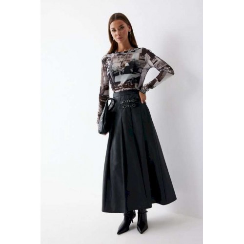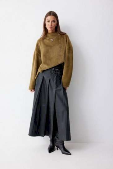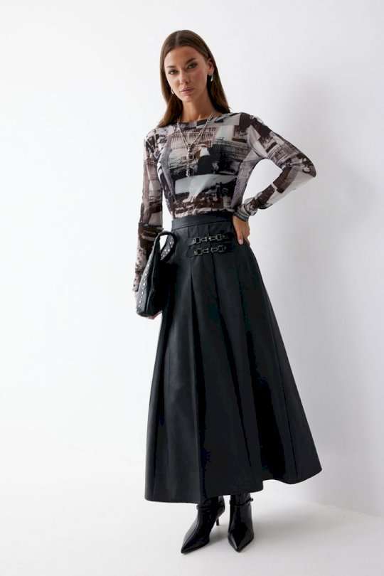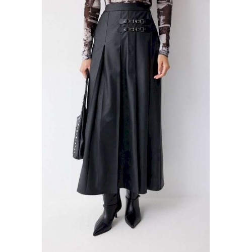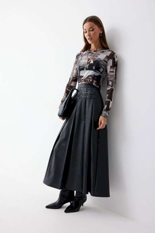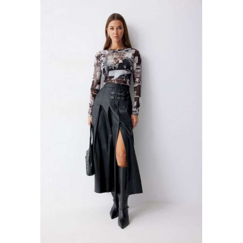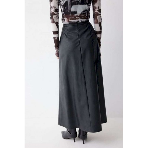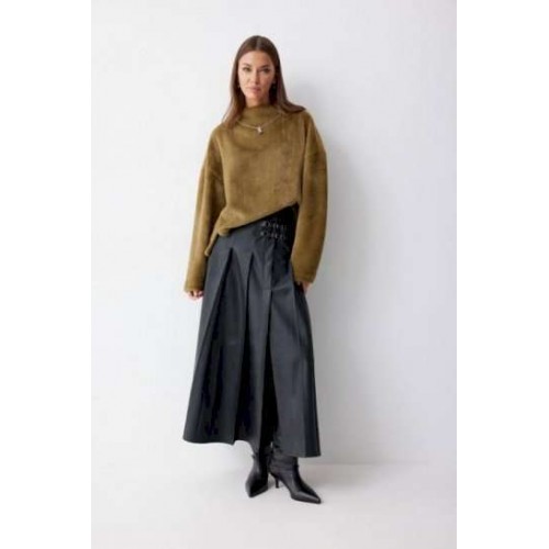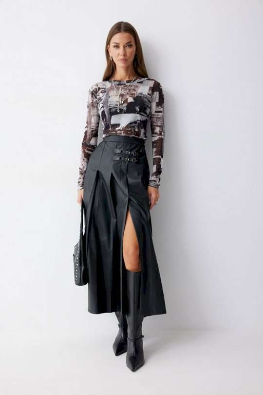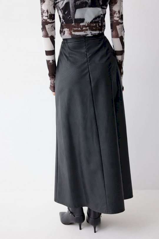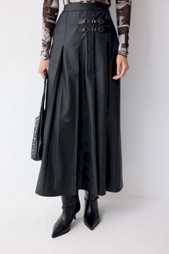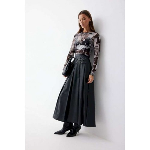 Юбка А-силуэта из экокожи на хлопковой основе. По верху юбки притачной пояс со шлевками для ремня. Переднее полотнище юбки со складками и шлицей и декоративной фурнитурой. На задних половинках расположены талиевые вытачки. На спинке в центральном шве потайная молния. По бокам в поясе вставлена резинка от складки до вытачки. Подходит на рост 164-170 см. Длина юбки (94+3,5см пояс).