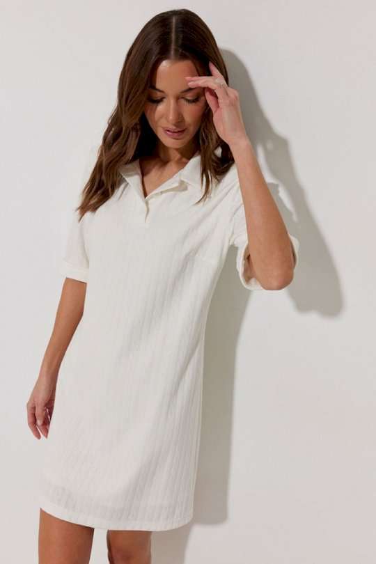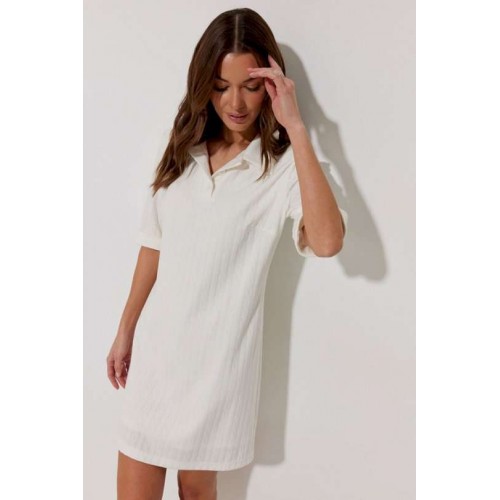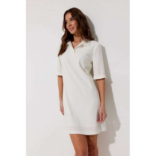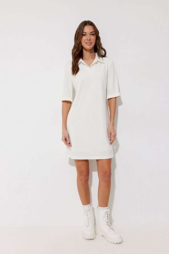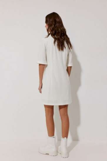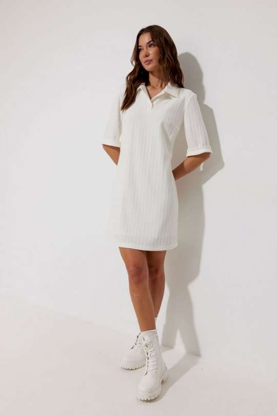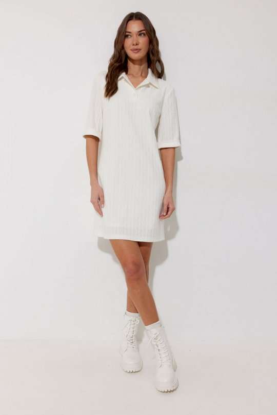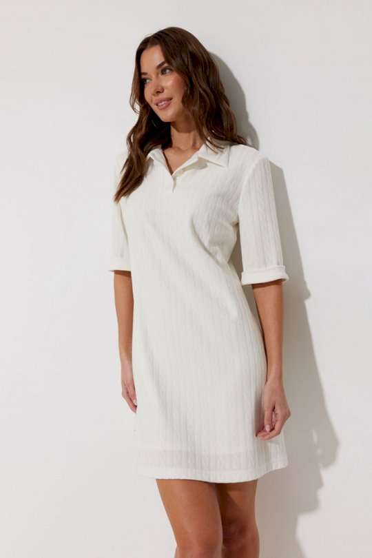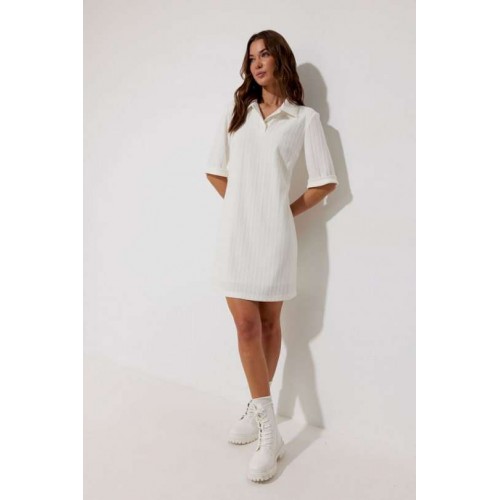 Платье-поло из трикотажного жаккардового полотна. Длина мини. Платье свободное, с небольшим расширением к низу. С отложным воротником. По переду планка с застежкой на петли-пуговицы. По переду нагрудные вытачки. Рукав короткий с отложной манжетой. Воротник, планка и манжета выполнены из трикотажного полотна в тон основной ткани. Платье на трикотажной подкладке. Обращаем Ваше внимание, что фурнитура может незначительно отличаться от фото. Подходит на рост 164-170 см. Длина платья (44-48р 88 см) (50-54р 96 см). Длина рукава во всех размерах 30 см.