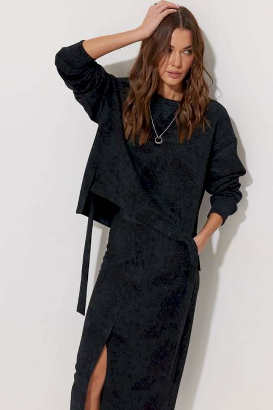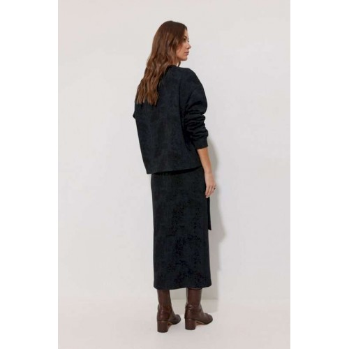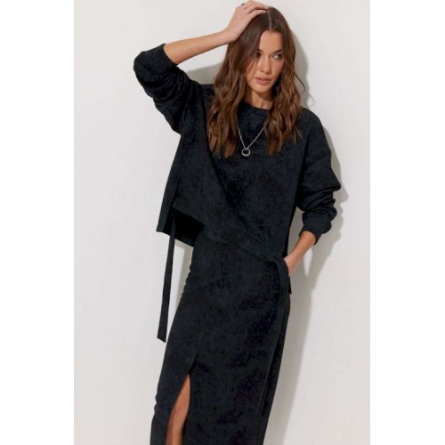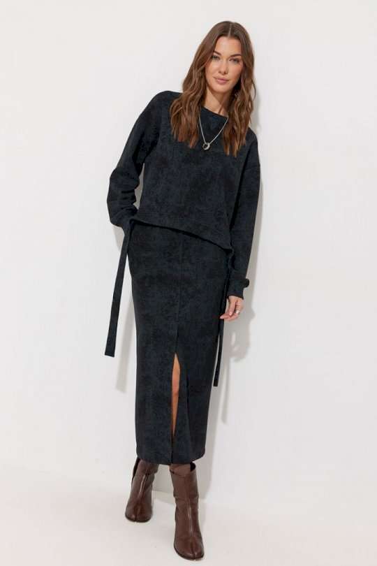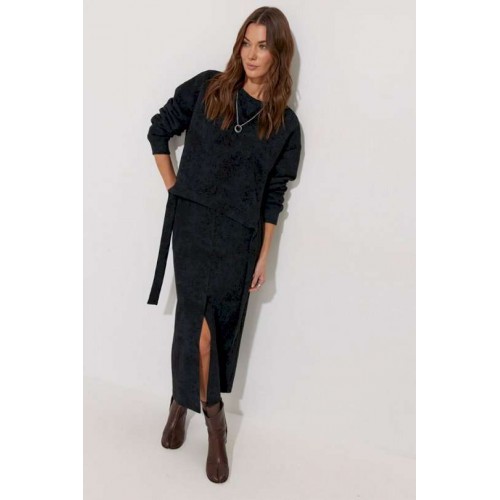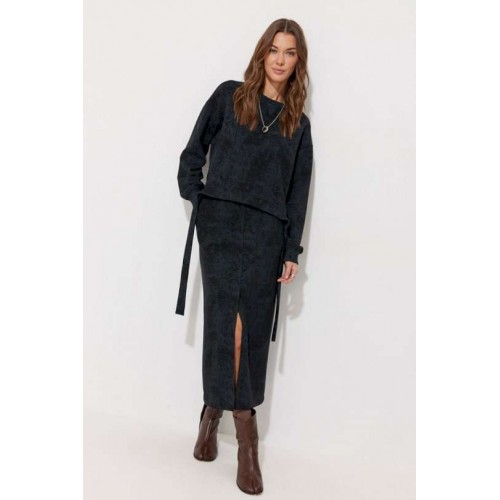 Костюм, состоящий из джемпера и юбки. Джемпер прямого силуэта с фигурным низом из трикотажного полотна. Горловина округлая. Рукав со спущенной линией плеча, по низу на манжете. Джемпер со смещенным боковым швом. Юбка полуприлегающего силуэта из трикотажного полотна. По верху юбки притачной пояс с резинкой. По переду средний шов со шлицей и карманы. На заднем полотнище юбки накладные карманы. Подходит на рост 164-170 см. Длина рукава от горловины (44-48р – 75см)(50-54р - 76см). Длина юбки 87см + 4см пояс.