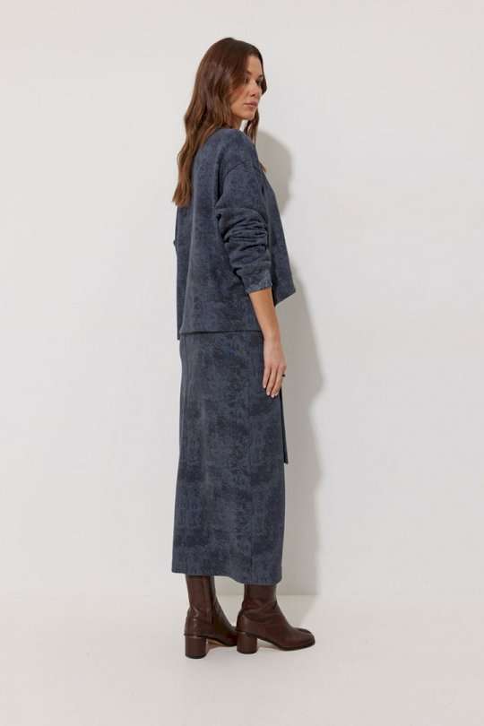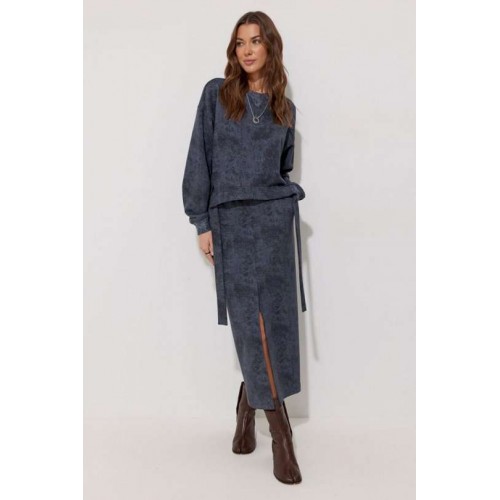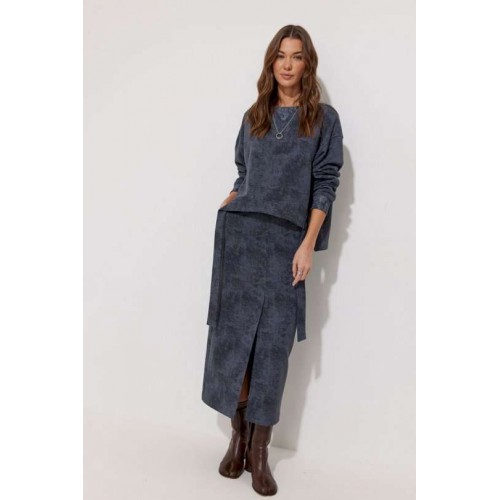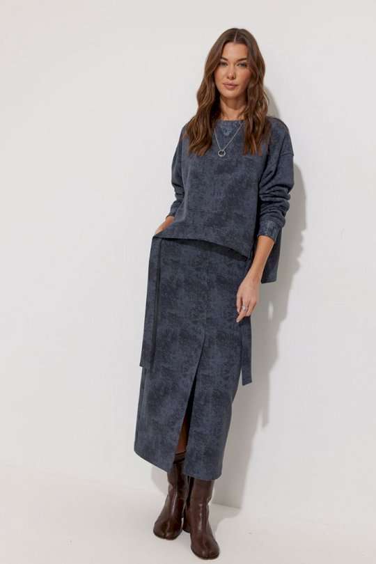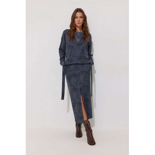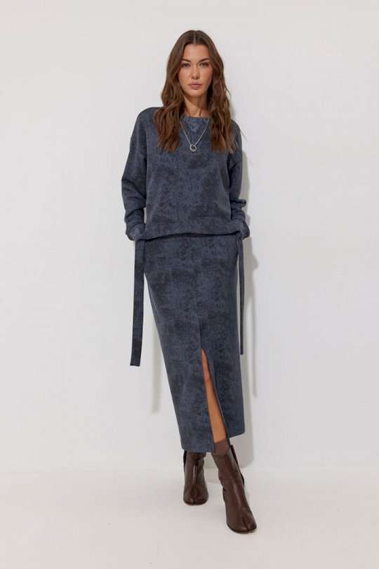 Костюм, состоящий из джемпера и юбки. Джемпер прямого силуэта с фигурным низом из трикотажного полотна. Горловина округлая. Рукав со спущенной линией плеча, по низу на манжете. Джемпер со смещенным боковым швом. Юбка полуприлегающего силуэта из трикотажного полотна. По верху юбки притачной пояс с резинкой. По переду средний шов со шлицей и карманы. На заднем полотнище юбки накладные карманы. Подходит на рост 164-170 см. Длина рукава от горловины (44-48р – 75см)(50-54р - 76см). Длина юбки 87см + 4см пояс.
