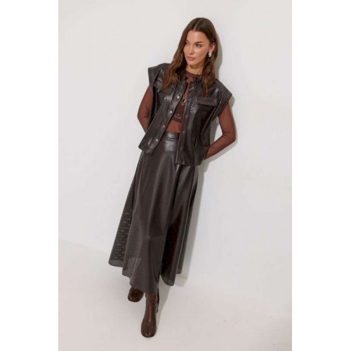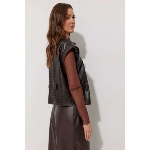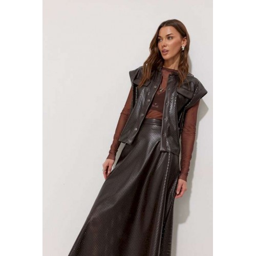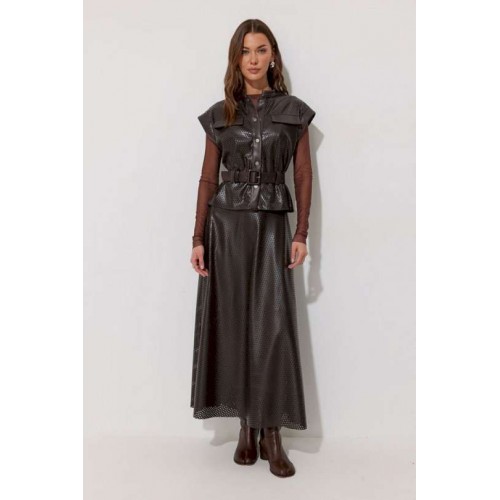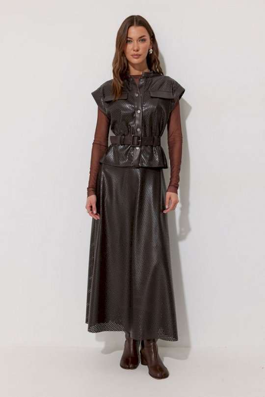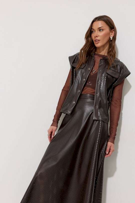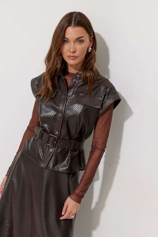 Жакет прямого силуэта из экокожи с перфорацией. Горловина-стойка, по переду застежка на кнопки. Жилет со спущенной линией плеча и отделочными манжетами. По переду кокетка с декоративными клапанами и шлевками для ремня. В комплект входит съемный ремень. Обращаем ваше внимание, что фурнитура может отличаться от фото. Подходит на рост 164-170 см. Длина жилета (44-48р – 51см)(50-54р - 57см).