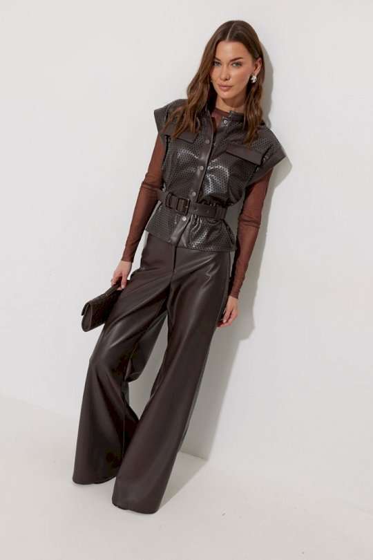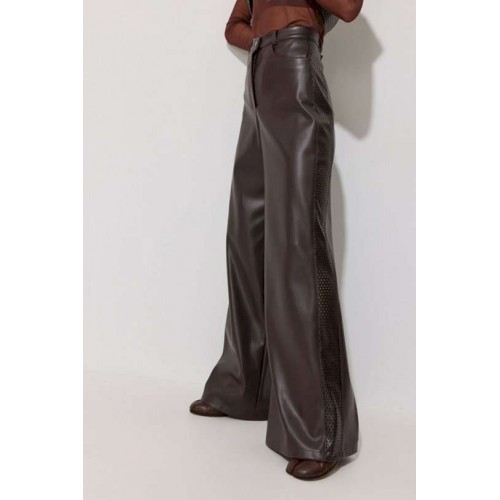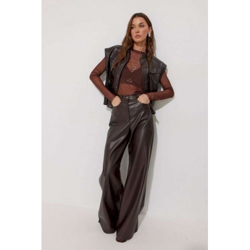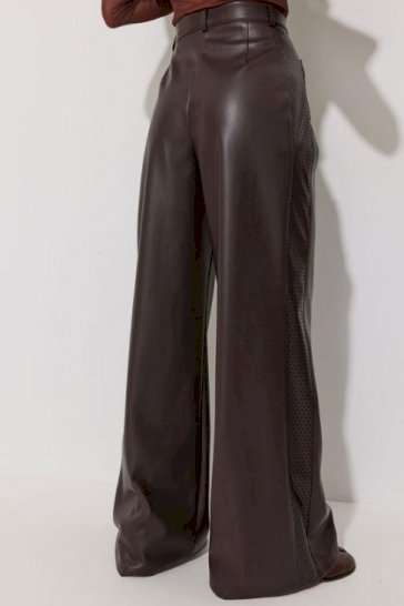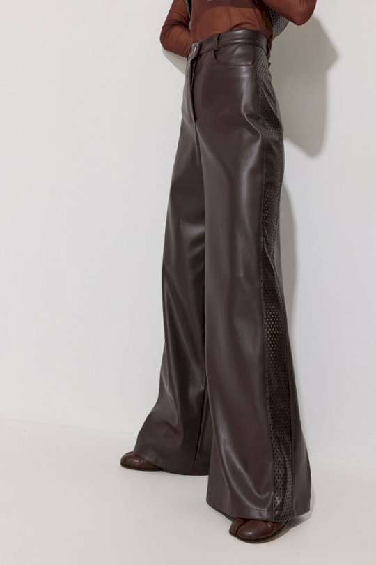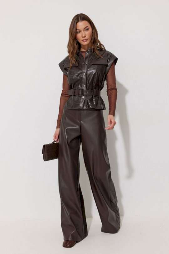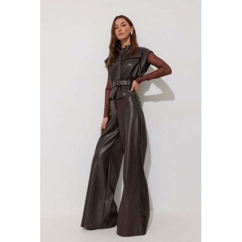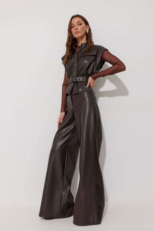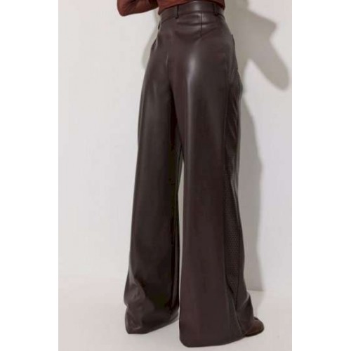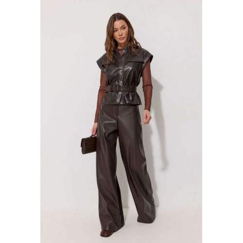 Брюки прямого силуэта расширенные книзу из экокожи. По верху притачной пояс с застежкой на петлю и пуговицу и шлевками для ремня. На передних половинках обработаны карманы и застежка молния в среднем шве. По поясу задних половинок брюк резинка. По бокам брюк вставка из отделочной ткани. Обращаем ваше внимание, что фурнитура может отличаться от фото. Подходит на рост 164-170 см. Длина брюк (44-48р – 113см+4см пояс)(50-54р - 114см+4см пояс).