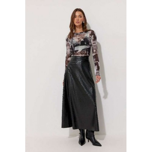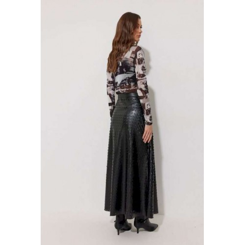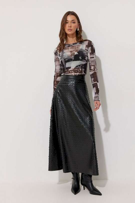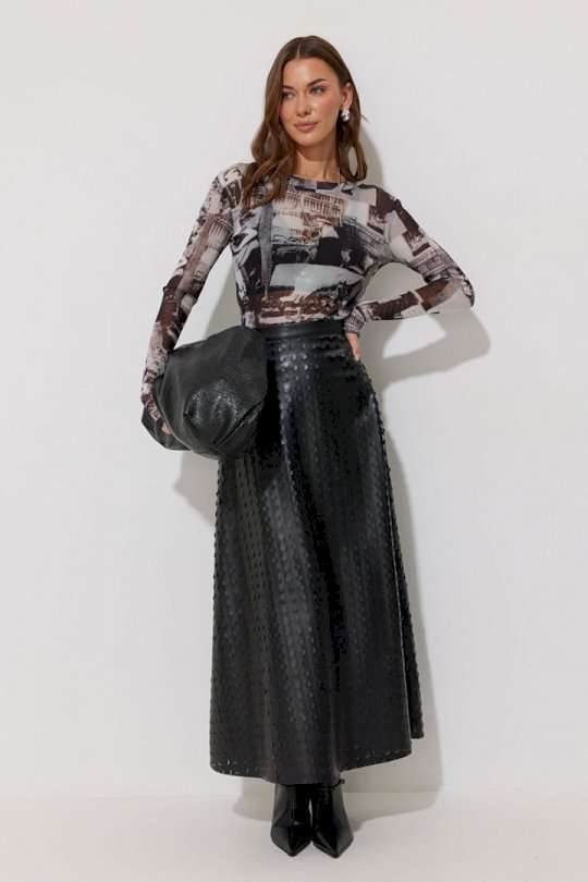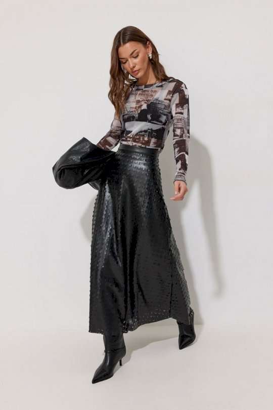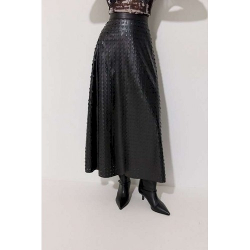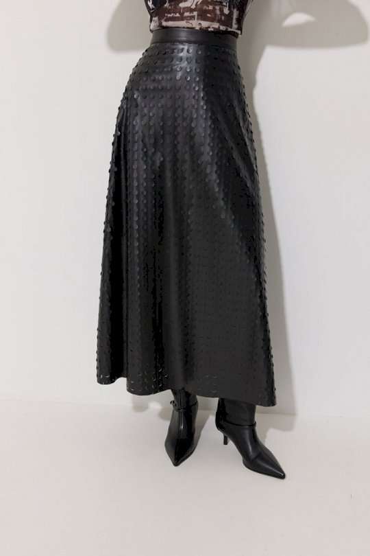 Юбка двухшовная расширенная книзу из экокожи с перфорацией. По верху юбки притачной пояс, на спинке застежка на потайную молнию. Подходит на рост 164-170 см. Длина юбки 94+3,5 см пояс.