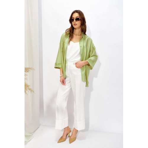 Блузка прямого силуэта из натуральной ткани с добавлением вискозы с фигурным низом. Воротник рубашечного типа с застежкой по центру на петли и пуговицы. По переду накладной карман. Рукав со спущенной линией плеча длиной 7/8 , по низу манжета. На спинке кокетка с декоративными складками. В боковых швах блузки по низу разрезы. Длина блузки (44-48р - 74см)(50-54р - 77см)(56-60р – 77см) Длина рукава от горловины(44-48р - 57см)(50-54р – 58см)(56-60р – 59см)