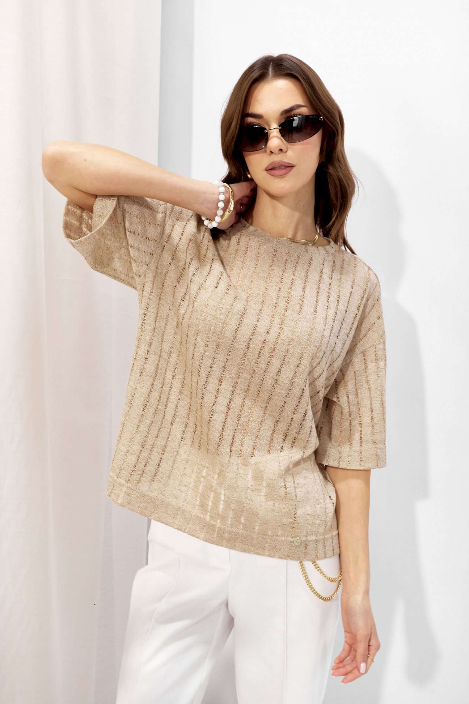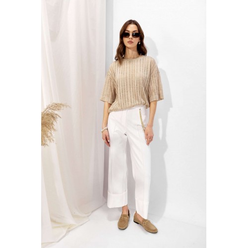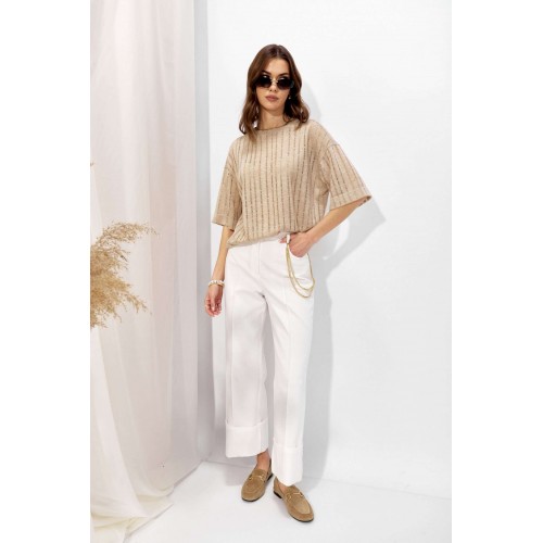 Джемпер прямого силуэта из трикотажного полотна. Горловина округлая. Рукав со спущенной линией плеча длиной до локтя. Длина рукава от горловины (44-48р - 43см)(50-54р - 44,5см)(56-60р – 46см)