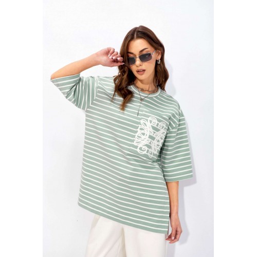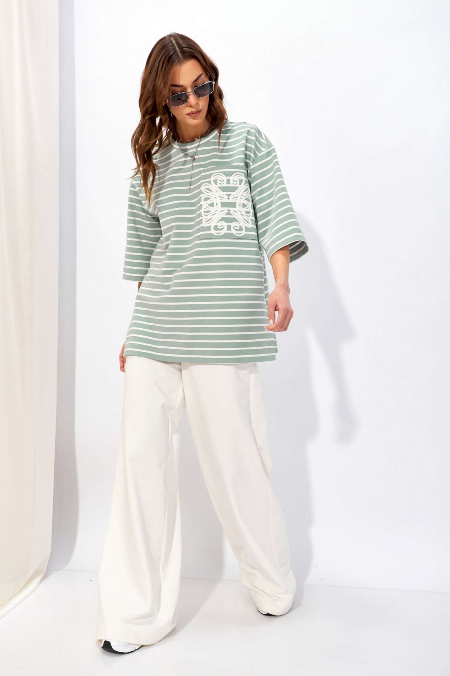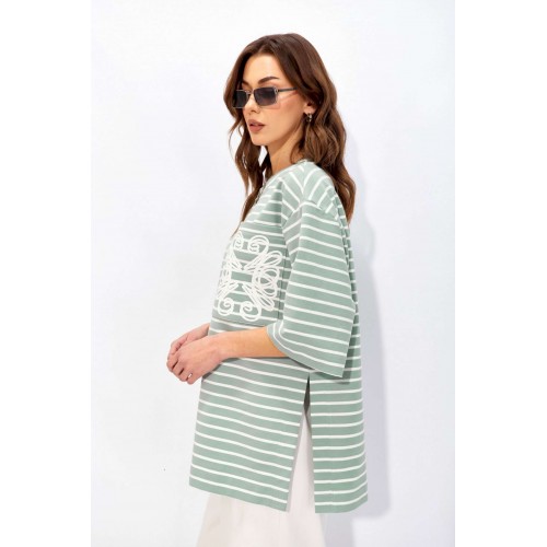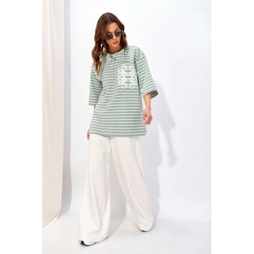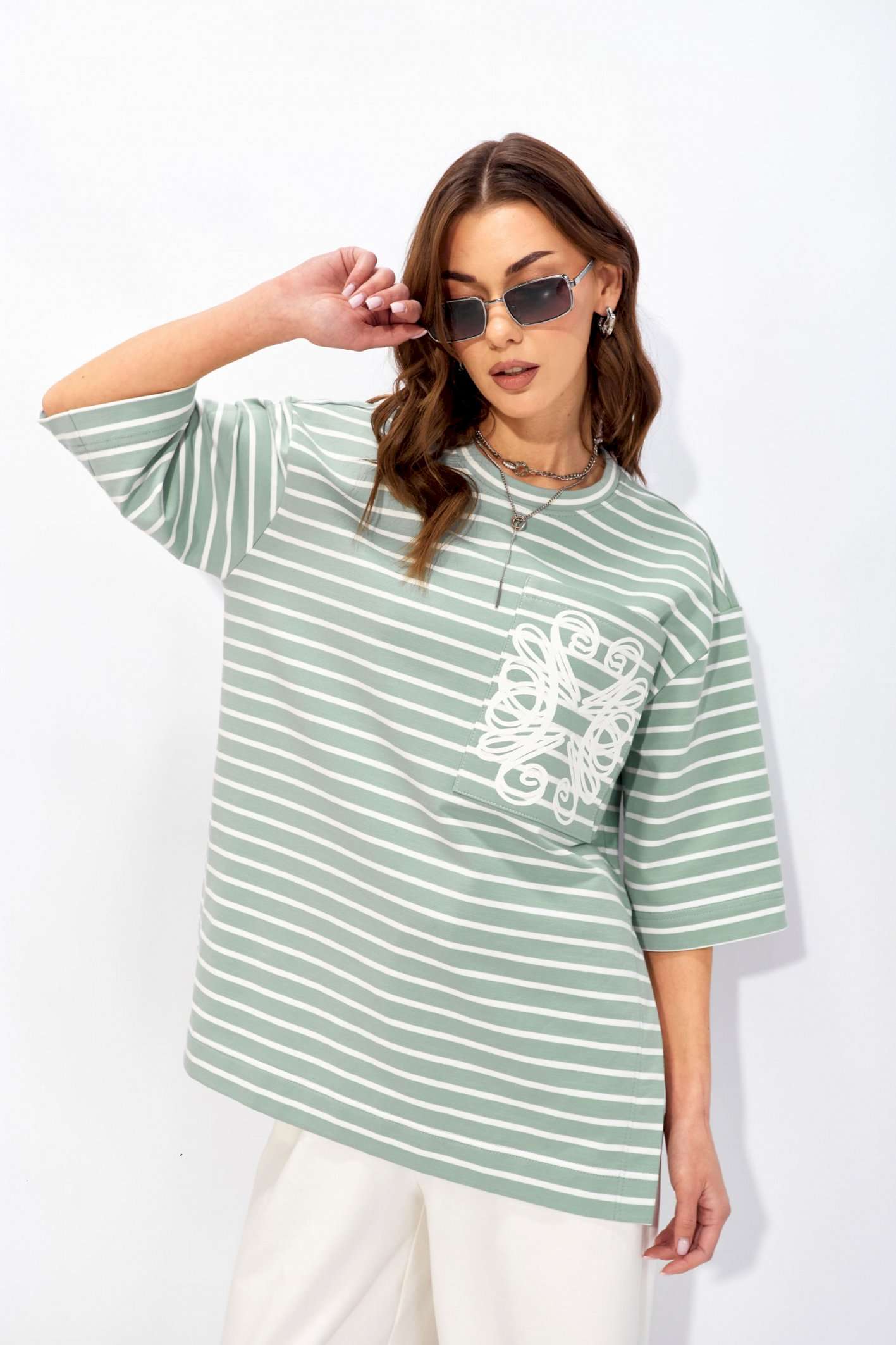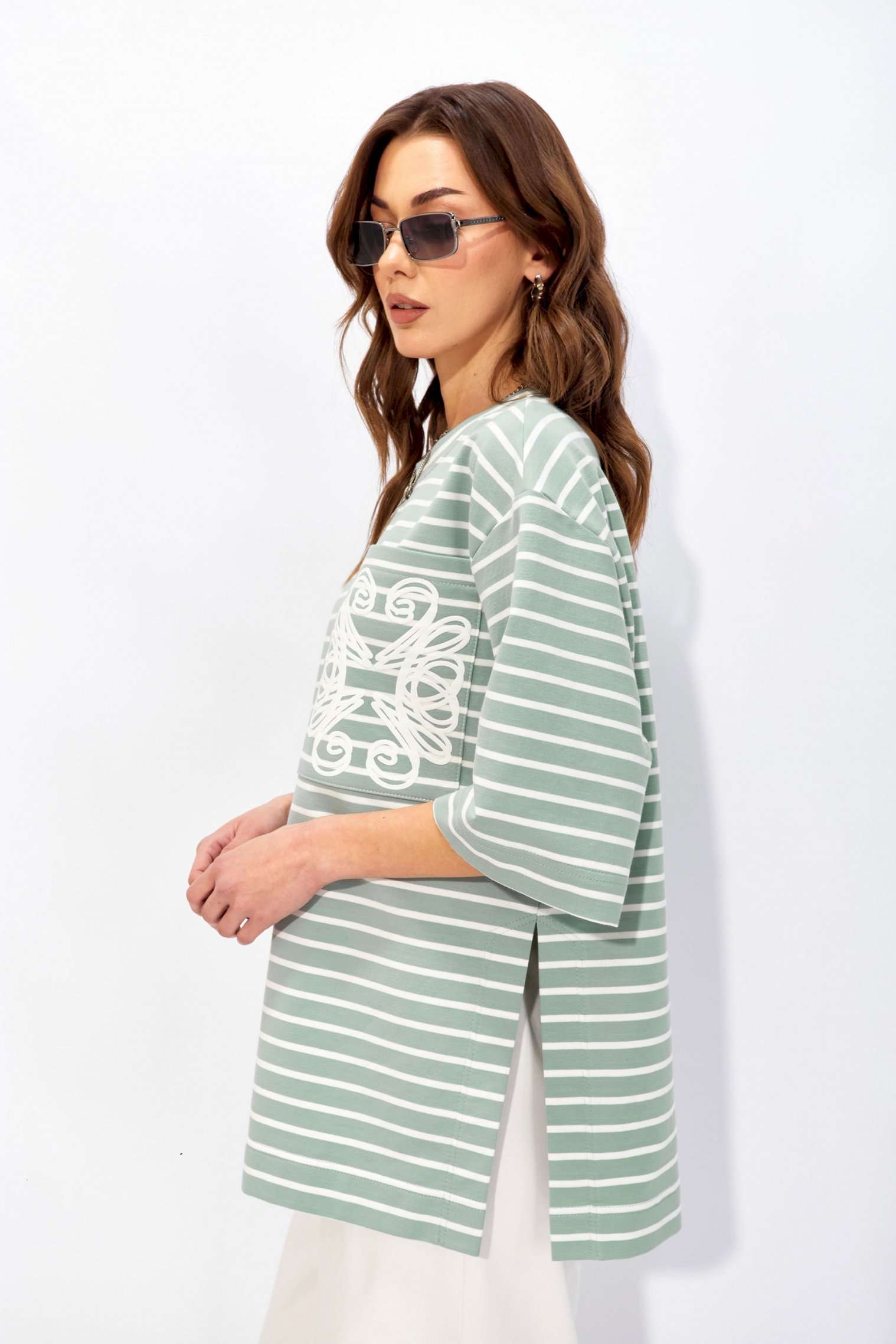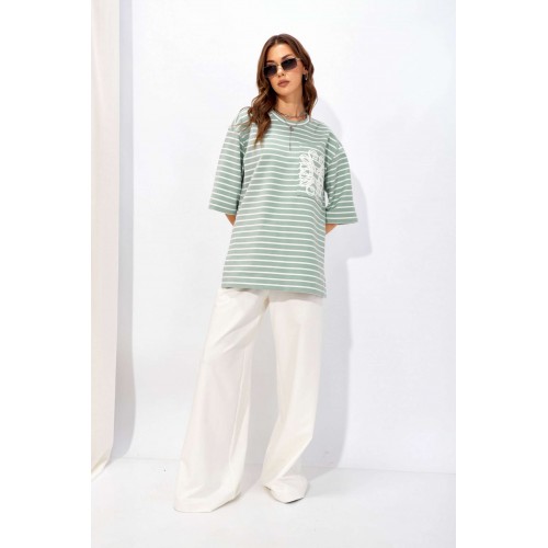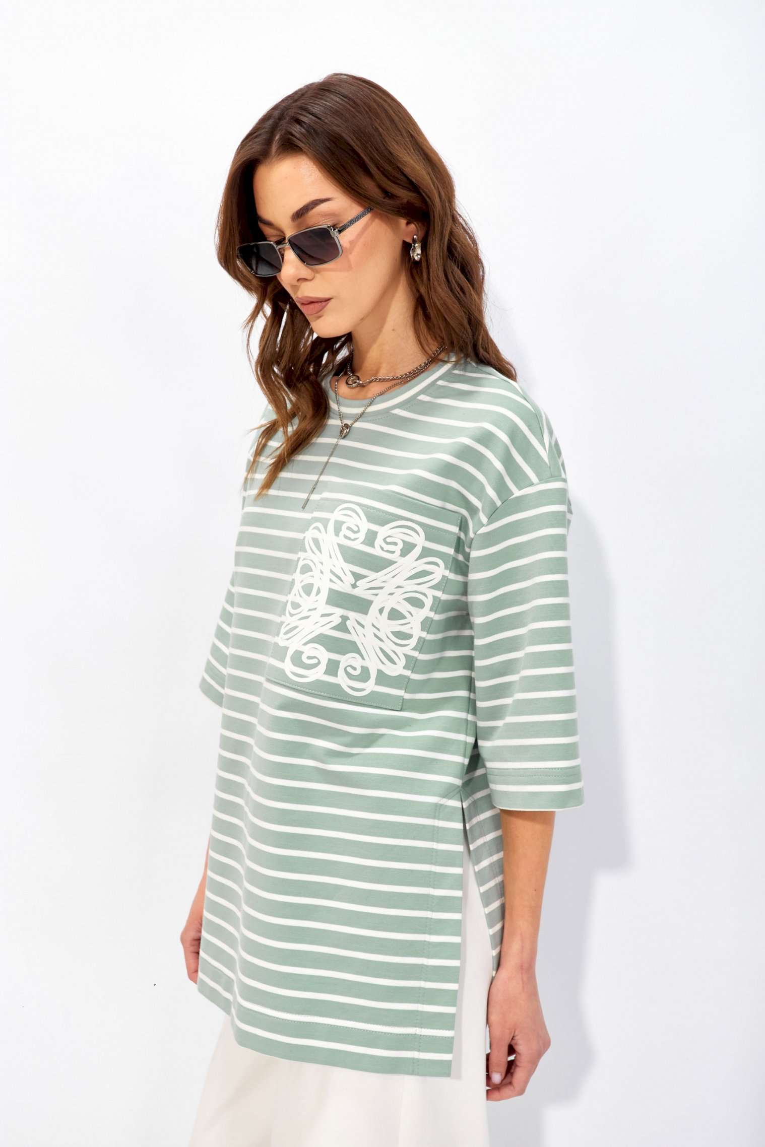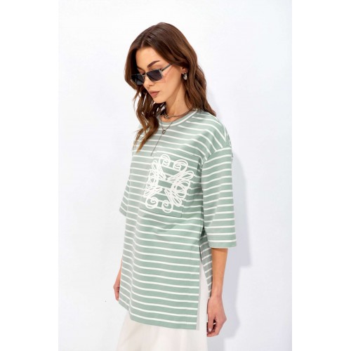 Джемпер прямого свободного силуэта со спущенной линией плеч из хлопкового трикотажного полотна в полоску. Вырез горловины округлый с притачной бейкой. По бокам высокие разрезы до талии. На кармане фактурная дизайнерская печать. Длина по спинке 44-48 – 68см, 50-54 – 70см, 56-60 - 72 см Длин рукава от горловины 44-46 - 47,5см, 52-54 - 48 см, 56-60 - 48,5 см.