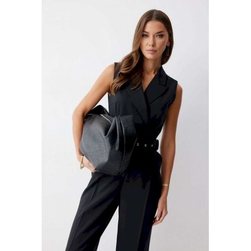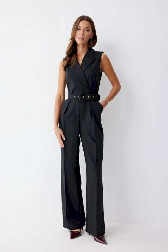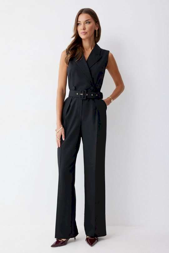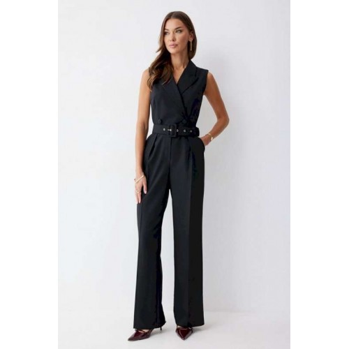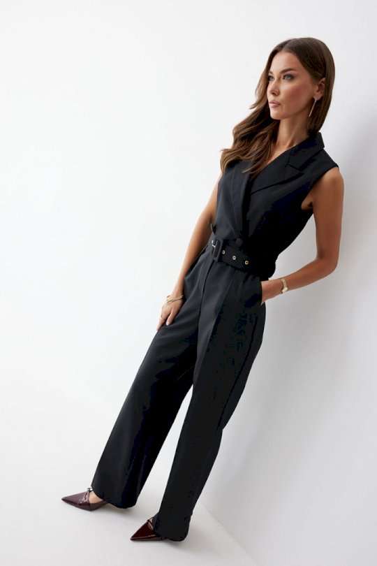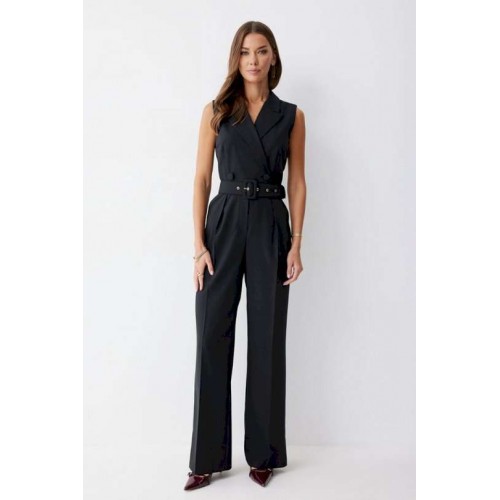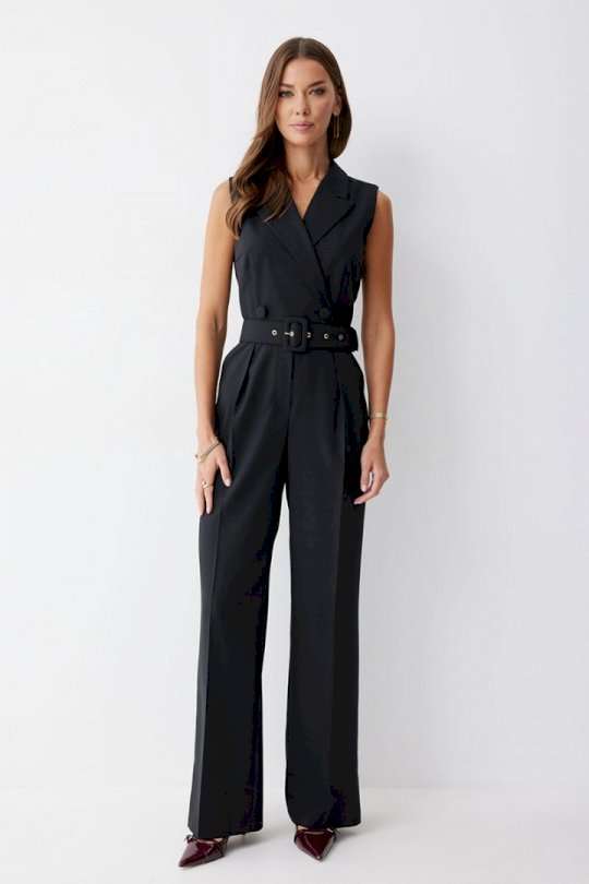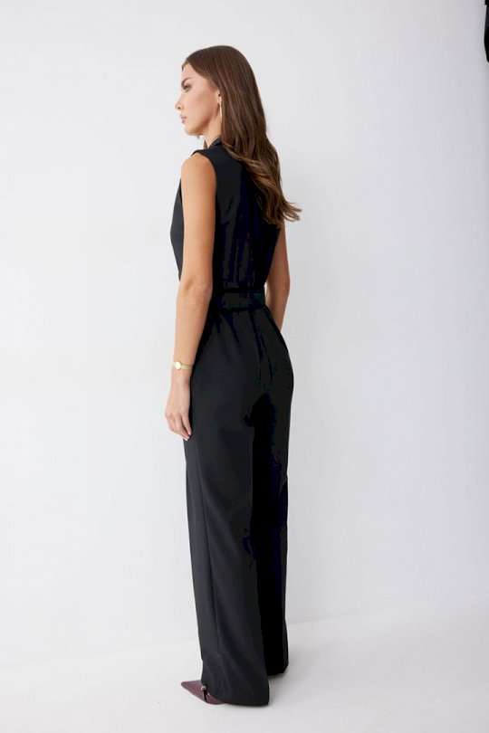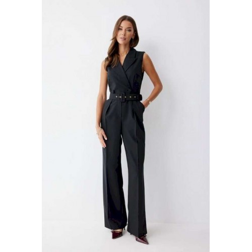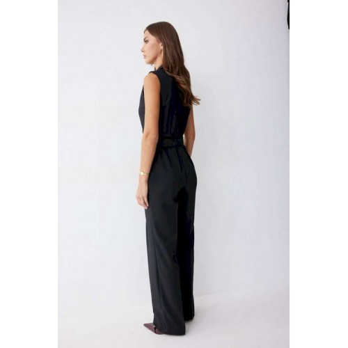 Комбинезон полуприлегающего силуэта из костюмной ткани. Воротник пиджачного типа. Комбинезон отрезной по линии талии, верхняя часть комбинезона на запах. На спинке в среднем шве застежка на потайную молнию. В боковых швах карманы. По переду на лифе талиевые и нагрудные вытачки, на брюках декоративные складки. На спинке лифа талиевые вытачки. В комплект входит ремень. Обращаем ваше внимание, что фурнитура может отличаться от фото. Подходит на рост 164-170 см. Длина комбинезона (42-46р - 154см)(48-52р - 157см).