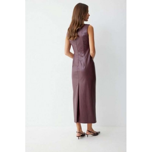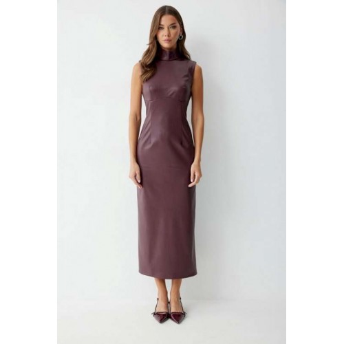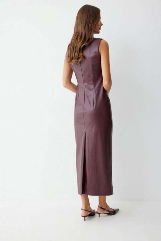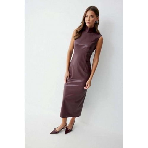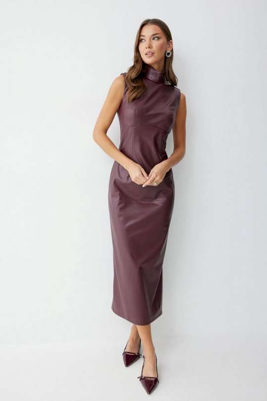 Платье прилегающего силуэта из экокожи длиной миди. Горловина-стойка. Спереди под грудью подрез, нагрудные и талиевые вытачки. На спинке в центральном шве потайная молния, по низу шлица. На спинке платья талиевые вытачки. Подходит на рост 164-170 см. Длина платья 130 см.