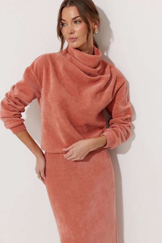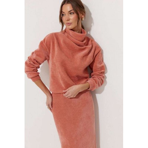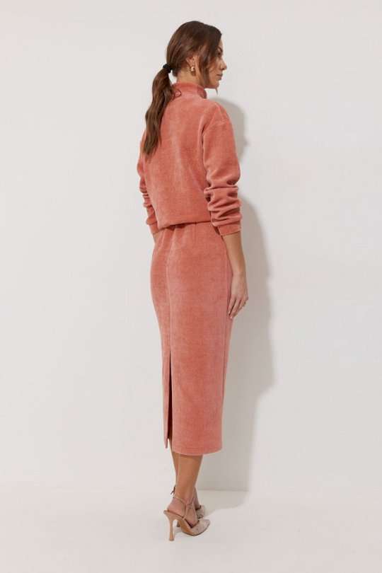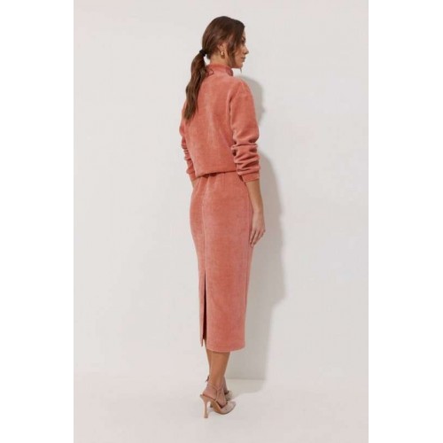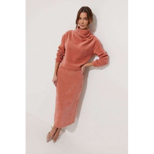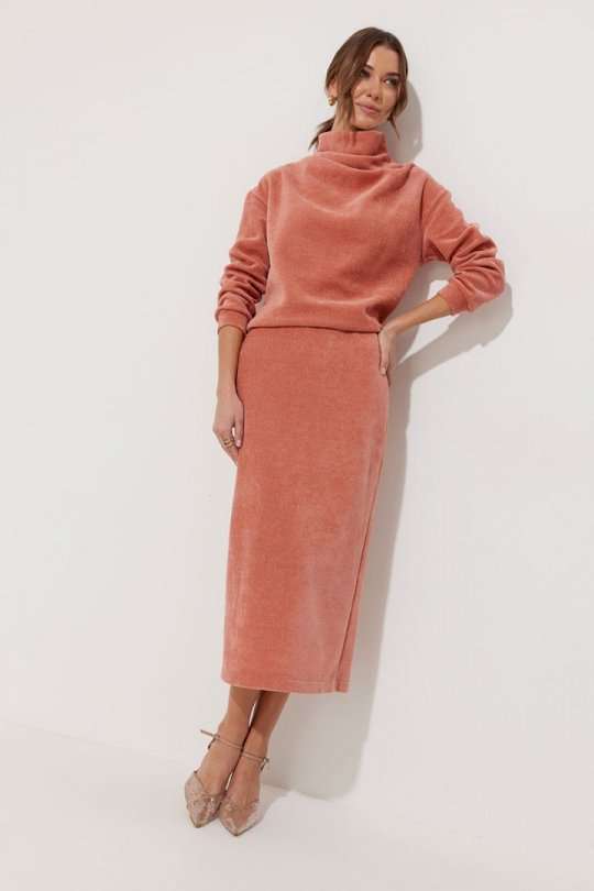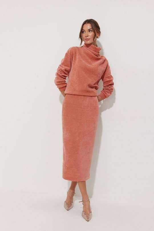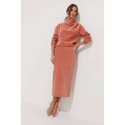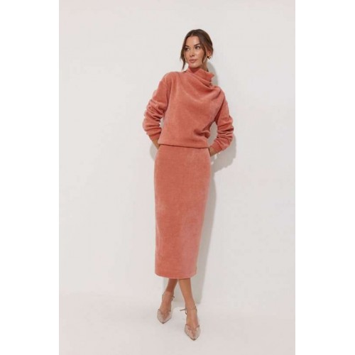 Джемпер из трикотажного полотна, прямого, слегка расширенного силуэта, со спущенной линией плеча. По горловине цельнокроеная стойка. На стойке и плече две складки. Рукав длинный с манжетой. По низу джемпера пояс. Юбка из трикотажного полотна, длина миди. Прямого силуэта. По верхнему срезу резинка. По среднему шву заднего полотнища разрез. Юбка на трикотажной подкладке. Подходит на рост 164-170 см. Длина джемпера (44-48р 61 см) (50-54р 66 см). Длина рукава о горловины (44-48р 75 см) (50-54р 76 см). Длина юбки 84 см во всех размерах.
