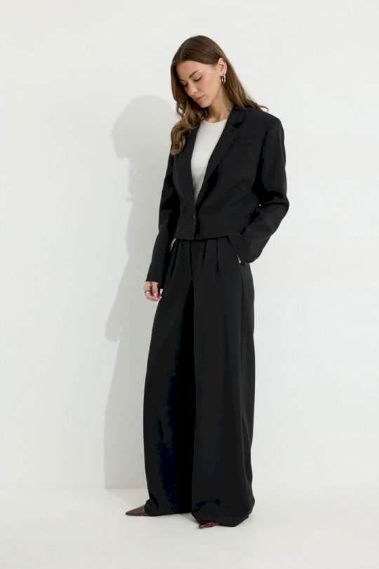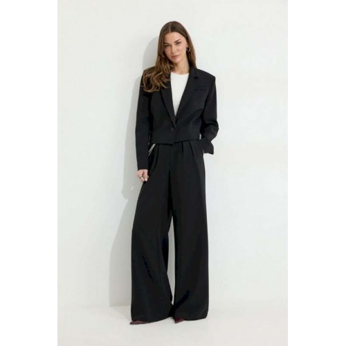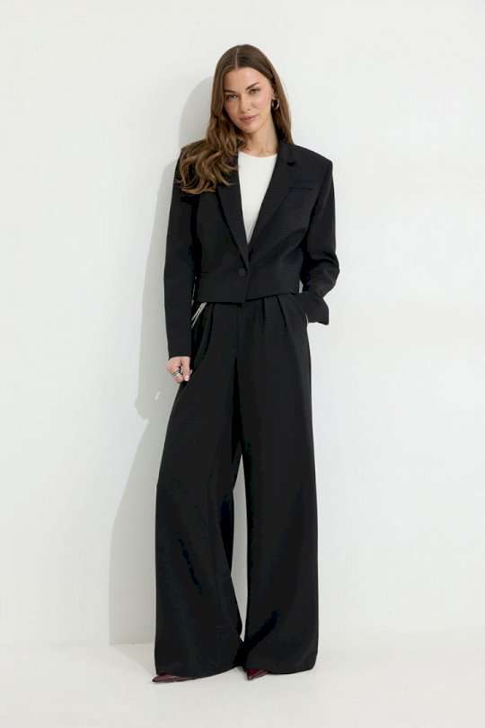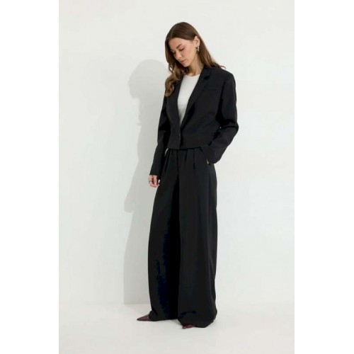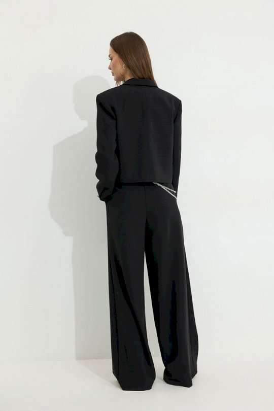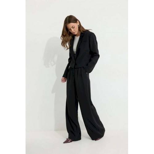 Костюм двойка, состоящи их жакета и брюк. Жакет из поливискозной ткани. Полуприлегающего силуэта, линия плеча немного расширена. Жакет укороченный. С отложным воротником и лацканами. По переду застежка на петлю и пуговицу. По переду отрезные бочки, переходящий на спинку, и талиевые вытачки, по низу горизонтальные карманы, вход оформлен листочкой. По левой полочке выше линии груди карман-обманка, вход оформлен листочкой. По спинке средний шов. Рукав длинный, двухшовный, с имитацией шлицы; шлица с застежкой на петлю и пуговицу. Жакет на подкладке. Обращаем Ваше внимание, что фурнитура может незначительно отличаться от фото. Брюки из поливискозной ткани, прямого, расширенного силуэта. На передних половинах брюк по две складки, выходящих из-под пояса, складки застрочены на несколько сантиметров. По переду застежка на молнию по типу гульфик. Брюки по переду с карманами в отрезных бочках. Пояс по переду с застежкой на петлю и пуговицу. Со шлевками по переду и спинке. По спинке в пояс вставлена резинка. На задних половинах брюк вытачки. Обращаем Ваше внимание, что фурнитура может незначительно отличаться от фото. Подходит на рост 164-170 см. Длина жакета (44-48р 48 см) (50-54р 52 см). Длина рукава (44-48р 61 см) (50-54р 62 см). Длина брюк (44-48р 111 см, пояс 4,5 см) (50-54р 112 см, пояс 4,5 см).