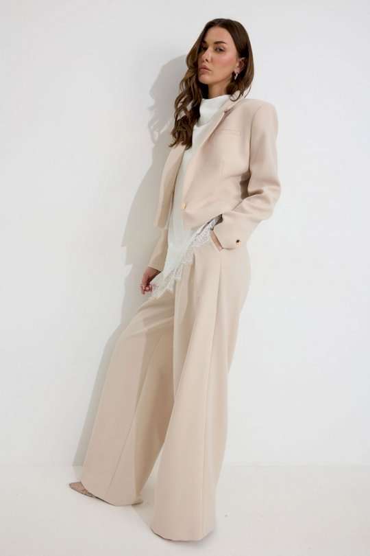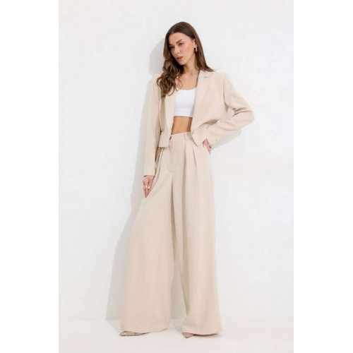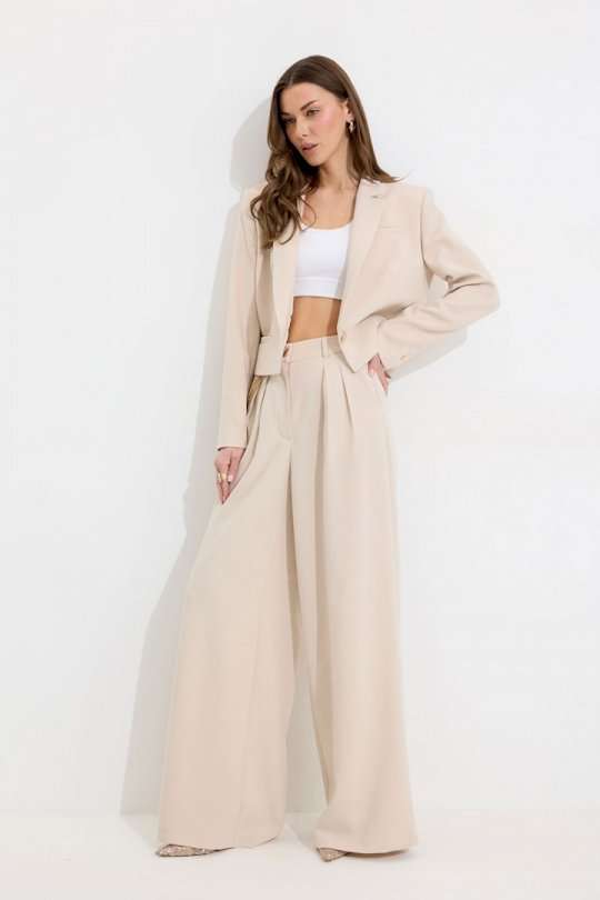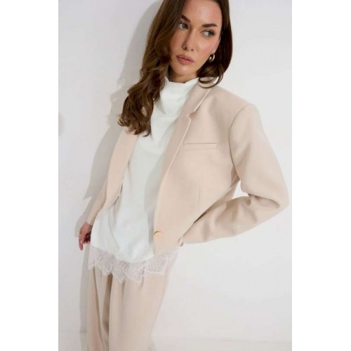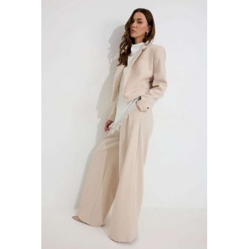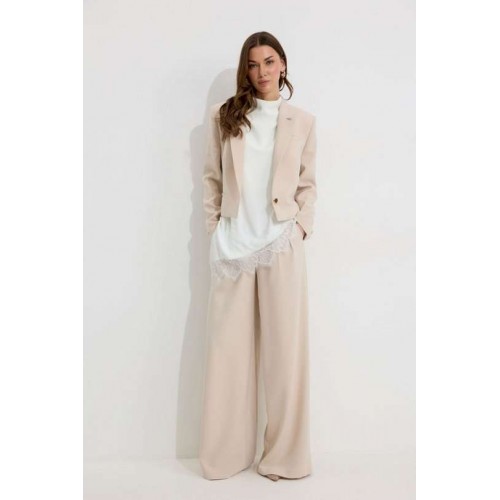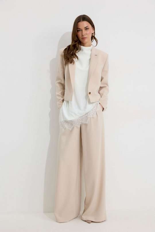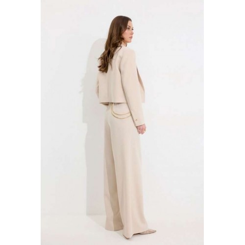 Костюм двойка, состоящи их жакета и брюк. Жакет из поливискозной ткани. Полуприлегающего силуэта, линия плеча немного расширена. Жакет укороченный. С отложным воротником и лацканами. По переду застежка на петлю и пуговицу. По переду отрезные бочки, переходящий на спинку, и талиевые вытачки, по низу горизонтальные карманы, вход оформлен листочкой. По левой полочке выше линии груди карман-обманка, вход оформлен листочкой. По спинке средний шов. Рукав длинный, двухшовный, с имитацией шлицы; шлица с застежкой на петлю и пуговицу. Жакет на подкладке. Обращаем Ваше внимание, что фурнитура может незначительно отличаться от фото. Брюки из поливискозной ткани, прямого, расширенного силуэта. На передних половинах брюк по две складки, выходящих из-под пояса, складки застрочены на несколько сантиметров. По переду застежка на молнию по типу гульфик. Брюки по переду с карманами в отрезных бочках. Пояс по переду с застежкой на петлю и пуговицу. Со шлевками по переду и спинке. По спинке в пояс вставлена резинка. На задних половинах брюк вытачки. Обращаем Ваше внимание, что фурнитура может незначительно отличаться от фото. Подходит на рост 164-170 см. Длина жакета (44-48р 48 см) (50-54р 52 см). Длина рукава (44-48р 61 см) (50-54р 62 см). Длина брюк (44-48р 111 см, пояс 4,5 см) (50-54р 112 см, пояс 4,5 см).
