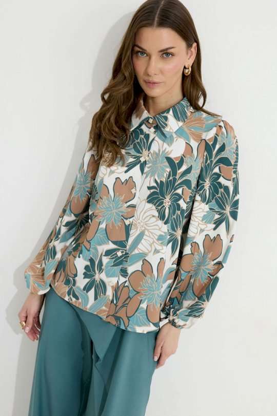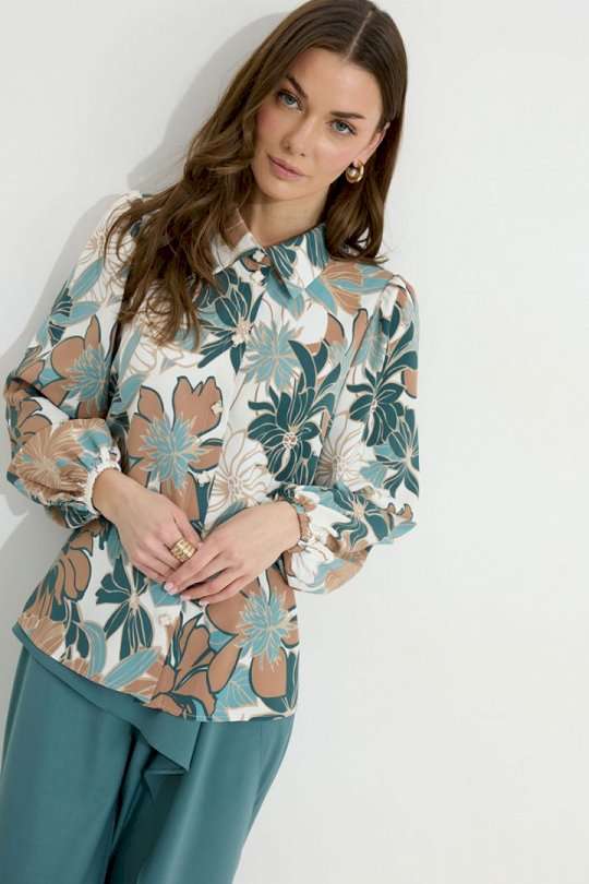 Блузка прямого силуэта из блузочной ткани с принтом. Воротник рубашечного типа с застежкой по центру на петли и пуговицы. Рукав втачной со сборкой по окату, по низу рукава резинка. По низу в боковых швах блузки разрезы. Обращаем ваше внимание, что фурнитура может отличаться от фото. Подходит на рост 164-170 см. Длина блузки (44-48р – 61см)(50-54р - 64см). Длина рукава (44-48р - 65см)(50-54р - 66см).