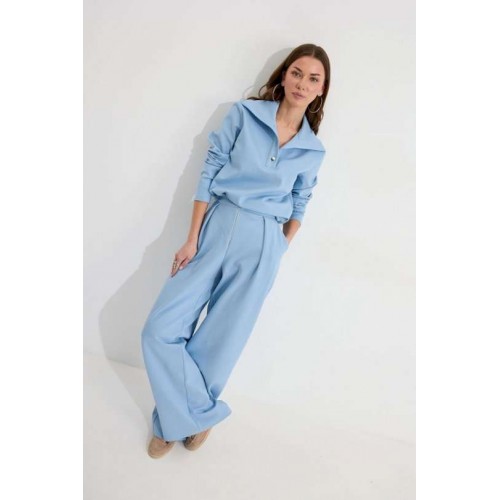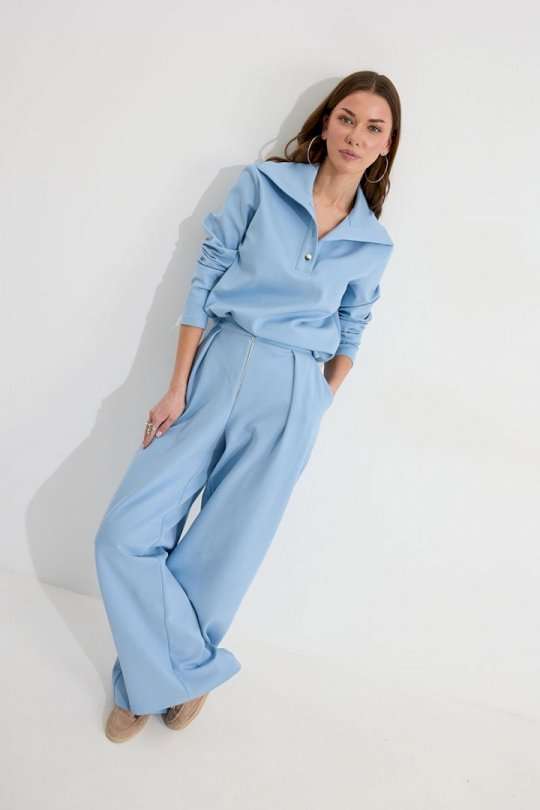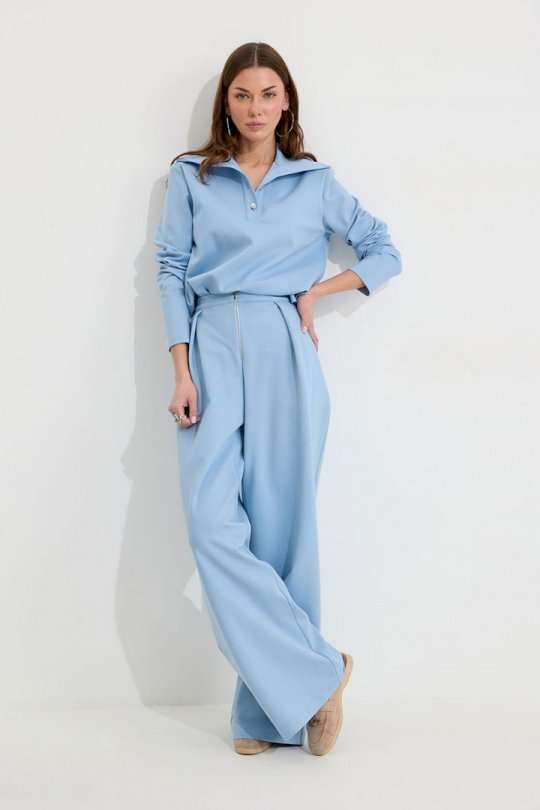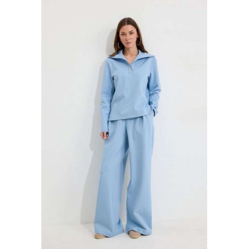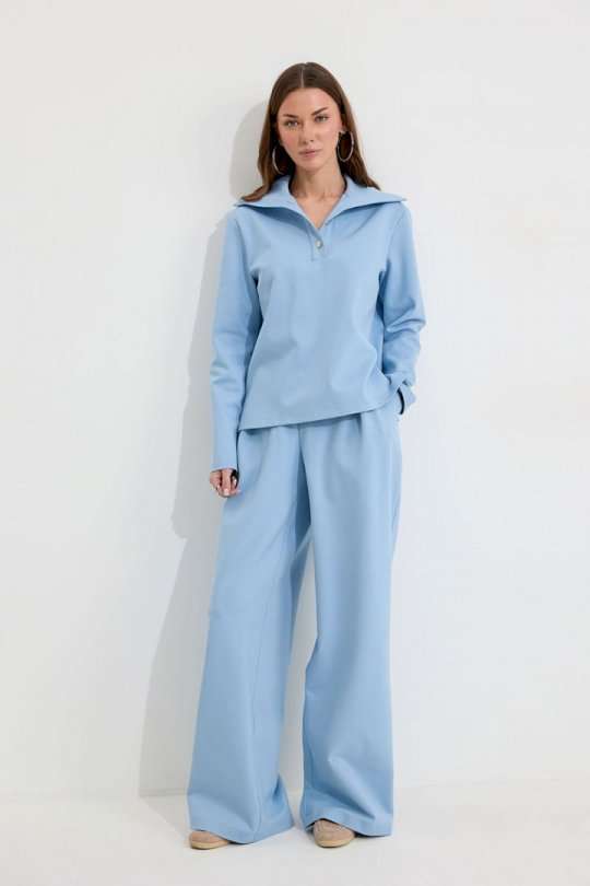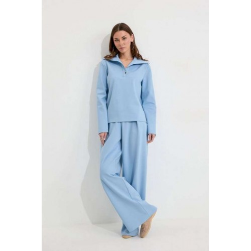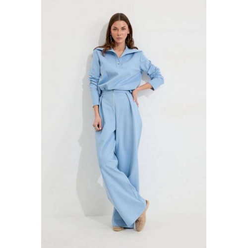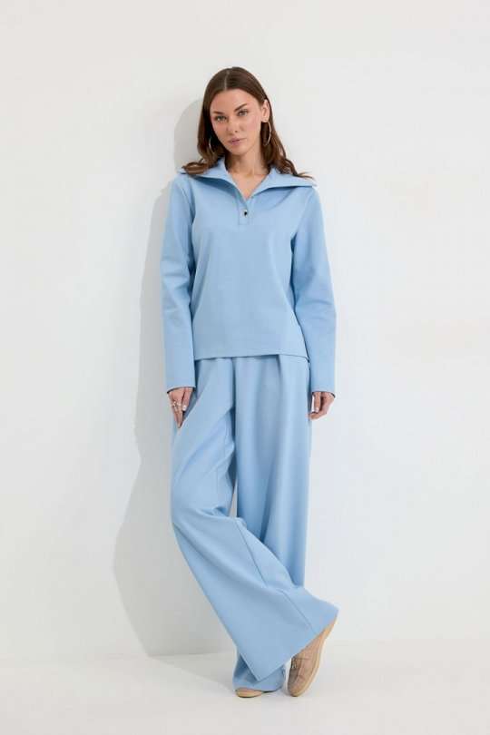 Костюм, состоящий из джемпера и брюк. Джемпер прямого силуэта из трикотажного полотна. Воротник - широкая стойка. Горловина с застежкой на петлю и пуговицу. Рукав одношовный втачной, чуть спущена линия плеча. По низу джемпера в боковых швах разрезы. Брюки прямого силуэта из трикотажного полотна. По верху брюк притачной пояс, по переду застежка молния в среднем шве, карманы в боковых швах и декоративные складки. На задних половинках брюк прорезные листочки. По задним половинкам брюк на поясе резинка от вытачки до вытачки. Обращаем ваше внимание, что фурнитура может отличаться от фото. Подходит на рост 164-170 см. Длина джемпера (44-48р – 58см)(50-54р - 61см). От горловины (44-48р – 74см)(50-54р - 75см). Длина брюк (44-48р – 112+3,5см пояс)(50-54р - 113+3,5см пояс).