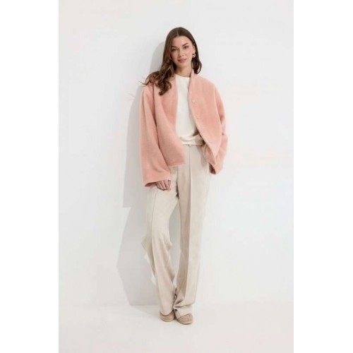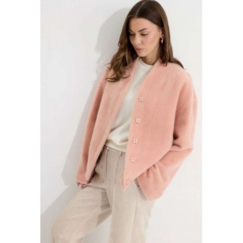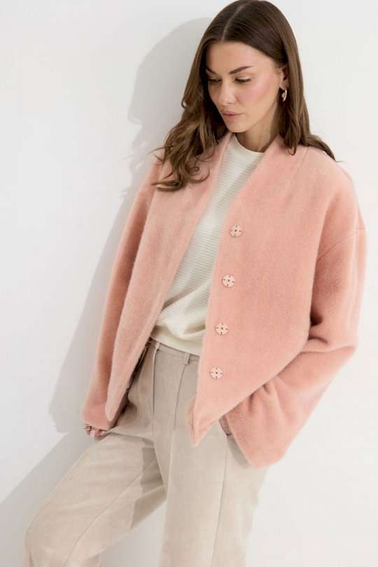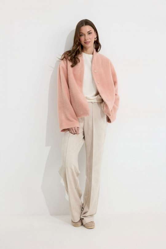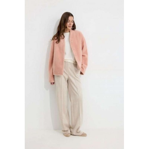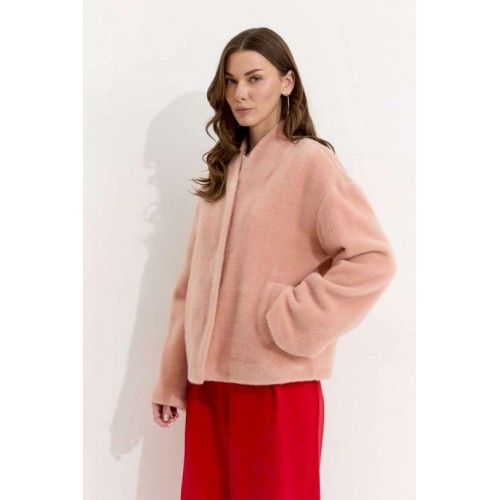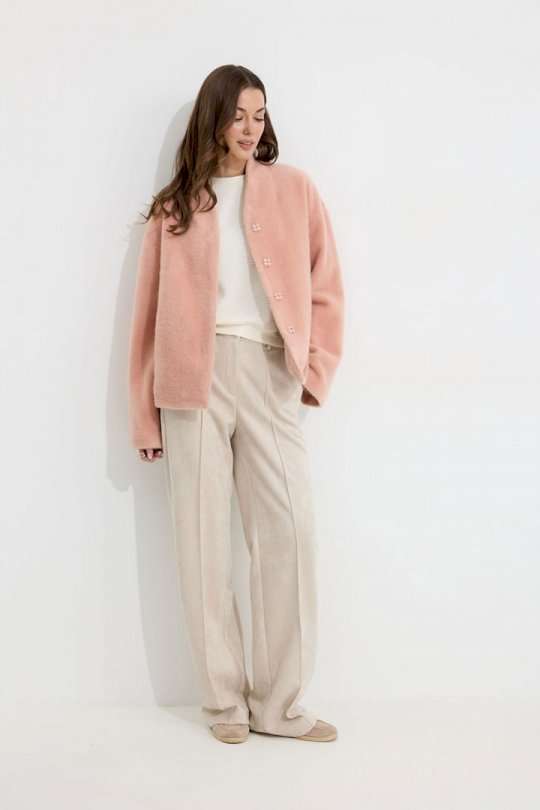Жакет прямого силуэта из трикотажного полотна. Горловина цельнокроеная стойка по центру застежка на кнопки. Рукав со спущенной линией плеча, расширенный к низу. По переду карманы с листочками. Жакет на подкладке. Обращаем ваше внимание, что фурнитура может отличаться от фото. Подходит на рост 164-170 см. Длина жакета (44-48р – 59см)(50-54р – 62см). Длина рукава о горловины (44-48р – 76см)(50-54р - 77см).