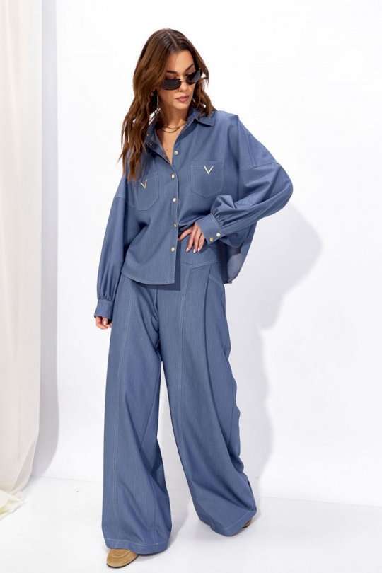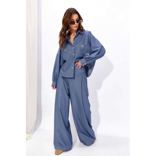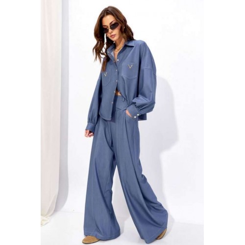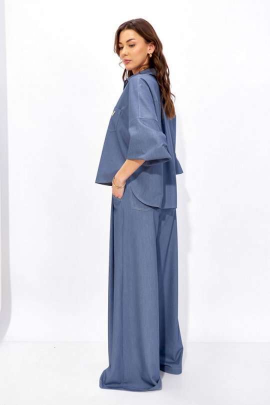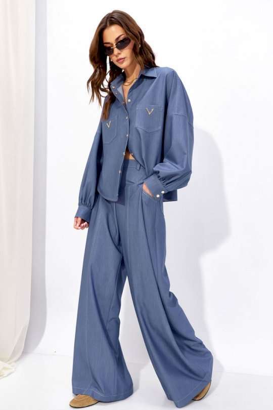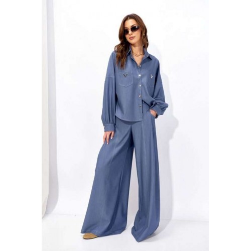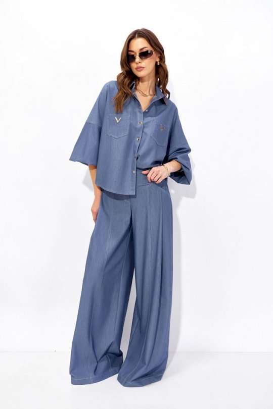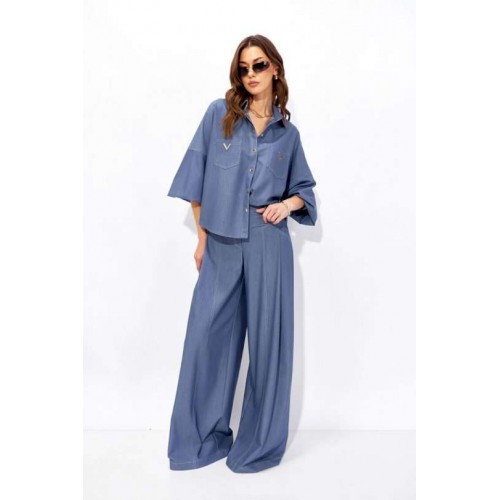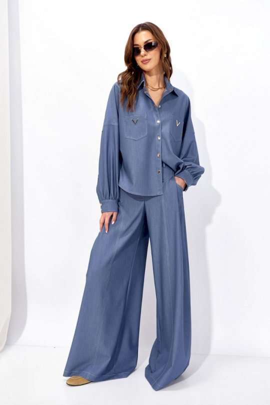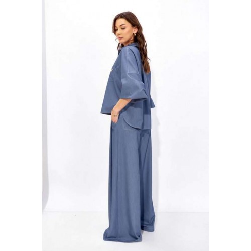 Костюм состоящий из блузки и брюк. Блузка прямого силуэта слегка зауженная книзу из костюмной ткани под джинс с фигурным низом. Воротник рубашечного типа с застежкой по центру на кнопки. Рукав со спущенной линией плеча, по низу манжета с застежкой на кнопки. По переду накладные карманы. На спинке кокетка с декоративной складкой. По низу блузки в боковых швах разрезы. Обращаем ваше внимание, что фурнитура может отличаться от фото. Брюки прямого силуэта расширенные книзу из костюмной ткани под джинс. По верху притачной пояс со шлевками для ремня. На передних половинках обработаны карманы, декоративная складка, застежка молния в среднем шве, на задних – вытачки с карманами. По поясу задних половинок брюк эластичная тесьма (резинка)от вытачки до вытачки. Обращаем ваше внимание, что фурнитура может отличаться от фото. Длина блузки в 44-48р – 62 см, в 50-54р - 70 см. От горловины 75 см. Длина брюк в 44-48р – 112+3,5 см пояс, в 50-54р - 113+3,5 см пояс.