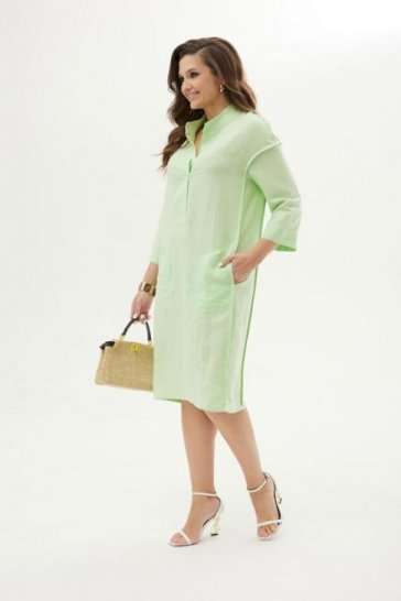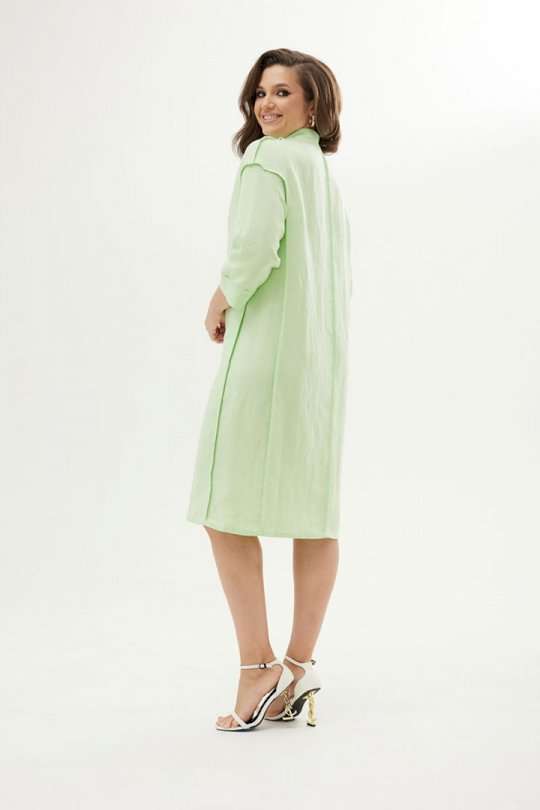 Платье прямое с разрезами по боках. В боковых швах карманы. Воротник-стойка. Застежка на планку до уровня талии с пуговицами. Рукав прямой втачной ¾ с застежкой на пату. На спине вышивка.