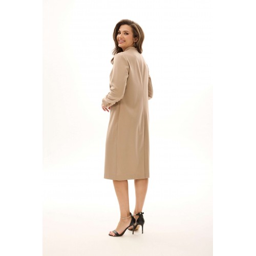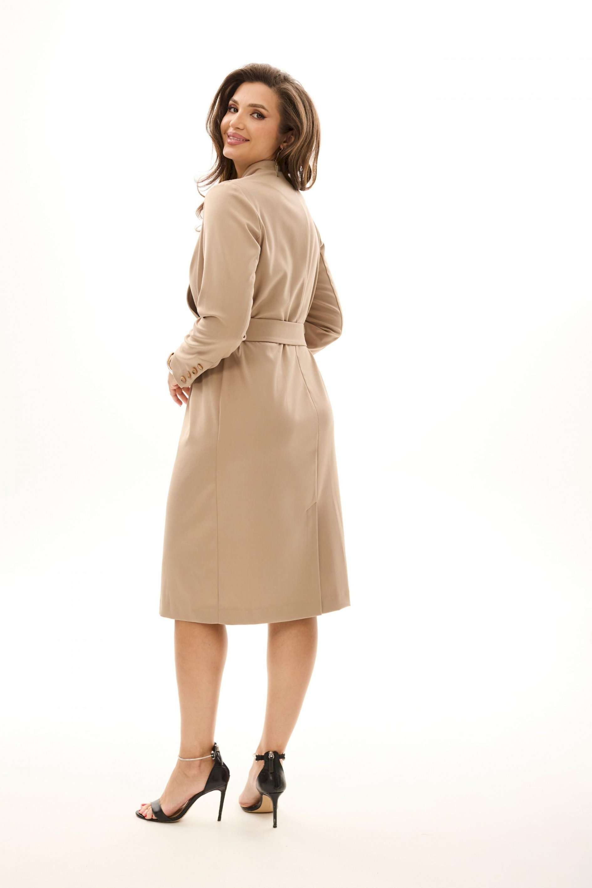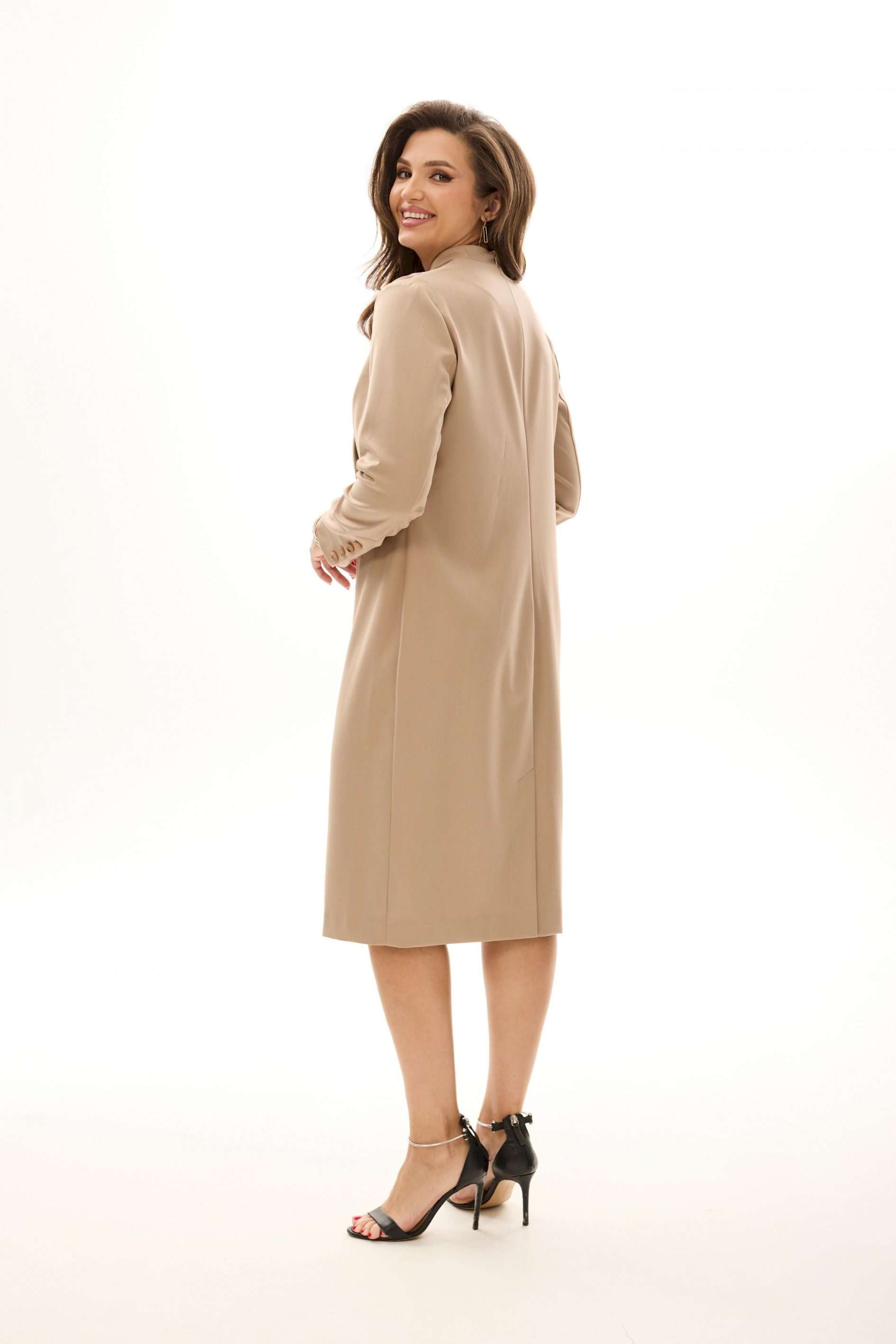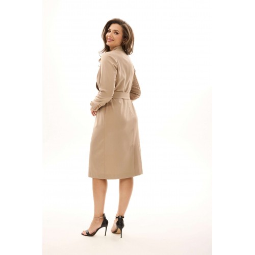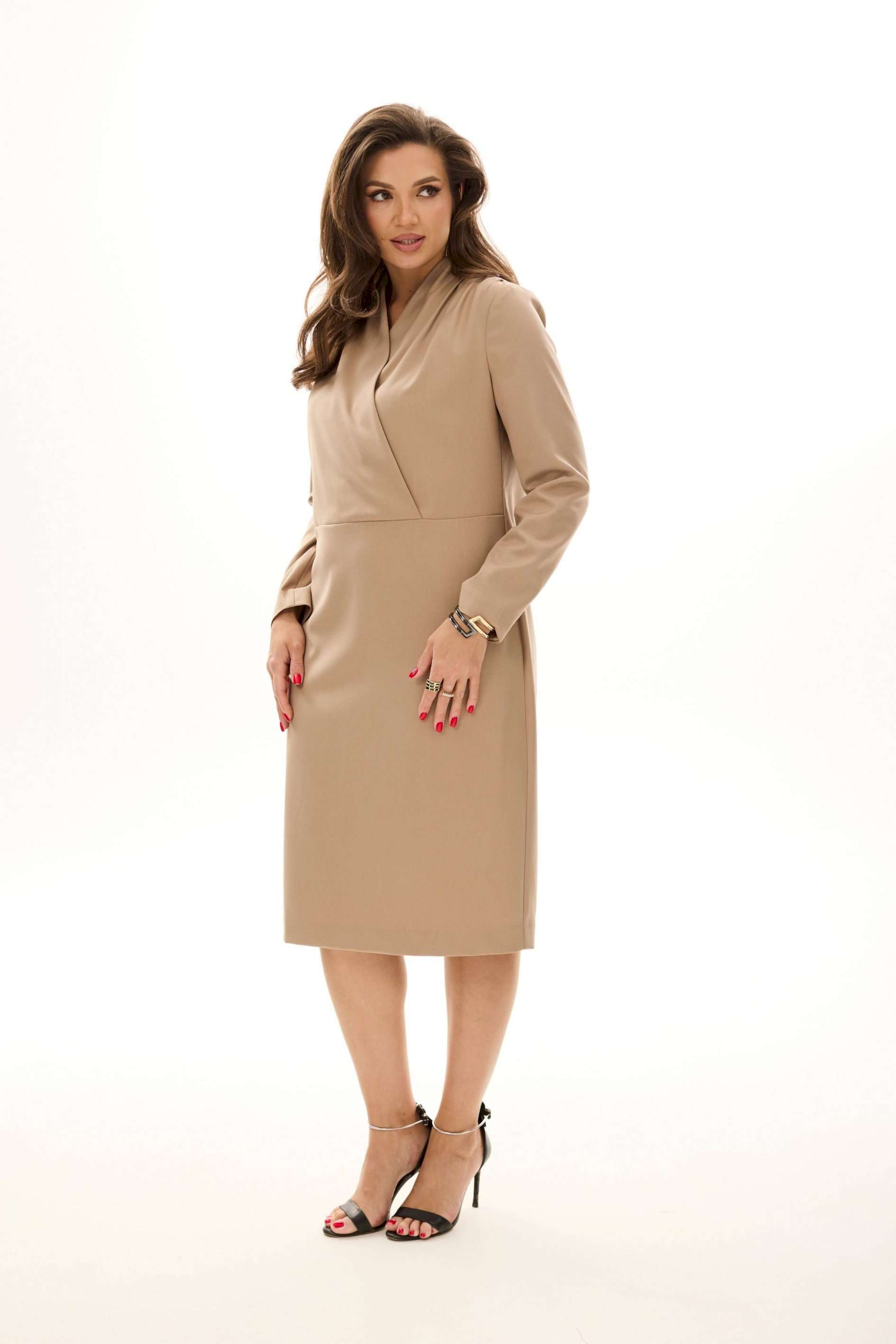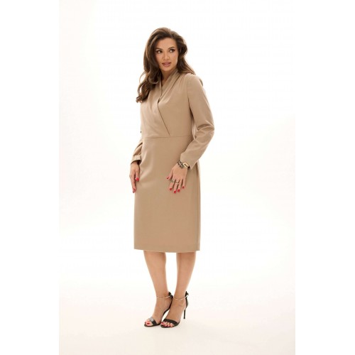 Платье прямого силуэта. По переду отрезное по линии талии. Лиф платья имитирует запах. Горловина с цельновыкроенной стойкой. по плечевым швам сборка. По спинке средний шов с застежкой на молнию, снизу шлица. Рукав втачной, зауженный книзу.