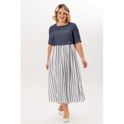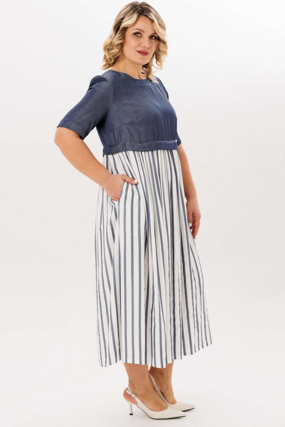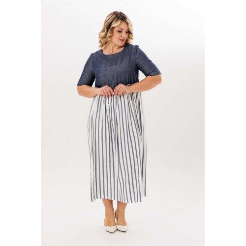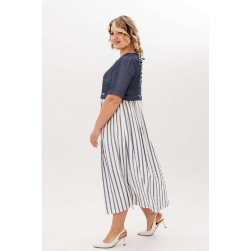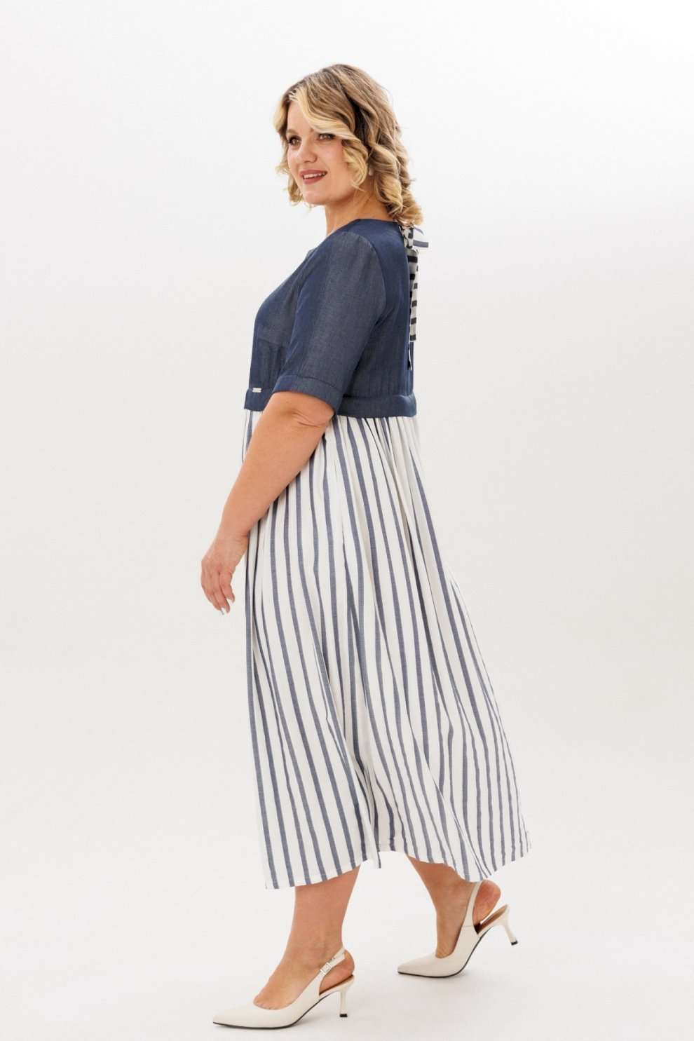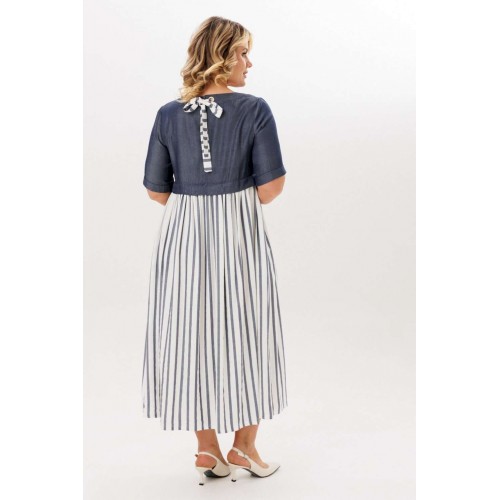 Платье 2197 деним + полоска Michel Chic объединяет лёгкость и стиль. Коллекция бренда Michel Chic предлагает использование тонкого денима и лёгкой полоски, украшенной деликатной металлической нитью, создающей мягкий блеск. Верх выполнен из вискозного джинса, что делает его дышащим и комфортным, идеально подходящим для тёплых дней и переходного сезона. Свободный крой и вертикальная полоска юбки визуально вытягивают силуэт, создавая воздушный образ. Аккуратный бант сзади добавляет нотку женственности. Платье подходит для повседневных и летних встреч, обеспечивая стильный облик в городской среде и на отдыхе. Длина платья по спинке составляет 125 см, длина рукава — 31 см.