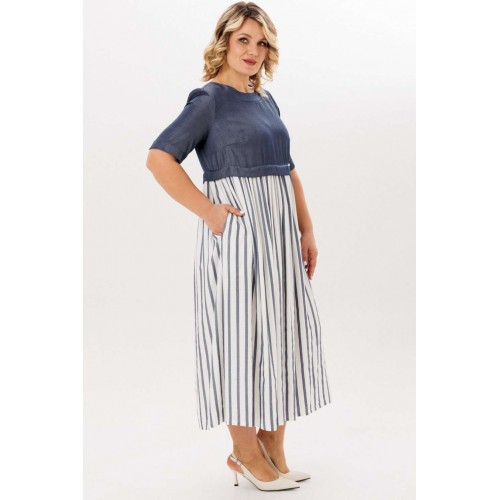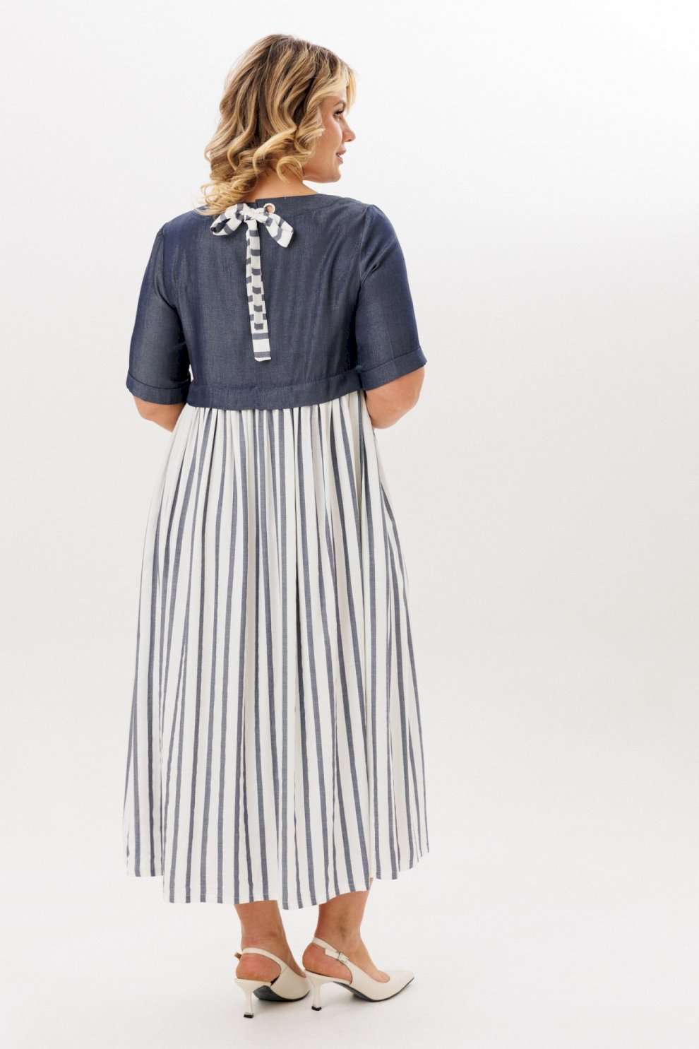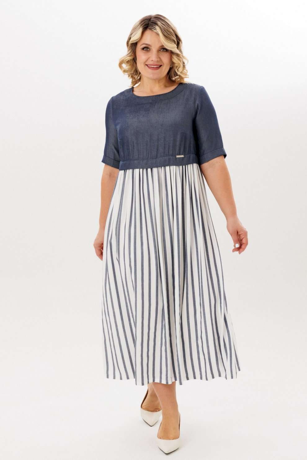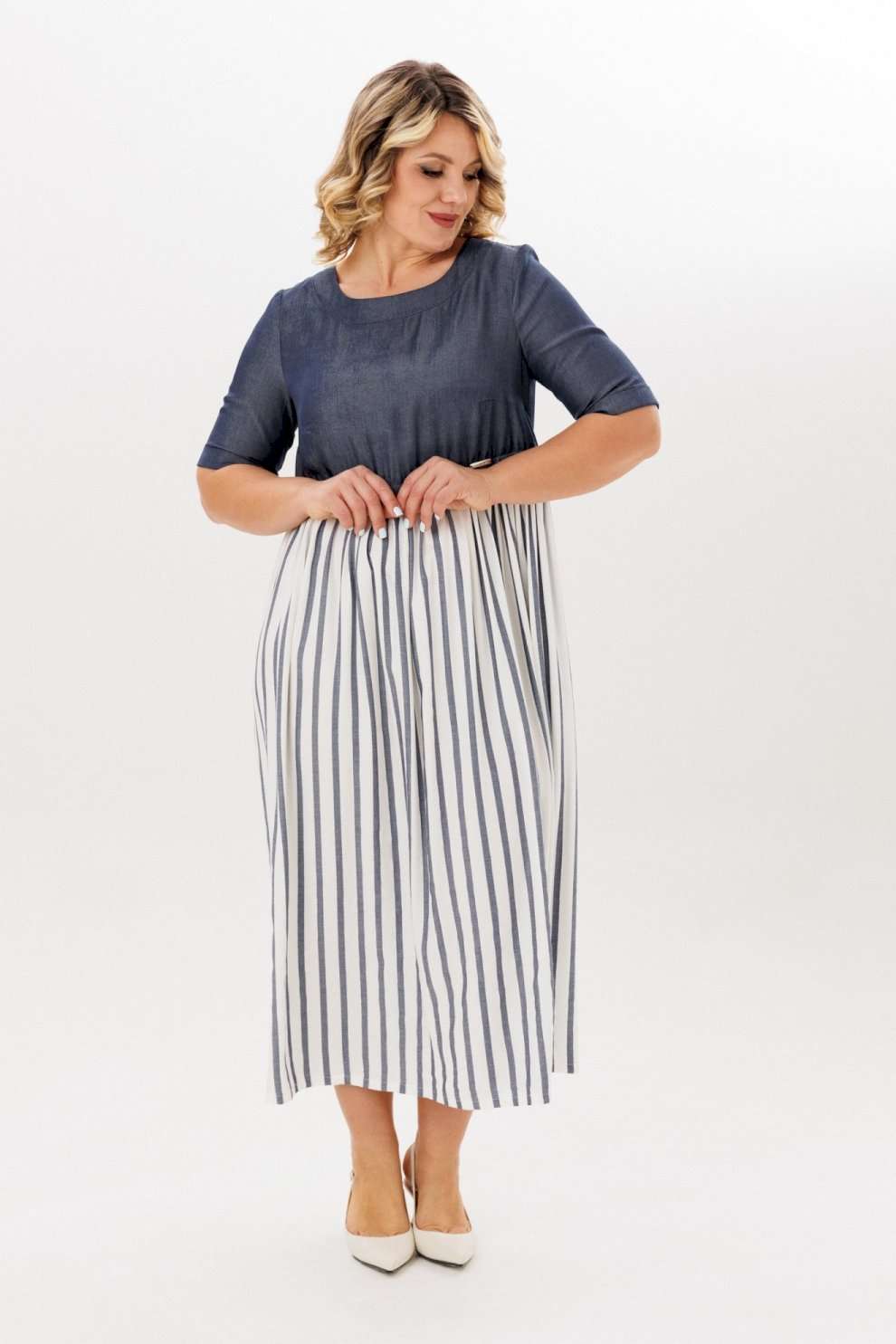 Платье 2197 деним + полоска Michel Chic объединяет лёгкость и стиль. Коллекция бренда Michel Chic предлагает использование тонкого денима и лёгкой полоски, украшенной деликатной металлической нитью, создающей мягкий блеск. Верх выполнен из вискозного джинса, что делает его дышащим и комфортным, идеально подходящим для тёплых дней и переходного сезона. Свободный крой и вертикальная полоска юбки визуально вытягивают силуэт, создавая воздушный образ. Аккуратный бант сзади добавляет нотку женственности. Платье подходит для повседневных и летних встреч, обеспечивая стильный облик в городской среде и на отдыхе. Длина платья по спинке составляет 125 см, длина рукава — 31 см.
