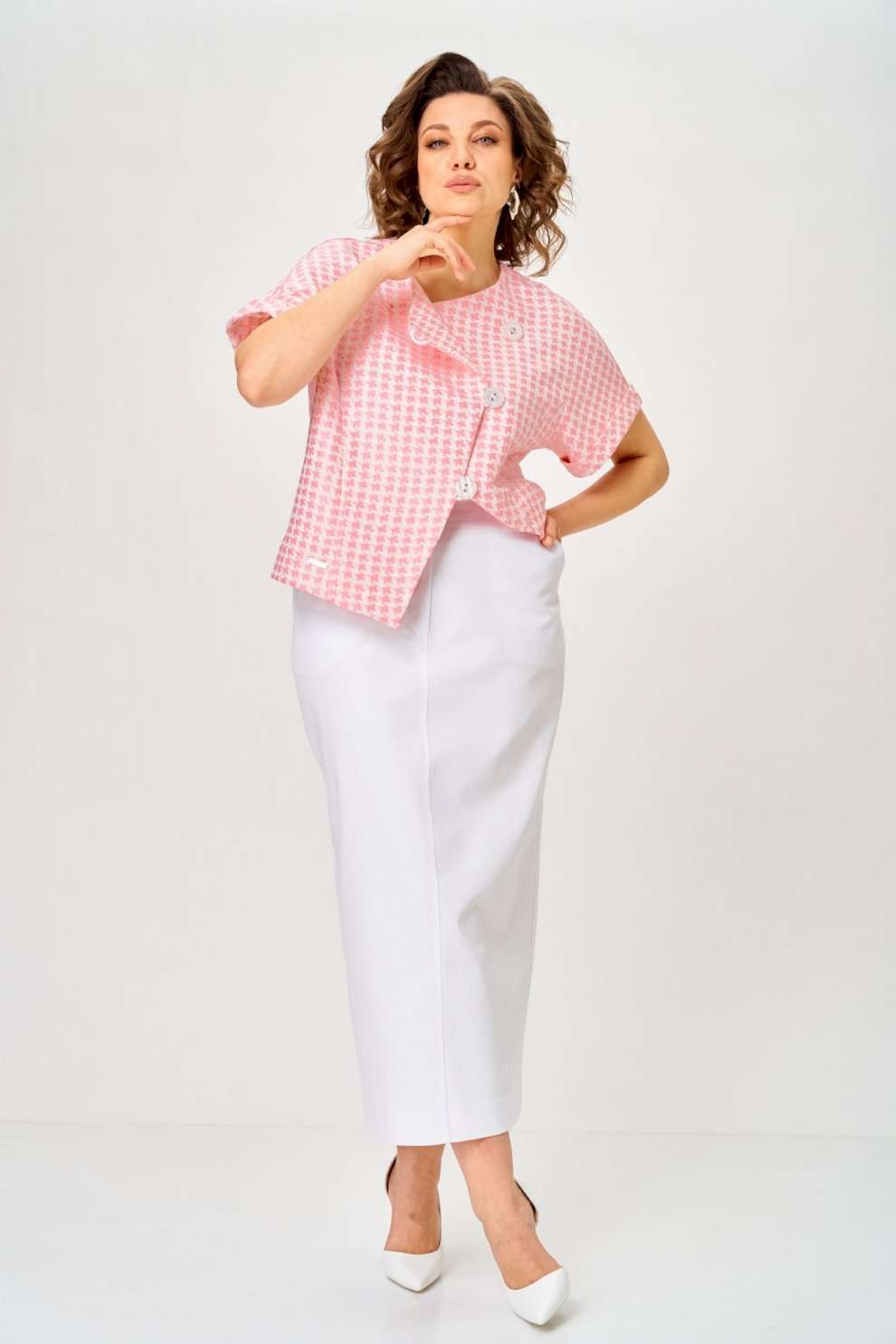 Комплект женский летний для повседневной носки, прекрасно сочетается с любой по стилю обувью и оба изделия комплекта могут смело сочетаться с другими изделиями Вашего гардероба. Жакет укороченный, по переду с ассиметричным запахом и застежкой на подвесные петли с пуговицами. Юбка выполнена из хлопковой ткани, прямая, длина maxi. По переду со средним швом и застежкой на молнию. Спереди два функциональных кармана, задние карманы — имитация. Длина жакета по спинке 55 см, длина рукава 32 см. Длина юбки по боковому шву 94 см. Изделие подойдет на рост 170 см.