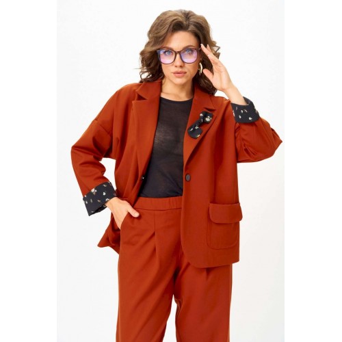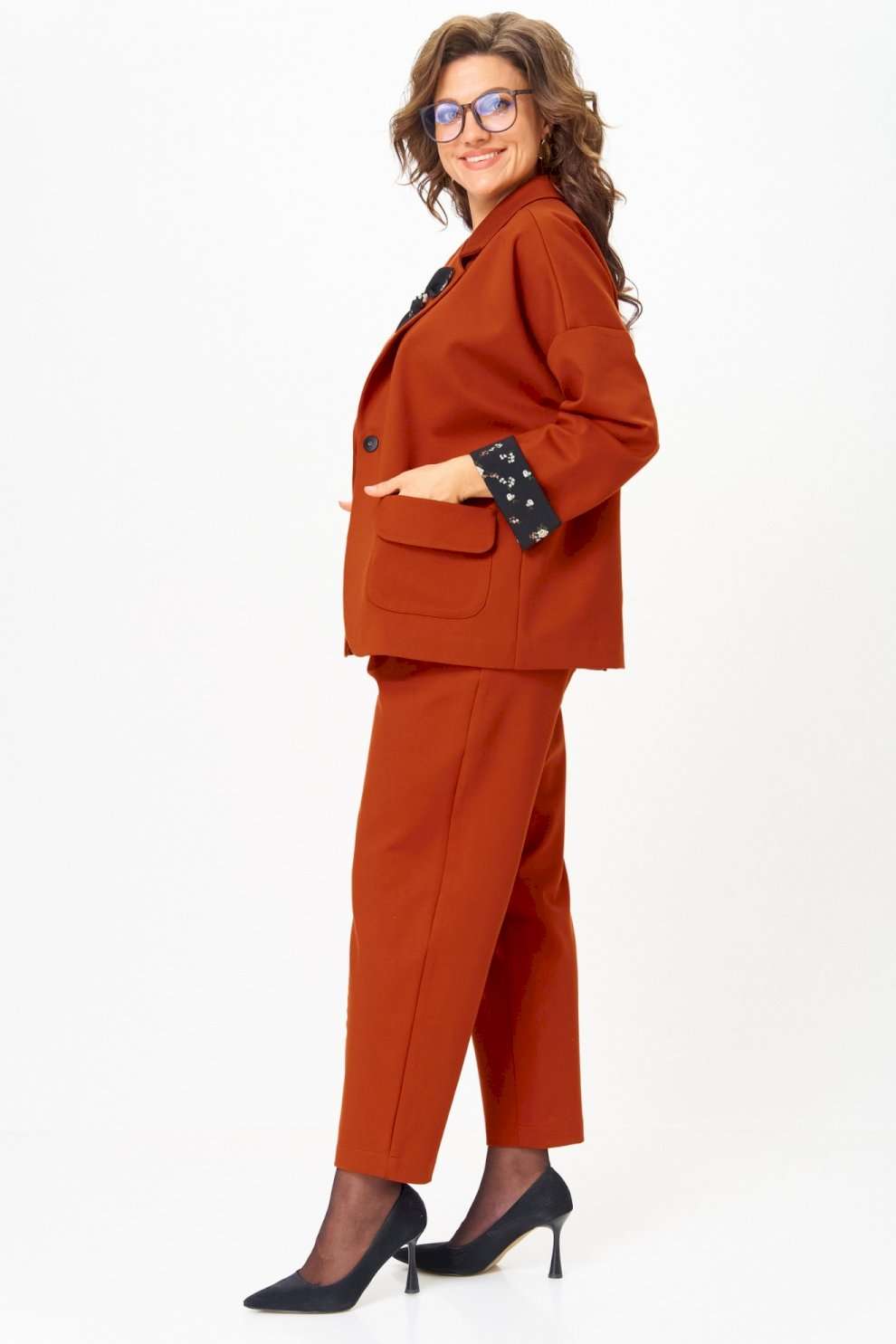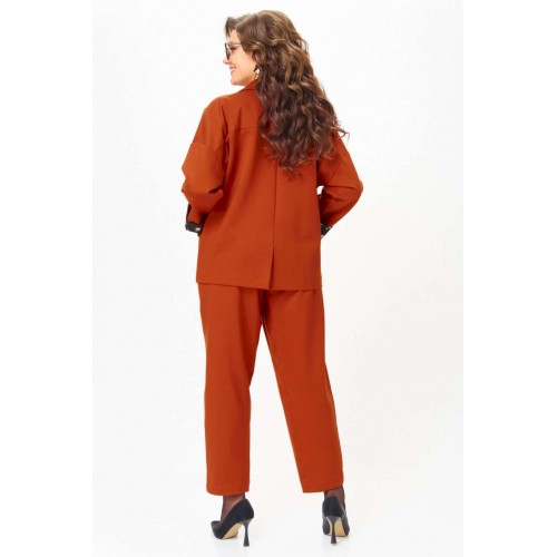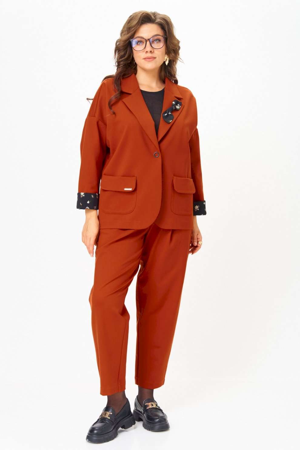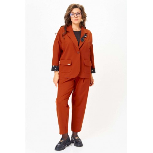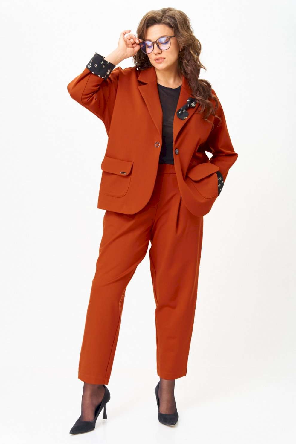 Костюм, который подчеркивает вашу уверенность и женственность. Плотный трикотаж с добавлением нейлона делает его пластичным и износостойким — он держит форму и смотрится дорого в любой ситуации. Богатый карамельный оттенок словно создан, чтобы добавить тепла и выразительности в повседневность, а изящная отделка текстилем и контрастные детали на лацкане и манжетах превращают образ в по-настоящему уникальный. Почему стоит взять: ◾ Плотный трикотаж с нейлоном: сохраняет форму, долго выглядит как новый. ◾ Элегантный жакет с акцентами и удобные брюки с подворотом — гармоничный дуэт для офиса и города. ◾ Цвет карамели делает образ тёплым и стильным, подчёркивая вкус и уверенность. ◾ Контрастные манжеты и бантик на лацкане добавляют характер и шарм. ◾ Подходит как для деловых встреч, так и для уютных вечеров. ◾ Простота в уходе: рекомендуем деликатную химчистку для сохранения первозданного вида. Этот костюм создан для женщин, которые хотят быть вне конкуренции — он помогает сиять и чувствовать себя на высоте в любой ситуации. Длина жакета по спинке 66 см +\\- 1 см, длина рукава 60/67 +\\- 1-2 см. Длина брюк по шаговому шву 69 см +\\- 1 см, по боковому шву 97 см +\\- 1см. Изделие подойдет на рост 170 см.