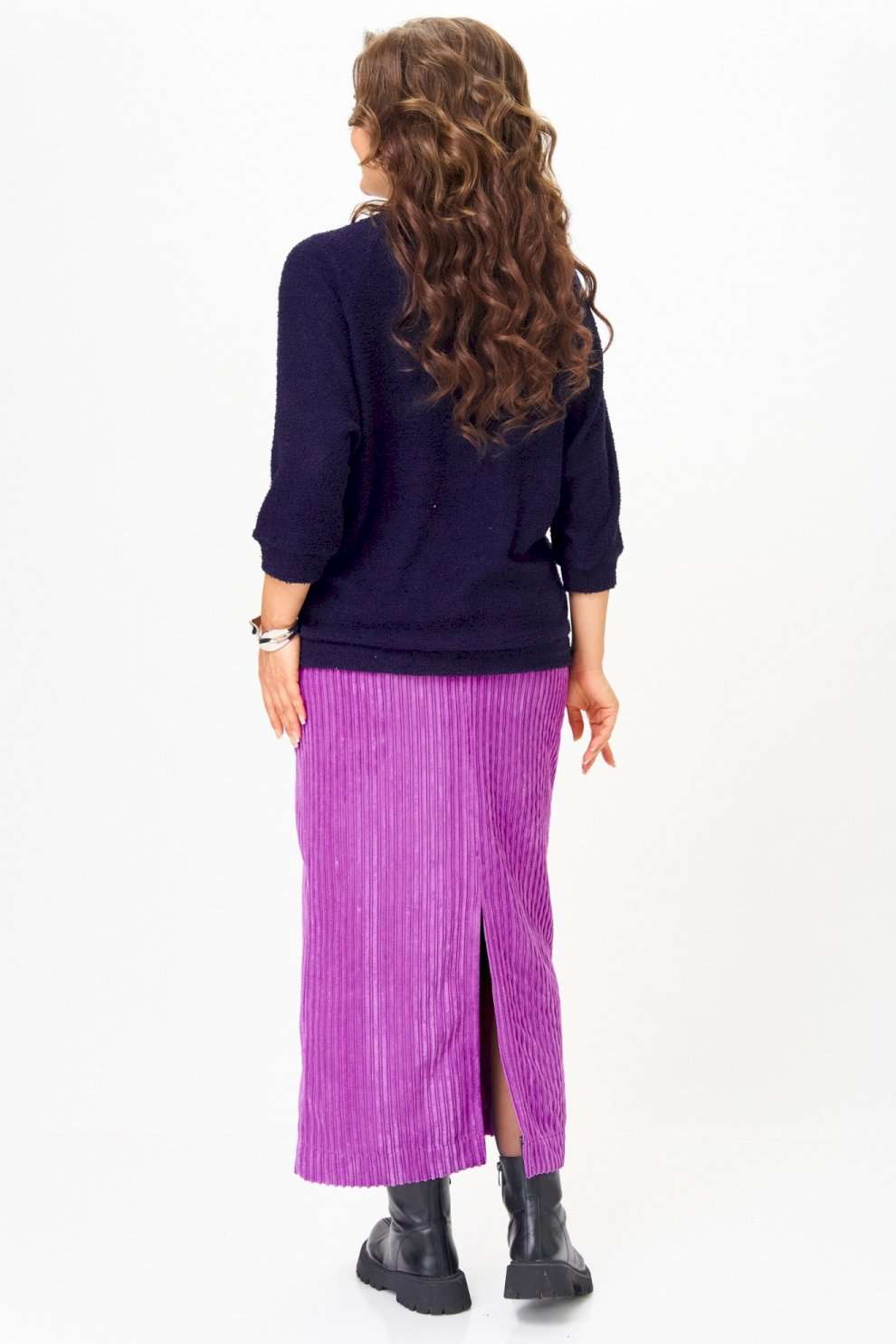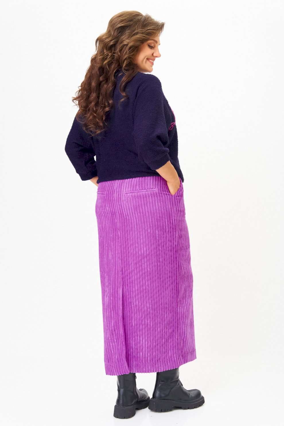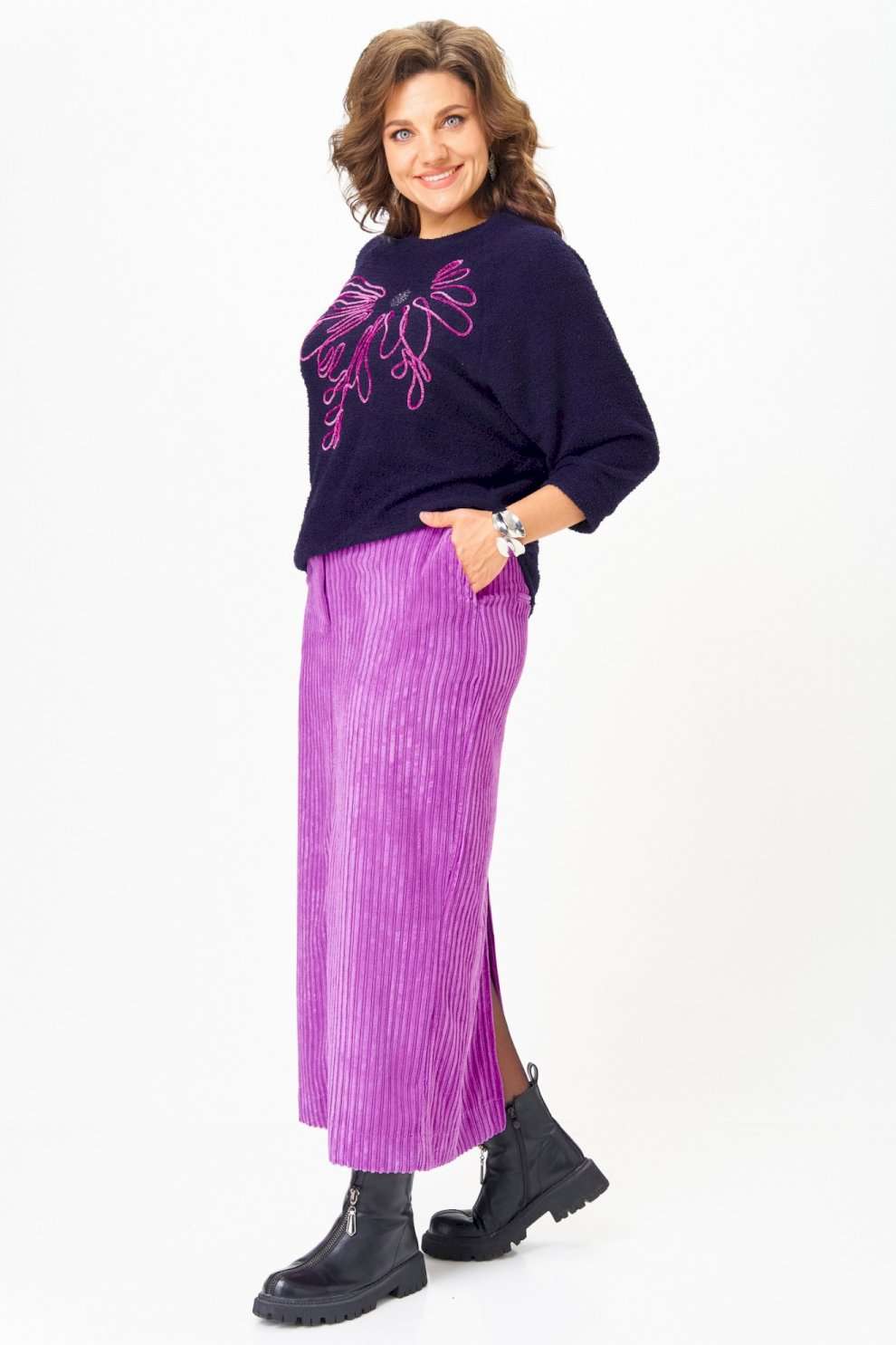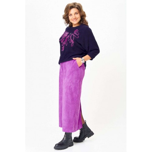 Этот элегантный и модный комплект станет ярким акцентом в вашем гардеробе! Комплект включает в себя яркий пурпурный джемпер с рукавами реглан «летучая мышь» и изящную юбку в темно-синих тонах, выполненную из мягкого, приятного к телу вельвета. ◾Пурпурный джемпер украшен изящной вышивкой, придавая образу оригинальность и шарм. Его рукава реглан «летучая мышь» создают ощущение легкости и современности, а яркий цвет подчеркнет вашу индивидуальность и добавит яркости в любой образ. ◾Юбка из плотного вельвета в рубчик не только выглядит очень стильно, но и визуально удлиняет силуэт, делая ваш образ более стройным и изящным. Эта универсальная модель отлично садится по фигуре, подчеркнет достоинства и обеспечит комфорт в течение всего дня. Весь этот ансамбль — идеальный выбор для тех, кто ценит современный стиль, качество и комфорт. Дополнив его подходящими аксессуарами, вы легко создадите эффектный образ для повседневных дел, деловых встреч или особых мероприятий. Такой комплект подчеркнет вашу индивидуальность и позволит выглядеть безупречно в любой ситуации. Преобразите свой гардероб уже сегодня — выберите универсальный и яркий костюм, который всегда поможет оставаться в тренде! Длина джемпера по спинке 65 см+\\- 1 см, длина рукава от горловины 62 см +\\- 1 см. Длина юбки по боковому шву 96 см+\\- 1 см. Изделие подойдет на рост 170 см.