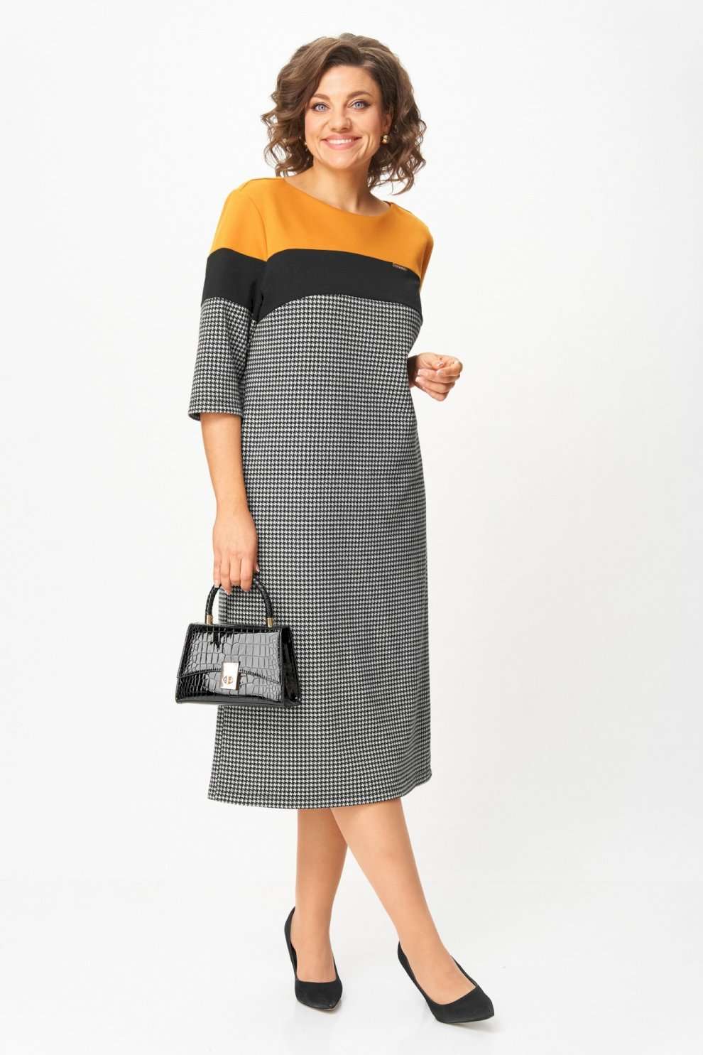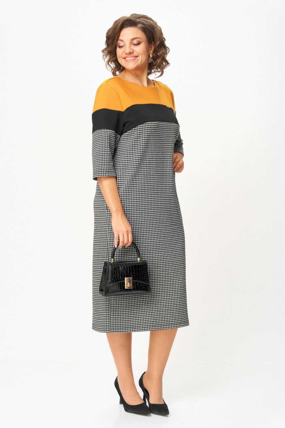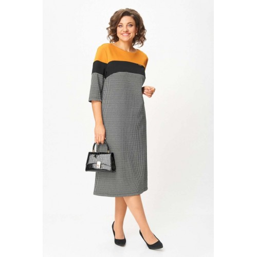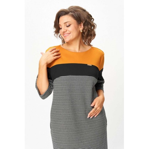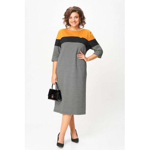 Платье “Шарм и уверенность” Это платье создано для женщин, которые выбирают комфорт и элегантность каждый день. Плотный трикотаж высокого качества мягко обнимает фигуру, не теряя форму, не вытягивается и не просвечивает. Контрастное сочетание горчичного, чёрного и классического принта “гусиная лапка” визуально стройнит и освежает образ. Рукав ¾ и длина миди делают модель практичной и универсальной — удобно и в офисе, и на прогулке, и на встрече. Почему стоит взять: Плотный эластичный трикотаж — не мнётся, держит форму, приятен к телу. ◾ Эффектное цветовое решение визуально вытягивает силуэт. ◾ Комфортная длина и рукав ¾ — идеальны на межсезонье. ◾ Универсальная модель: для работы, города, торжества. ◾ Подходит для любого возраста — от молодой девушки до зрелой женщины. Маст-хэв гардероба: платье, которое не требует усилий, но всегда выглядит безупречно. Надень — и ты уже готова покорять день с чувством уверенности и внутреннего света. Изделие подойдет на рост 170 см.