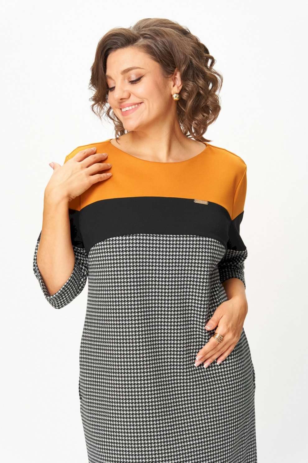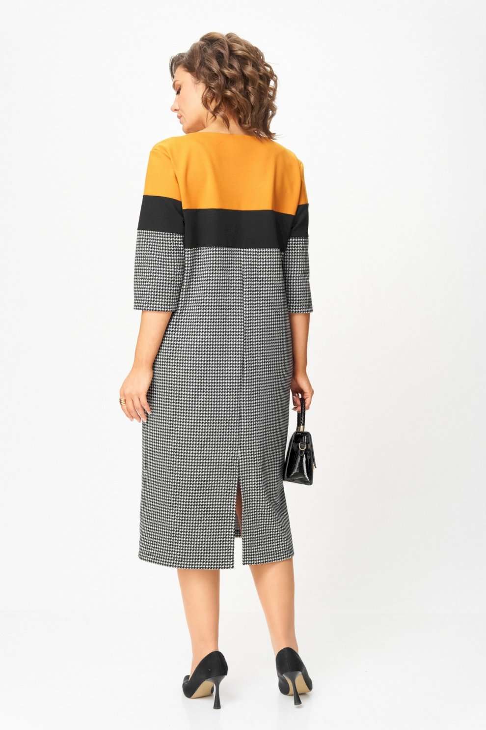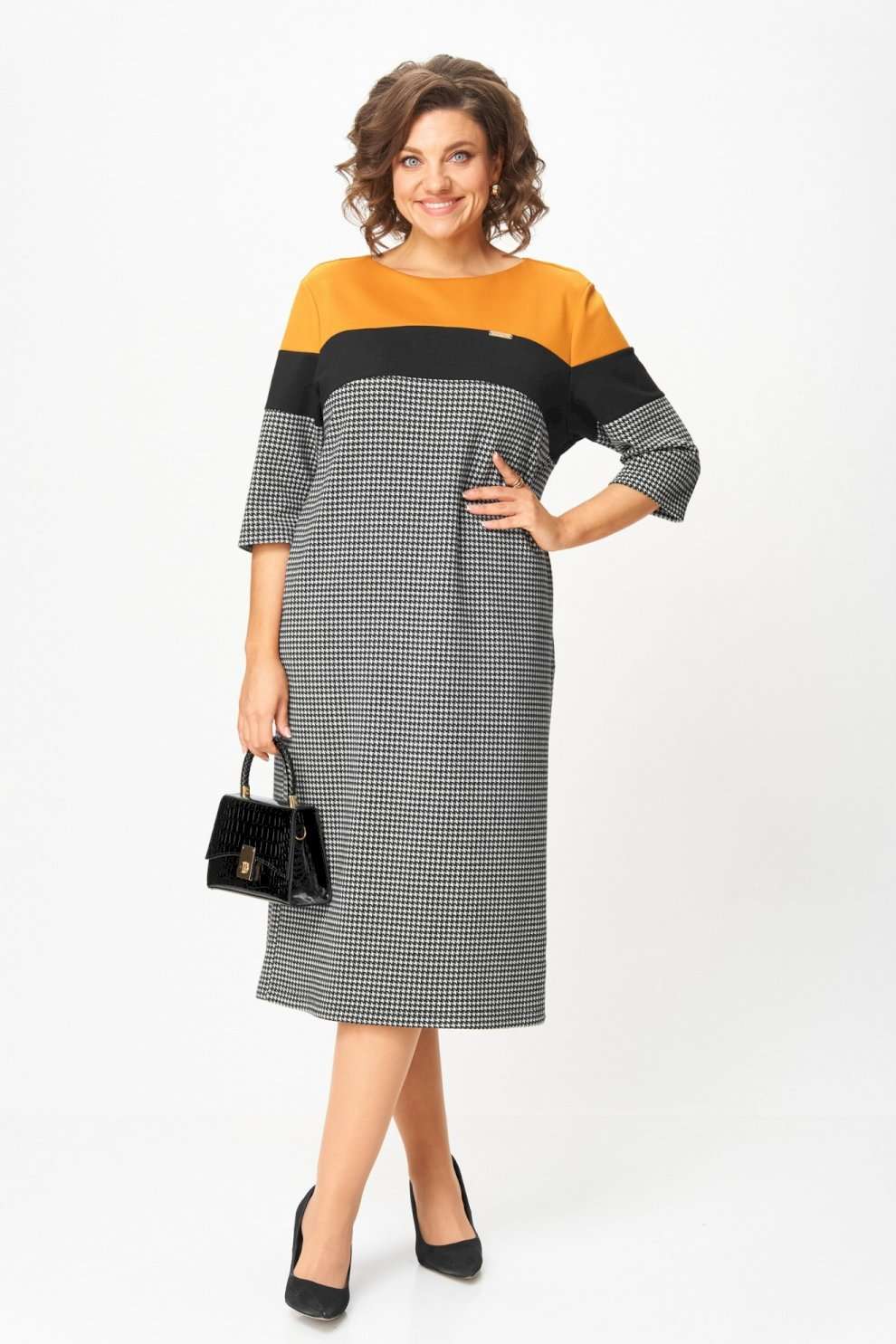 Платье “Шарм и уверенность” Это платье создано для женщин, которые выбирают комфорт и элегантность каждый день. Плотный трикотаж высокого качества мягко обнимает фигуру, не теряя форму, не вытягивается и не просвечивает. Контрастное сочетание горчичного, чёрного и классического принта “гусиная лапка” визуально стройнит и освежает образ. Рукав ¾ и длина миди делают модель практичной и универсальной — удобно и в офисе, и на прогулке, и на встрече. Почему стоит взять: Плотный эластичный трикотаж — не мнётся, держит форму, приятен к телу. ◾ Эффектное цветовое решение визуально вытягивает силуэт. ◾ Комфортная длина и рукав ¾ — идеальны на межсезонье. ◾ Универсальная модель: для работы, города, торжества. ◾ Подходит для любого возраста — от молодой девушки до зрелой женщины. Маст-хэв гардероба: платье, которое не требует усилий, но всегда выглядит безупречно. Надень — и ты уже готова покорять день с чувством уверенности и внутреннего света. Изделие подойдет на рост 170 см.