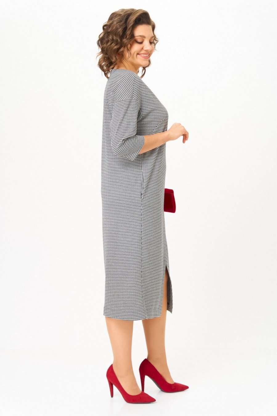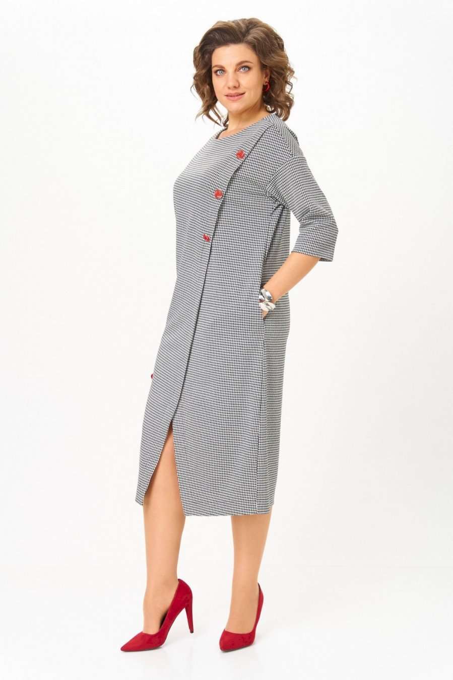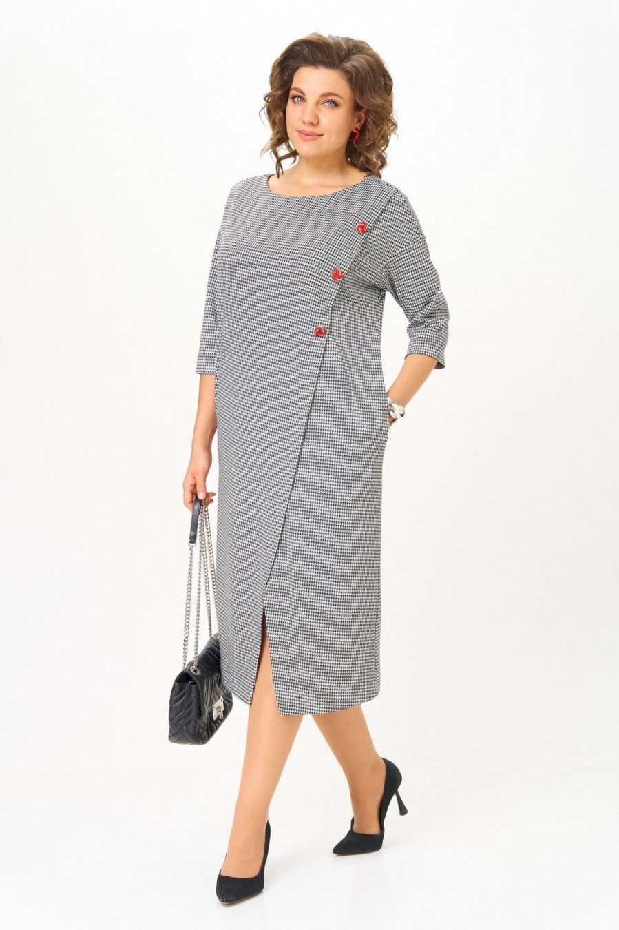 Это платье создано для женщины, которая выбирает уверенность, комфорт и безупречный вкус. Трикотаж с мелким твидовым узором мягко держит форму, не подчеркивая лишнего и создавая элегантный силуэт. А имитация асимметричной застёжки с декоративными пуговицами добавляет изюминку и визуально вытягивает фигуру. Почему это мастхэв: Глубокий, благородный цвет, который подчёркивает красоту любого типа внешности. Универсальный крой — идеально садится на любую фигуру, превращая каждую женщину в богиню. Декоративные пуговицы создают акцент и утонченность без лишнего блеска. Трикотаж средней плотности — не мнётся, комфортен, приятен к телу. Подходит для офиса, прогулок и особых случаев — всё зависит от настроения и аксессуаров. Лёгкий разрез спереди добавляет женственности и свободы движения. Длина платья по спинке 115 см +\\- 1 см, длина рукава 50 см +\\-1 см. Изделие подойдет на рост 170 см.