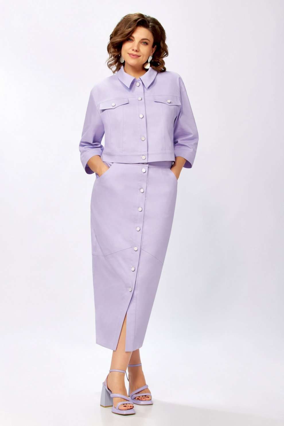 Джинсовый комплект, состоит из юбки и куртки, выполнен из однотонного джинса и джинса с рваным эффектом. Джинсовая куртка выполнена в классическом стиле трендовых джинсовок. Горловина обработана втачным воротником, застежка по переду на планку с пуговицами. На полочке выполнена кокетка из однотонного джинса, рельефы и клапан из джинса с рваным эффектом, по низу планка из однотонного джинса. Спинка также с кокеткой из однотонного джинса, нижняя часть спинки из джинса с рваным эффектом. Рукав втачной, длиной 3/4, выполнен из джинса с рваным эффектом, по низу на манжете из однотонного джинса. Юбка с застежкой по переду на планку с пуговицами, верхний срез обработан притачным поясом, в боковых швах карманы. Нижняя часть юбки выполнена из джинса с рваным эффектом, заднее полотнище юбки идентично переду, также обработана кокетка с прорезными карманами с листочкой. Эффектный и супер-трендовый комплект может сочетаться с другими вещами вашего гардероба! Это отличный вариант, который никогда не выходит из моды! Длина куртки 48см, длина юбки 86см. В 52р Куртка: Ширина груди- 53см, Ширина талии -56см, длина рукава- 42см., ширина рукава 21,5см. Юбка: Ширина талии -46см, Ширина бедер- 57см