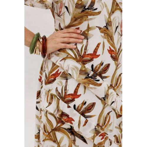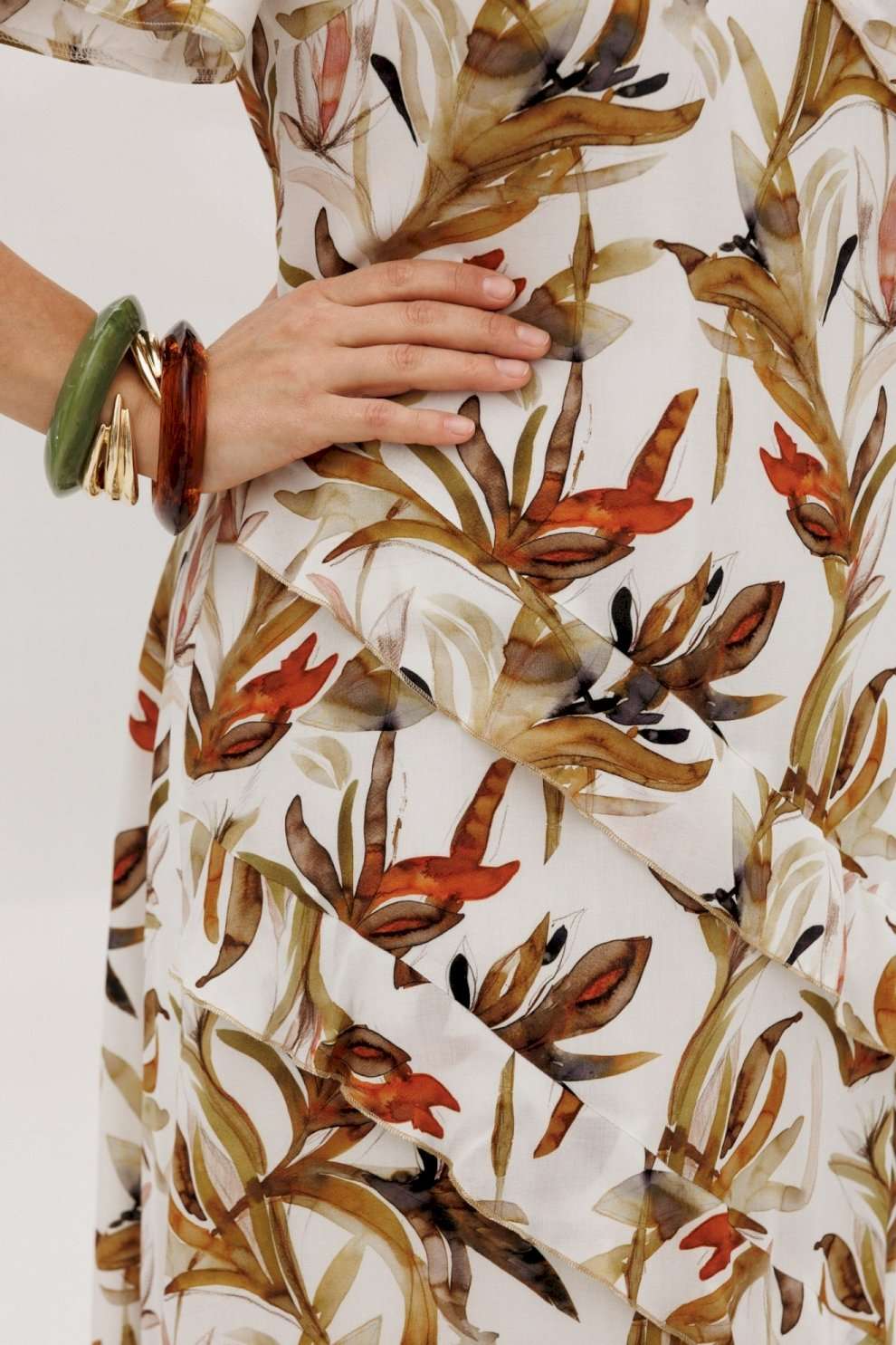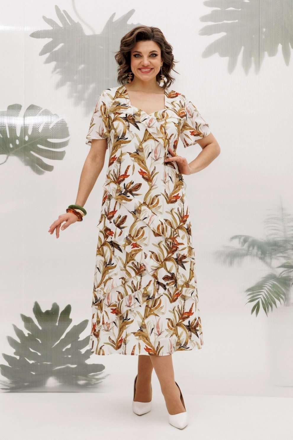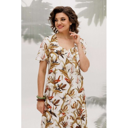 Платье 5673 Mira Fashion — это легкое летнее платье из коллекции бренда Mira Fashion, выполненное из 100% вискозы. Мягкий и приятный к телу материал, полу-прилегающий силуэт и расклешенный низ обеспечивают комфорт в жаркие дни. Платье длиной 122 см в размере 52, с фигурной горловиной и кокетками на полочке, украшено воланами и асимметричными подрезами. Втачные расклешенные рукава оптимальной длины и потайная молния на спинке добавляют изящества и удобства. Эффектный принт в нежных оттенках подойдет для летнего отдыха и прогулок.