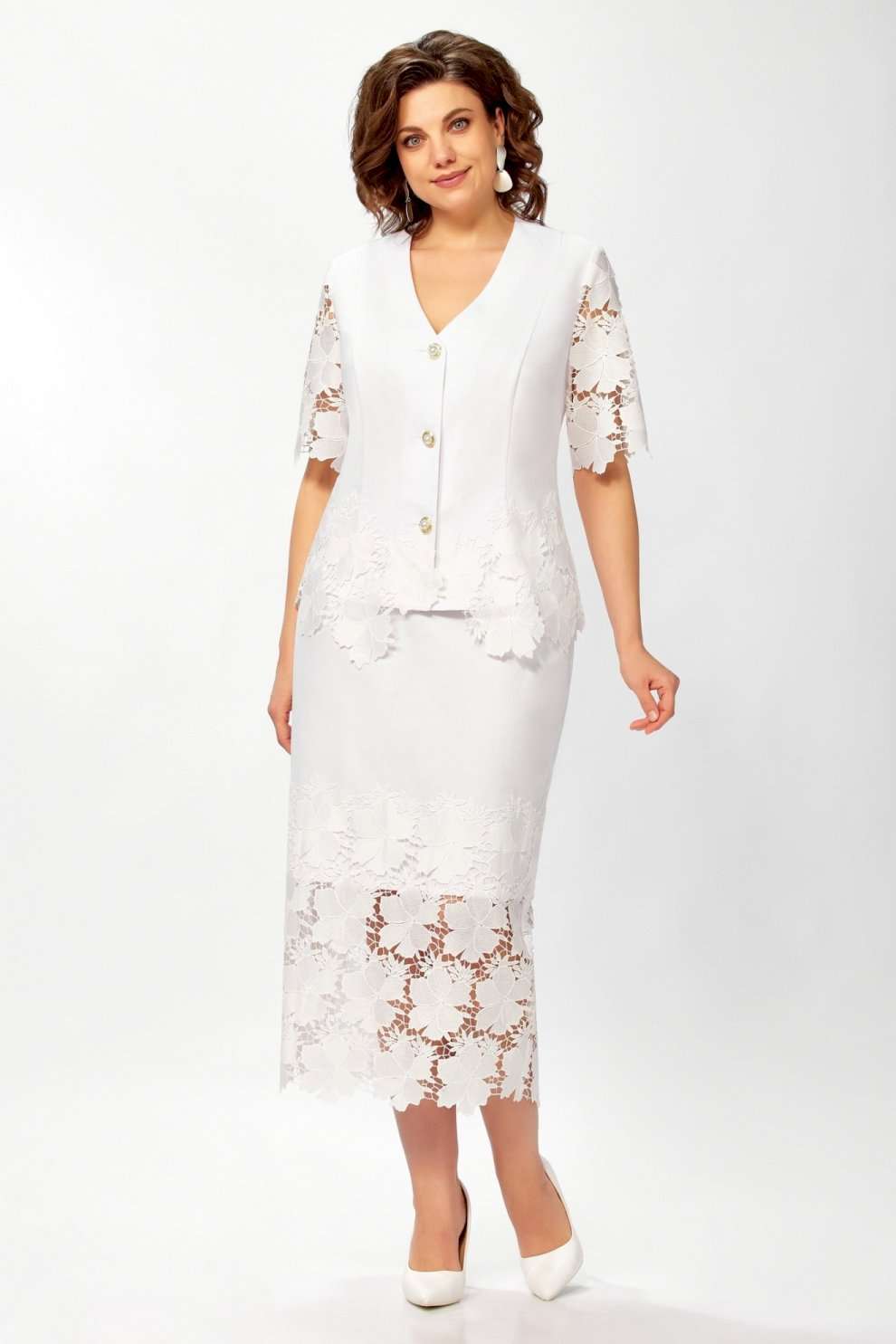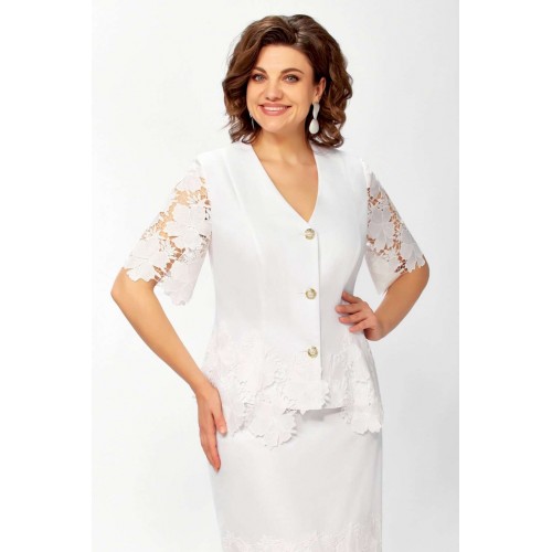 Костюм с юбкой 5682 Mira Fashion — стильный ансамбль, который выделяется своей универсальностью и изяществом. Коллекция бренда Mira Fashion предлагает костюм из джинса и кружева, придавая образу утонченность. Жакет прилегающего силуэта оснащён пуговицами и украшен кружевом в нижней части, создавая эффектный акцент. V-образный вырез горловины дополняет его женственность. Оптимальная длина втачного кружева на рукавах делает костюм элегантным выбором как для повседневных, так и праздничных мероприятий. Белый цвет костюма подчеркивает свежесть образа. Длина жакета составляет 58см, а юбки — 85см, что делает данный комплект подходящим для межсезонья.