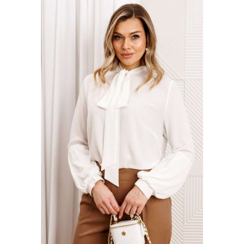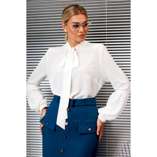 Стильная блуза - необходимая вещь базового гардероба современной женщины. Она позволяет легко составлять нарядные, деловые и повседневные образы. Блузка выполнена из легкой, приятной к телу блузочной ткани. Полуприлегающего силуэта. По переду нагрудные вытачки. По спинке талиевые вытачки. Воротник-стойка, переходящая в завязку \"бант\". Фантазийный рукав на манжете. Длина блузы: 66 см