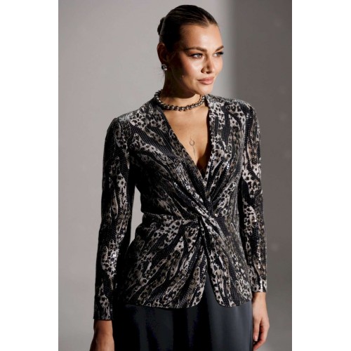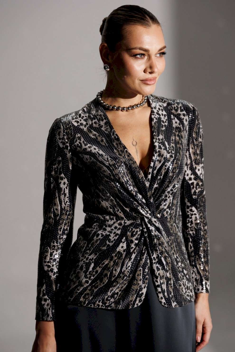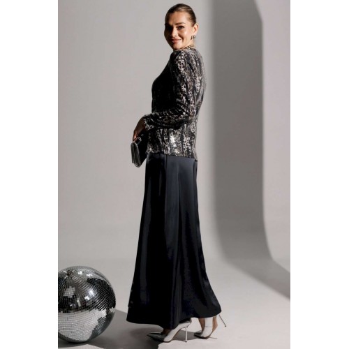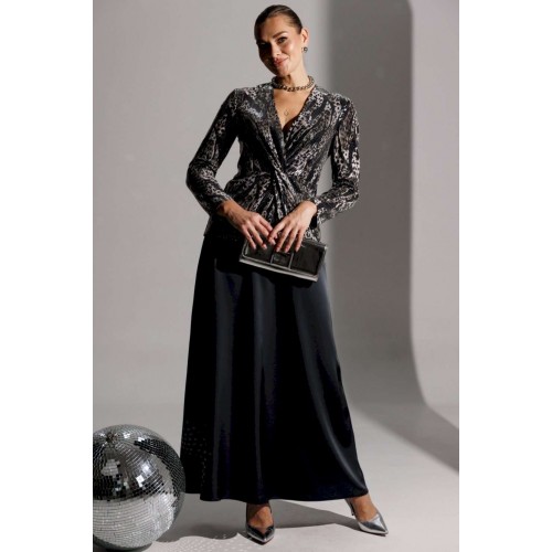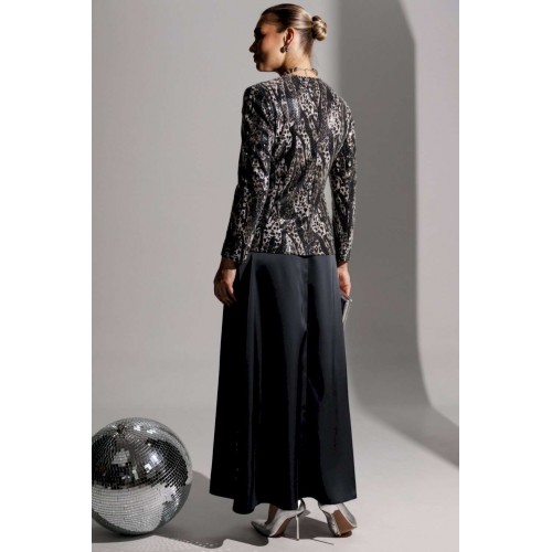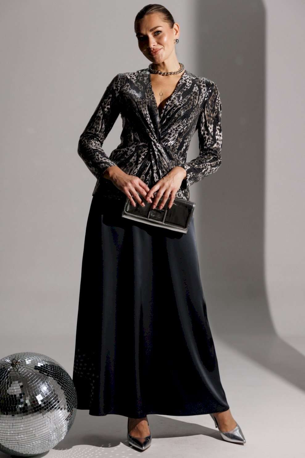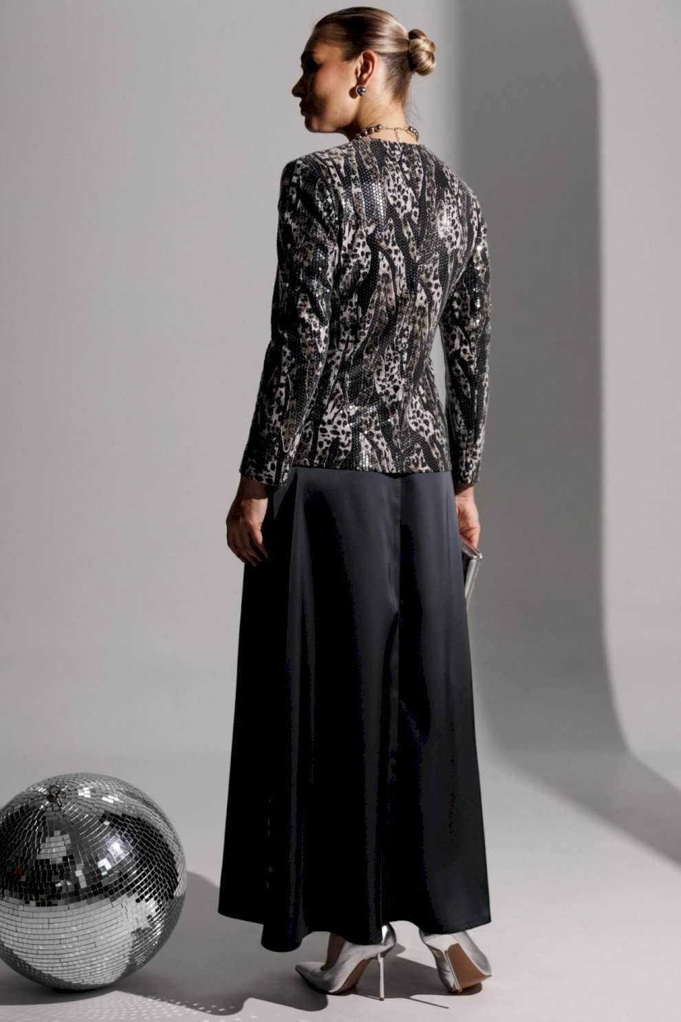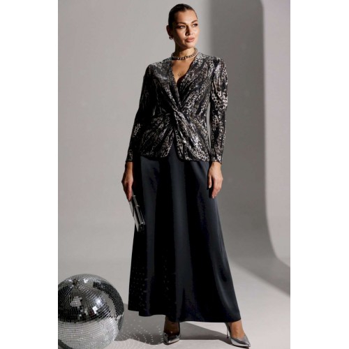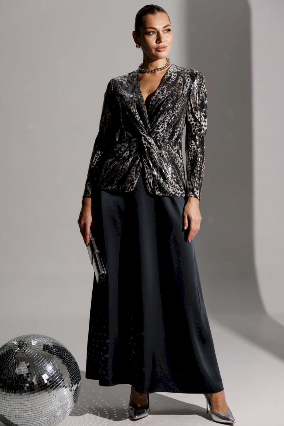 Продолжением нашей нарядной коллекции является роскошный комплект, состоящий из блузы, имитирующей жакет, и невероятной струящейся юбки из атласа длины макси. Блуза из ткани в пайетки с декоративным узлом в области талии. V-образный вырез. Блуза приталенного силуэта с втачными, двухшовными рукавами. Блуза частично на подкладке. Юбка на поясе с резинкой. Длина спинки блузона: 62 см длина рукава: 57 см длина юбки по боковому шву: 102см