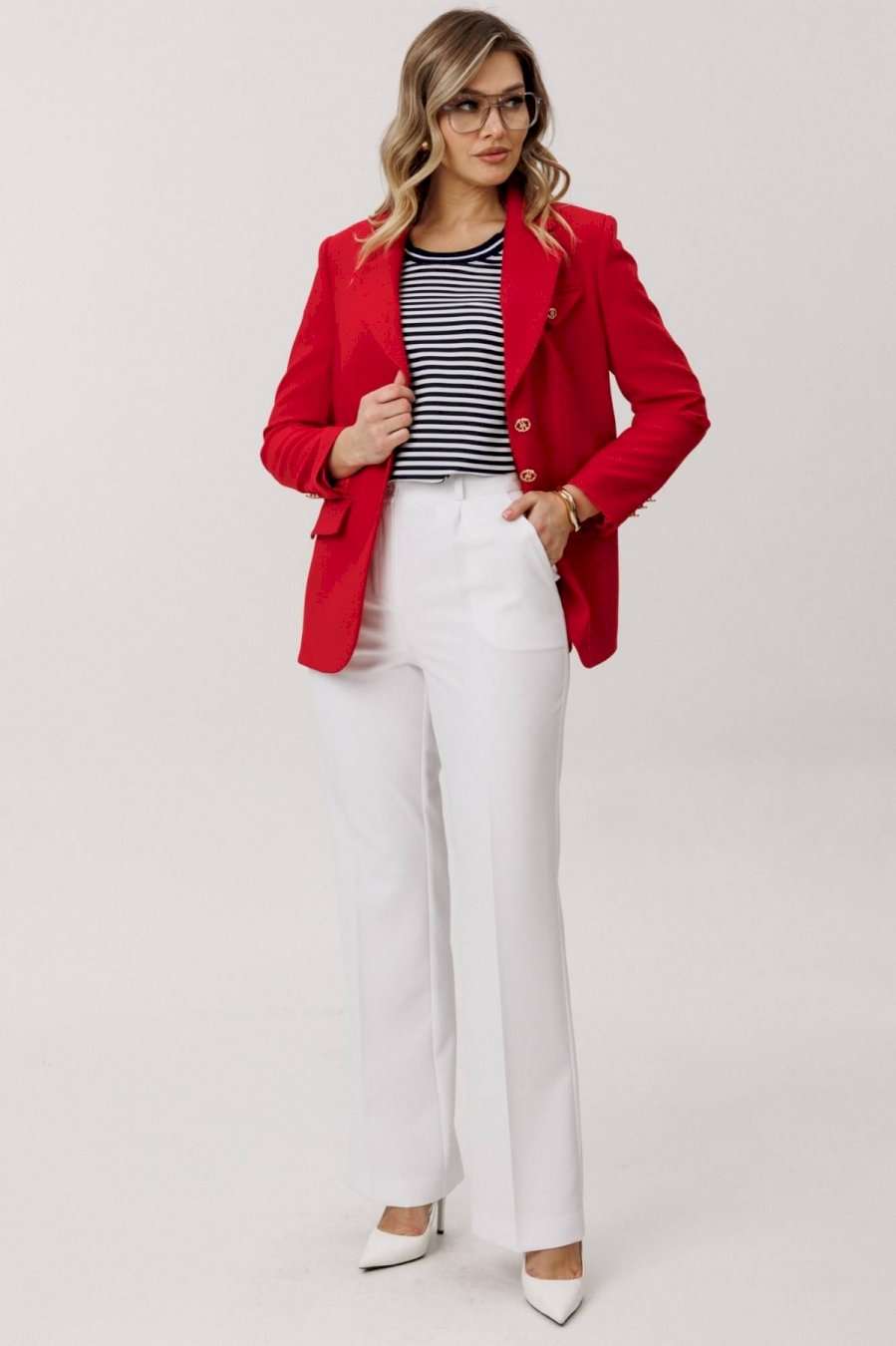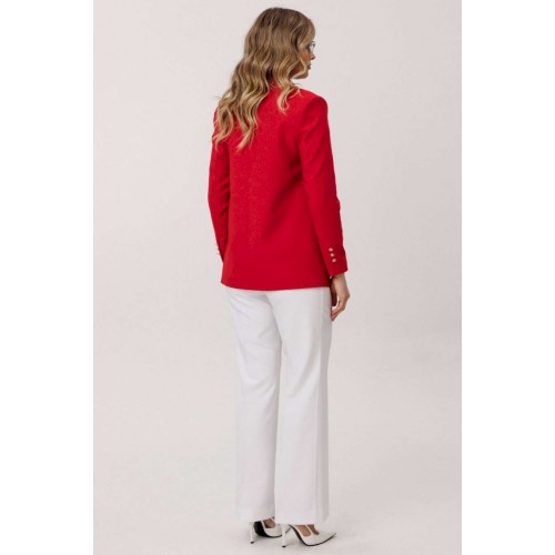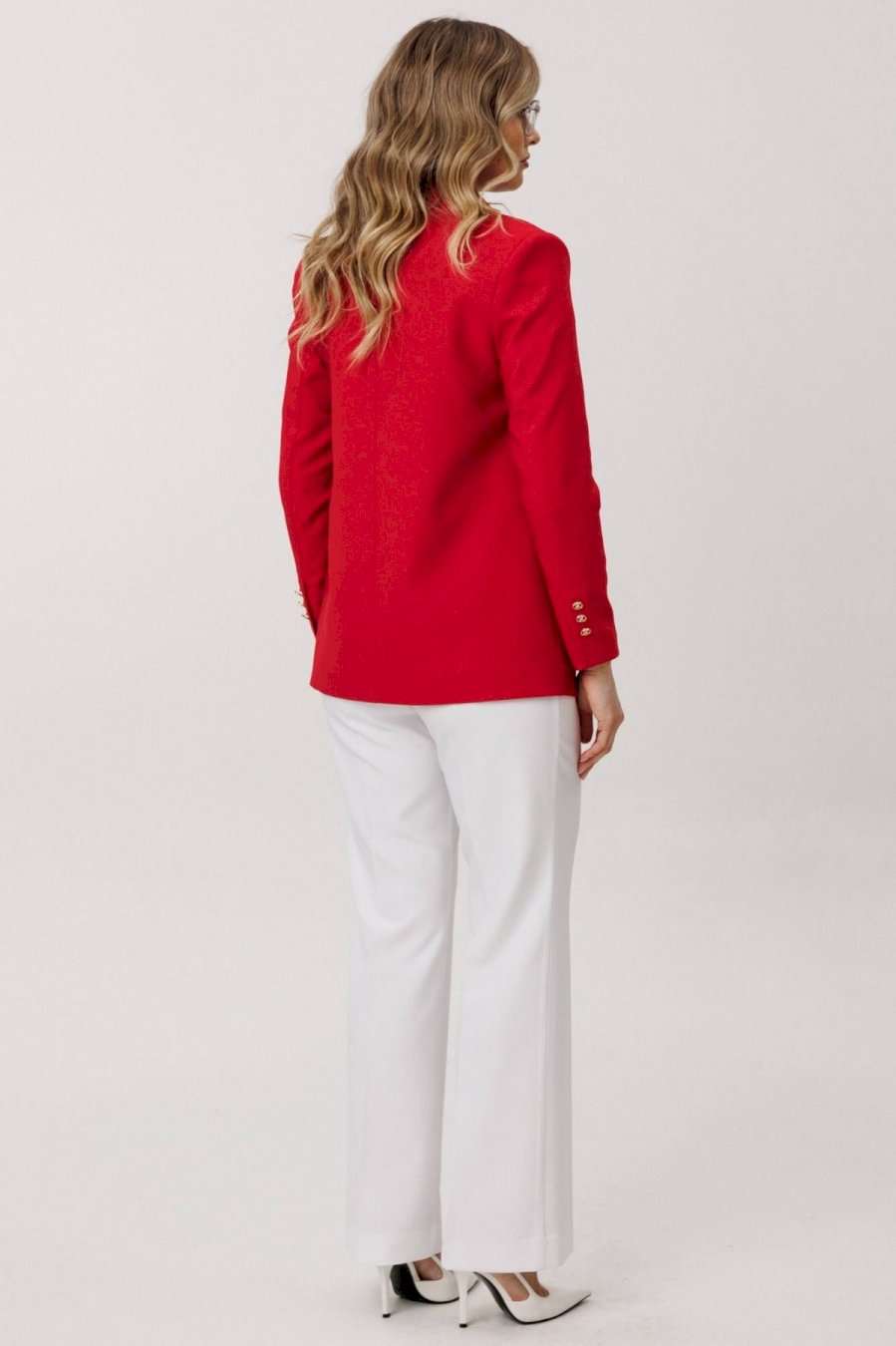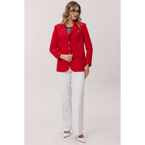 Трехпредметный комплект, который состоит из жакета, топа и брюк. Жакет полуприлегающего силуэта, с талиевыми вытачками. Спинка со средним швом. Рукав втачной, двухшовный. Воротник пиджачного типа. Застежка центральная на петли-пуговицы. Топ прямого силуэта, по бокам с разрезами. Рукав одношовный. Вырез горловины округлой формы с довязом по переду. Брюки прямые, чуть зауженные к колену, спереди с карманами, сверху на притачном поясе, сзади с резинкой. длина спинки: 72 см длина рукава : 61 см длина брюк : 109 см