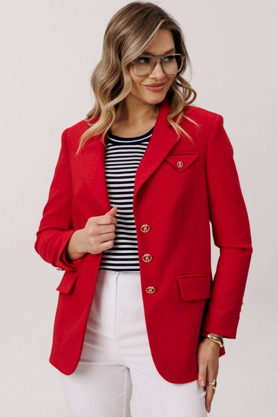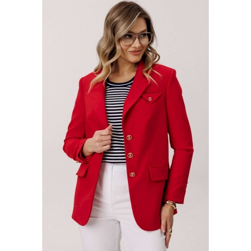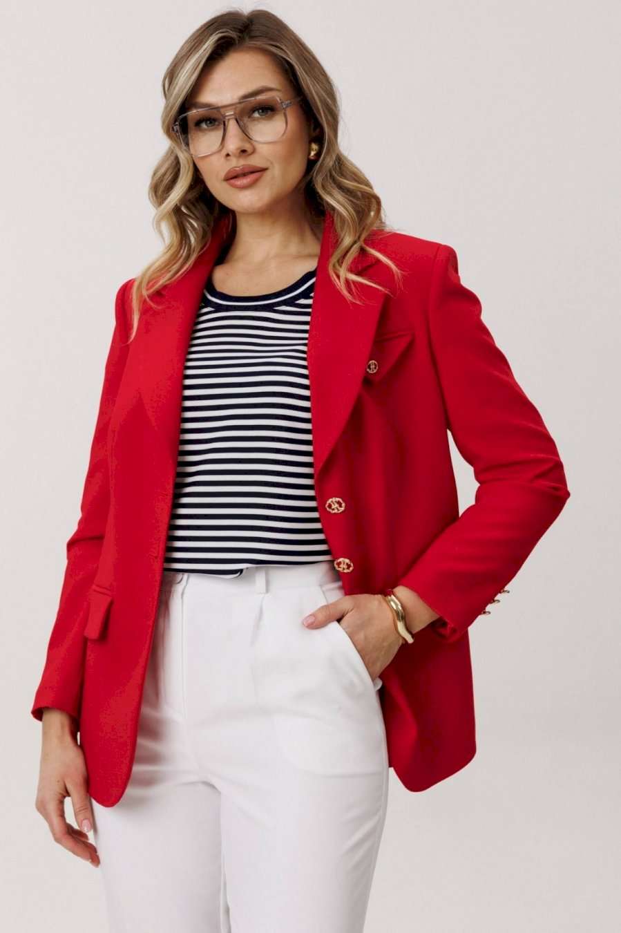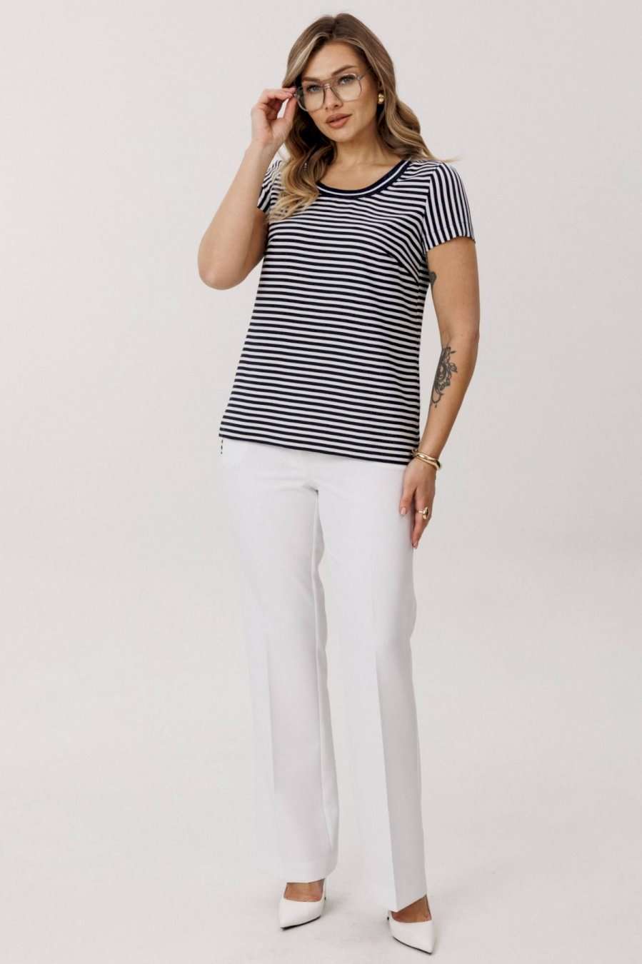 Трехпредметный комплект, который состоит из жакета, топа и брюк. Жакет полуприлегающего силуэта, с талиевыми вытачками. Спинка со средним швом. Рукав втачной, двухшовный. Воротник пиджачного типа. Застежка центральная на петли-пуговицы. Топ прямого силуэта, по бокам с разрезами. Рукав одношовный. Вырез горловины округлой формы с довязом по переду. Брюки прямые, чуть зауженные к колену, спереди с карманами, сверху на притачном поясе, сзади с резинкой. длина спинки: 72 см длина рукава : 61 см длина брюк : 109 см