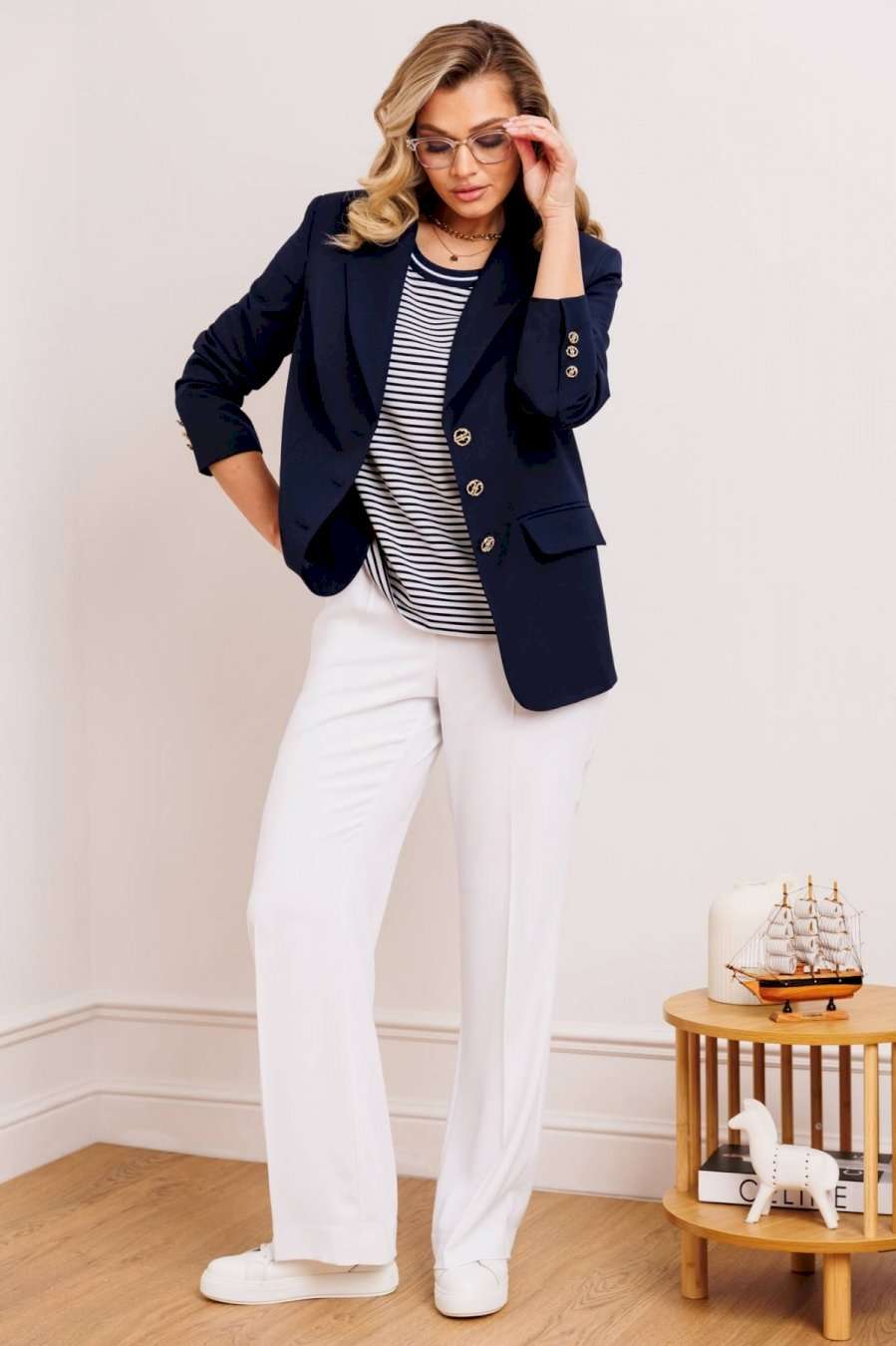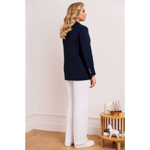 Трехпредметный комплект, который состоит из жакета, топа и брюк. Жакет полуприлегающего силуэта, с талиевыми вытачками. Спинка со средним швом. Рукав втачной, двухшовный. Воротник пиджачного типа. Застежка центральная на петли-пуговицы. Топ прямого силуэта, по бокам с разрезами. Рукав одношовный. Вырез горловины округлой формы с довязом по переду. Брюки прямые, чуть зауженные к колену, спереди с карманами, сверху на притачном поясе, сзади с резинкой. длина спинки: 72 см длина рукава : 61 см длина брюк : 109 см