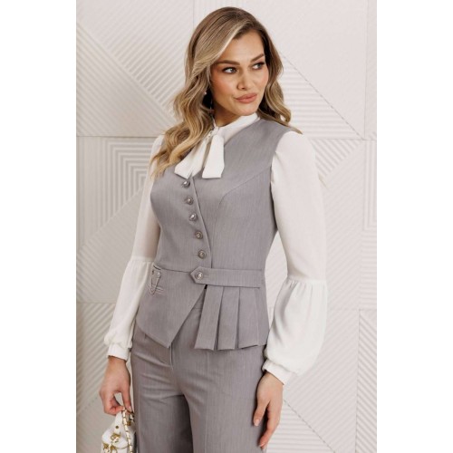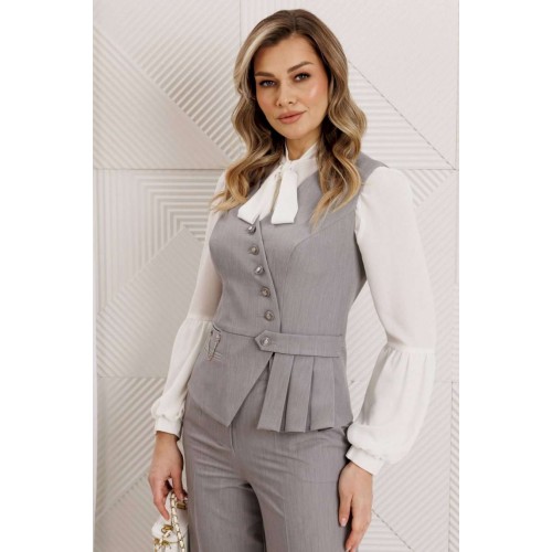 Костюм женский, состоящий из брюк и жилета. Жилет полуприлегающего силуэта с рельефами по переду и спинке, отрезной по линии талии. Низ жилета ассиметричной формы. На баске с одной стороны обработаны прорезные карманы в рамку, один из которых функциональный. Застежка двубортная на петли-пуговицы и декоративную пату. Жилет на подкладке. Брюки прямые, сверху на притачном поясе, сзади с резинкой. На передних половинках обработаны карманы. Застежка на тесьму-молнию. Данный комплект можно дополнить блузой, что позволит Вам создать разные образы. длина жилета: 56,4 см длина брюк: 107см