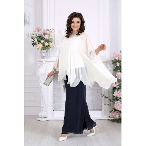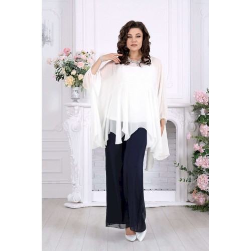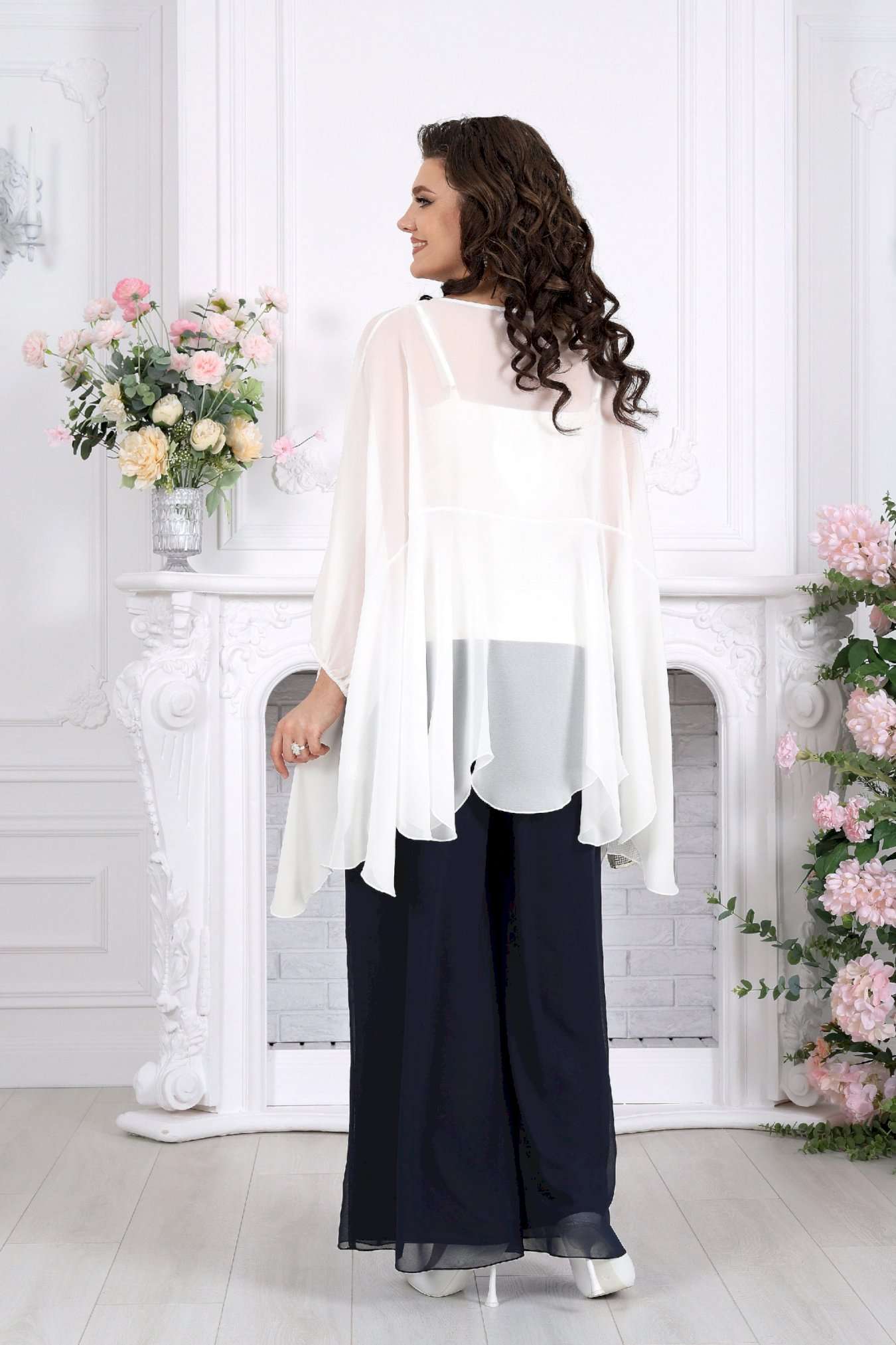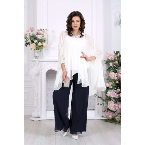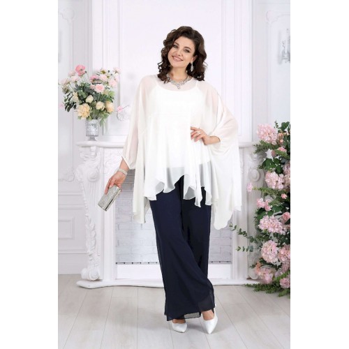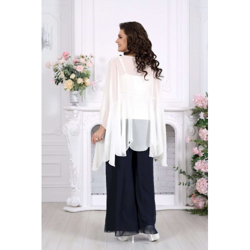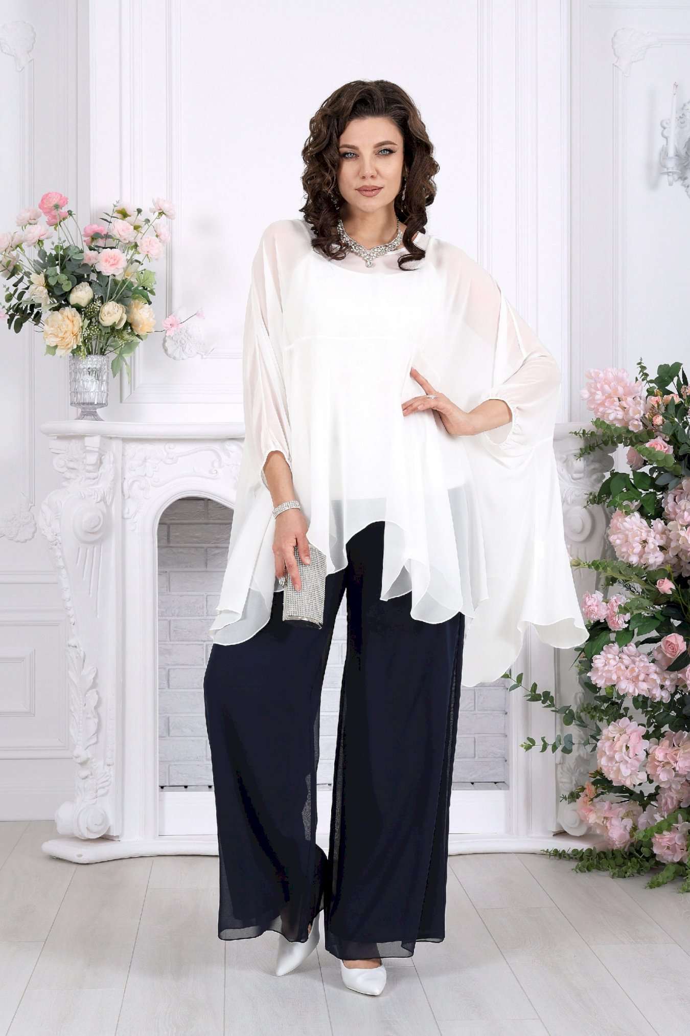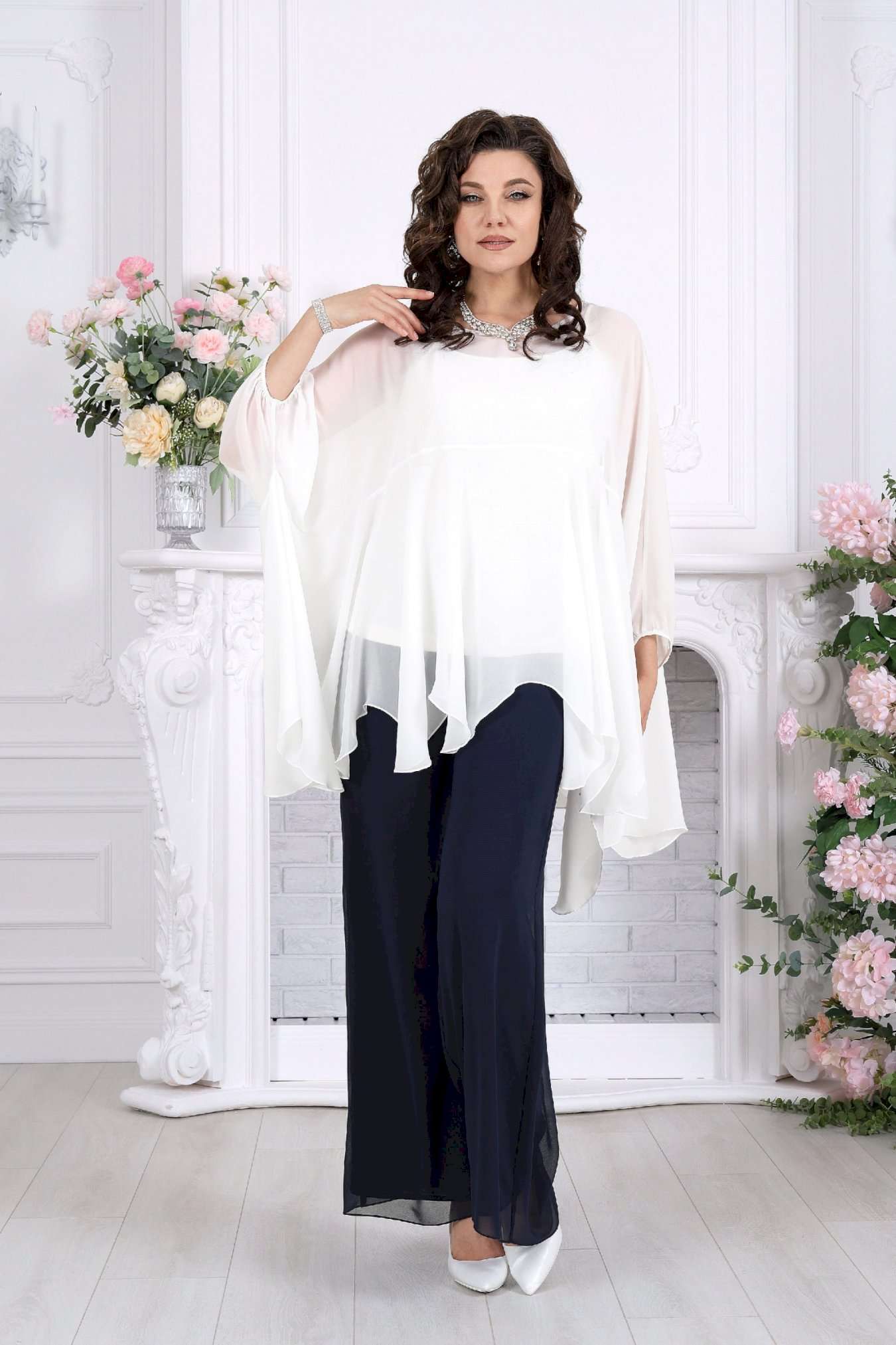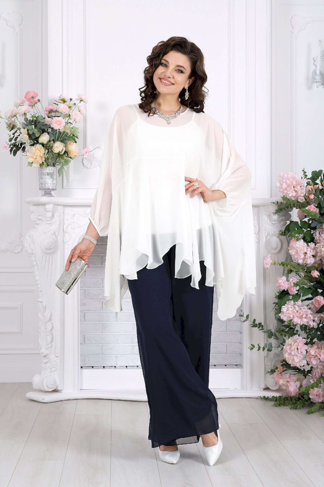 Брючный костюм 3 в 1 — легкость, которая преображает. Этот костюм — про особую эстетику: мягкие линии, воздушные ткани и ощущение свободы в каждом движении. Он создан для женщин, которые ценят комфорт, но не готовы отказываться от эффектного внешнего вида. Полупрозрачная туника словно окутывает силуэт легкой вуалью, добавляя образу загадочности и утонченности. Внутренний топ формирует аккуратную основу, а струящиеся брюки завершают ансамбль, создавая вытянутый, элегантный силуэт. Это тот случай, когда наряд выглядит дорого и сложносочинённо, но ощущается легко и непринужденно. Легкие, воздушные материалы делают комплект идеальным для весенне-летнего сезона. Он не утяжеляет образ, красиво движется при ходьбе и дарит ощущение свободы и уверенности. Комплект брючный 3-х предметный, состоящий из туники, блузки и брюк. Туника оверсайз свободного силуэта, отрезная по линии груди. Рукав цельнокроеный, по низу собран на узкую резинку. Круглый вырез горловины переда и спинки окантован. Низ туники фигурный, обработан швом «флэш». Длина туники –75,0 см (50-58 р-р); длина цельнокроенного рукава с учетом плечевого шва – 57,5 см (50-52 р-р), 59,0 см (54-58 р-р). Блузка-топ прилегающего силуэта, выполнена из вискозного трикотажного полотна. Модель без застежки, без рукавов, на регулируемых по длине узких бретелях. Верхний край переда окантован. Для лучшего прилегания изделия, в подгибку верхнего края спинки протянута эластичная лента. Длина топа (по спинке) – 38,0 см (50-58 р-р). Брюки широкие выполнены из ткани шифон на трикотажной подкладке по всей длине. Модель без стрелок и без застежки. Спереди обработаны наклонные боковые карманы. Для лучшего прилегания по линии талии в притачном поясе предусмотрена эластичная лента, вставленная по всей длине пояса. Длина брюк по боковому (с поясом) -107 см (50-52 р-р), 108 см (54-58 р-р)