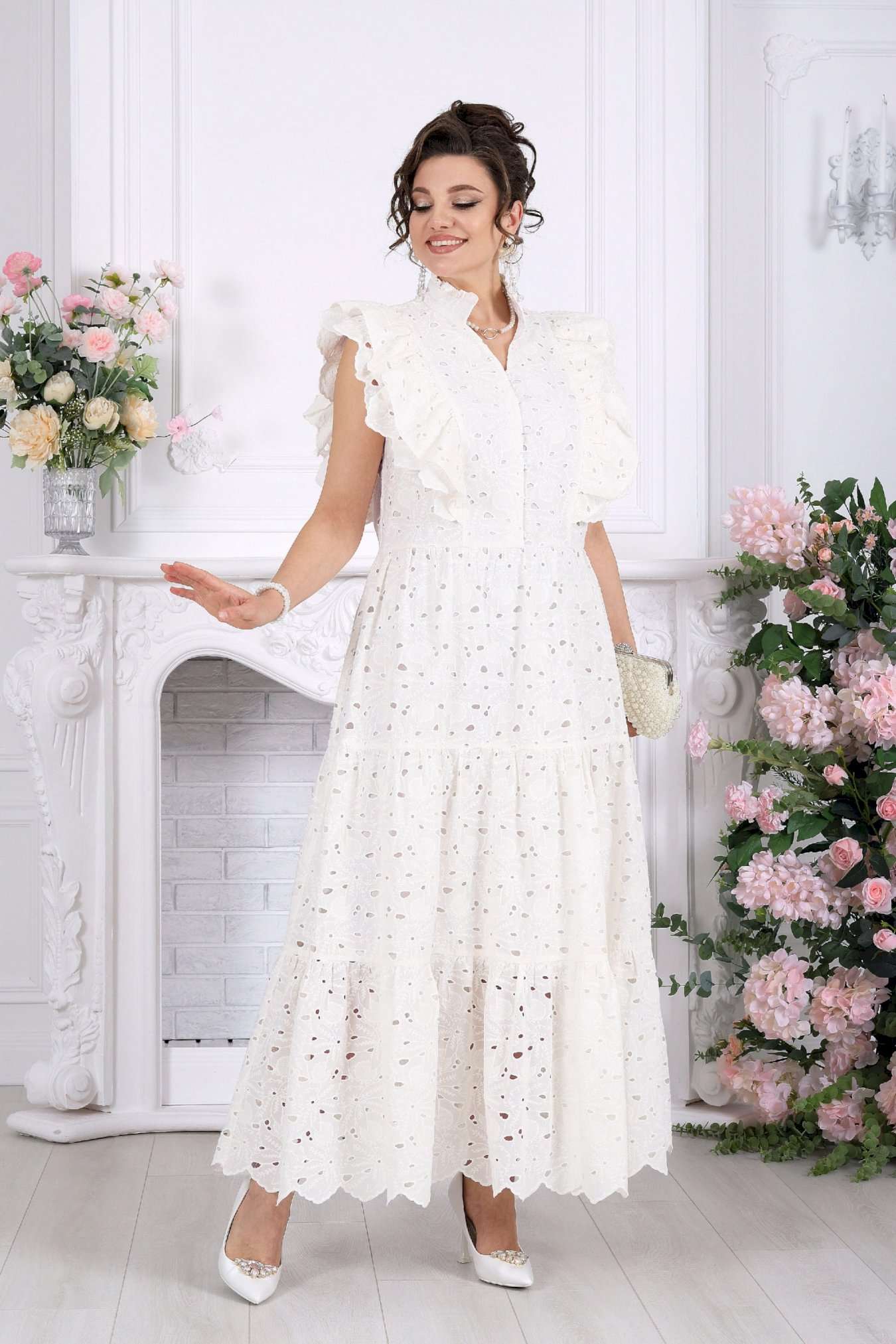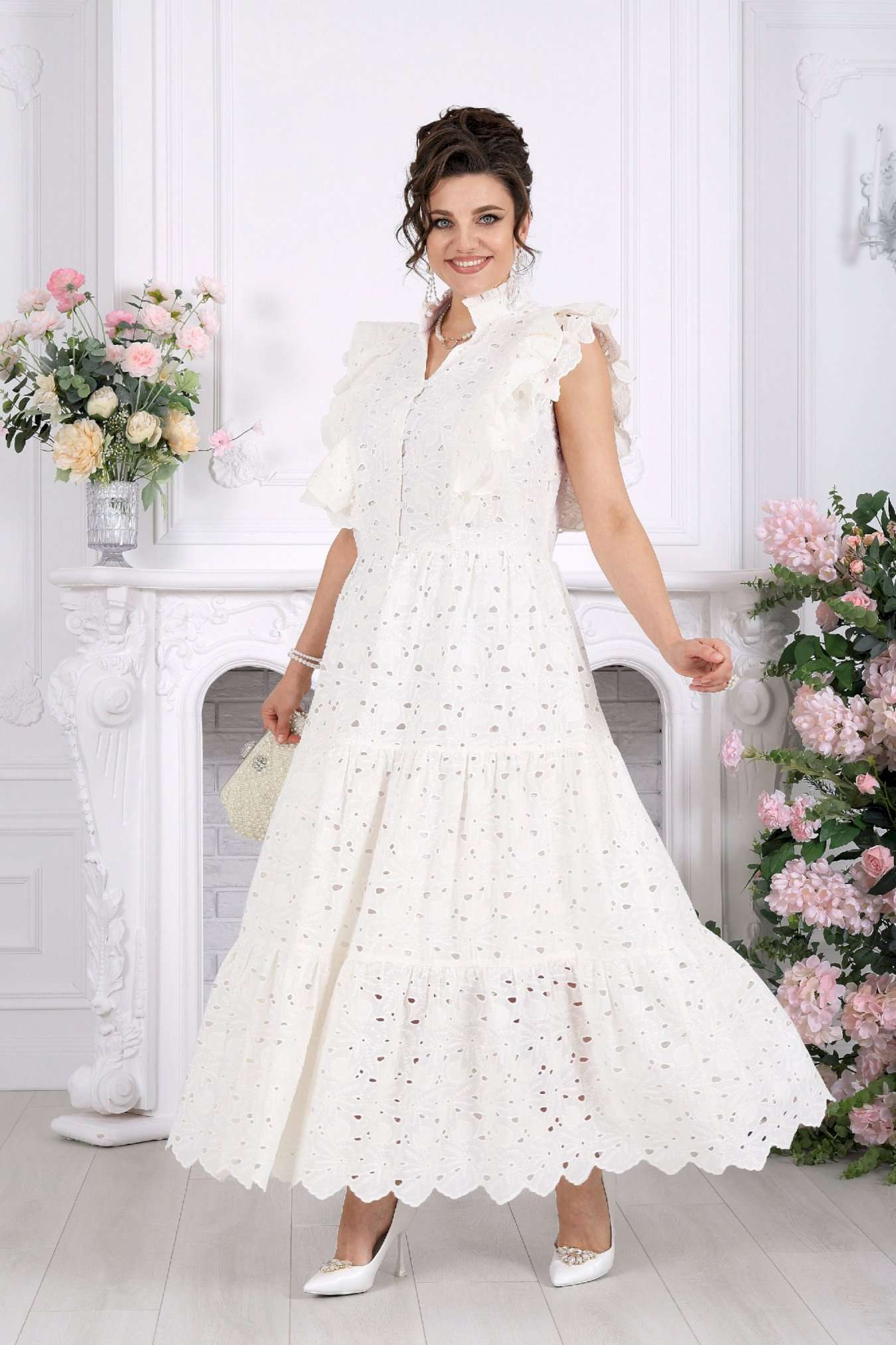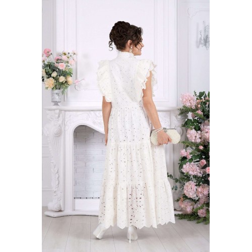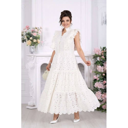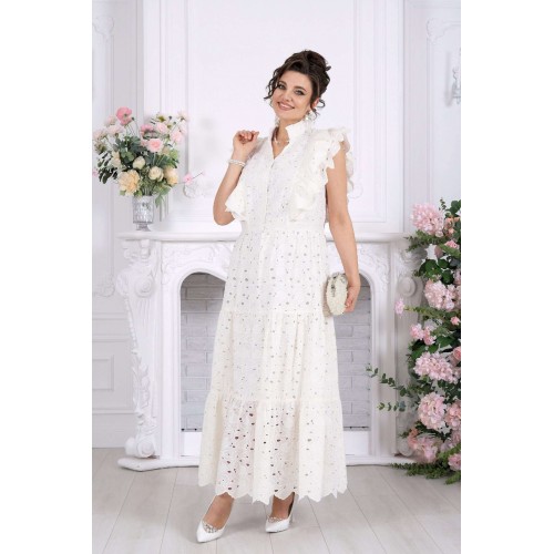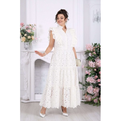 Платье, в котором вы — главное украшение вечера. Это не просто платье — это готовый праздничный образ. Эффектное хлопковое «ришелье» с ажурным рисунком создаёт ощущение лёгкости и торжественности, словно вы уже на особом событии, где каждый взгляд прикован к вам. Изысканные воланы, утончённые линии и фактура ткани делают модель по-настоящему нарядной. Оно не требует сложных сочетаний — достаточно добавить украшения, и вы готовы к любому празднику. Хлопковое «ришелье» — это всегда про статус и эстетику. Ажурный рисунок добавляет глубины образу, а натуральная подкладка обеспечивает комфорт даже на длительных мероприятиях. Платье женское из хлопка «ришелье», отрезное по линии талии, с лифом прилегающего силуэта и юбкой. Модель на х/б подкладке, без рукавов и плечевых накладок. Спинка и полочка с рельефными швами, направленными от пройм до талии, вставленными в них двумя воланами, присборенными по всей длине. Нижний волан широкий с фестоном по краю, верхний волан с обработанным краем. Горловина платья с V-образным вырезом по переду, оформлена воротником стойкой с присборенной рюшей по верхнему срезу воротника. По полочке оформлена центральная застёжка на 6 навесных петель и 6 пуговиц. В левом боковом шве застёжка на потайную тесьму-«молнию» (35 см). Юбка платья свободного кроя состоит из трёх присборенных воланов, по краю нижнего волана фестон. Длина платья по среднему шву спинки - см; длина платья по среднему шву спинки (от талии) – 139 см (50-58 р-р).